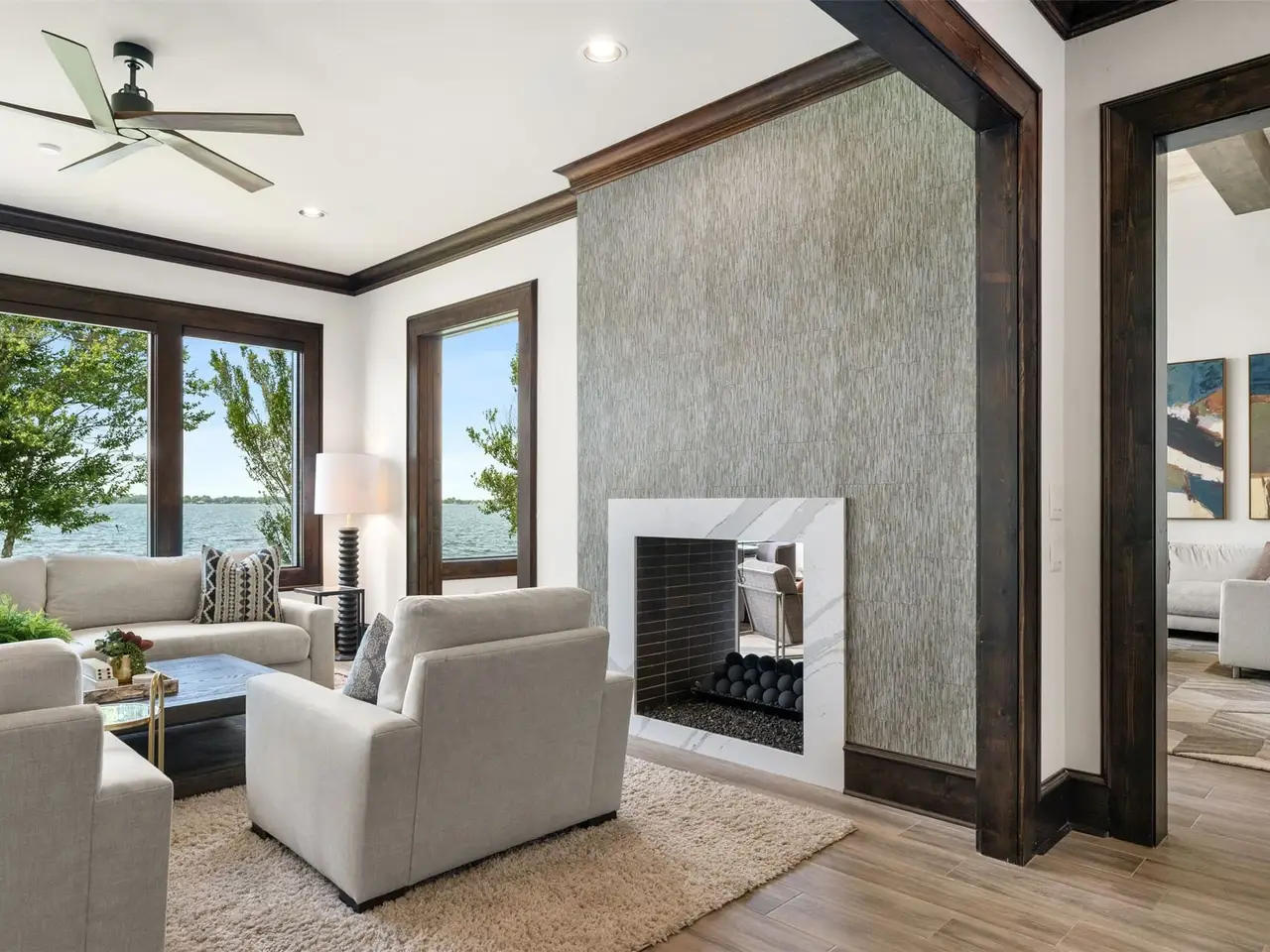 Waterside lounging area with fireplace