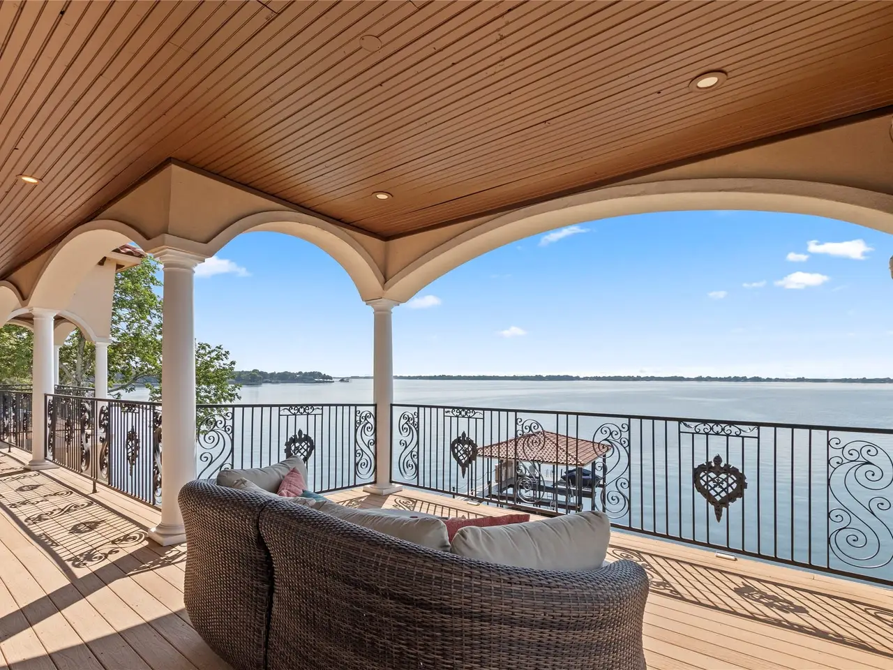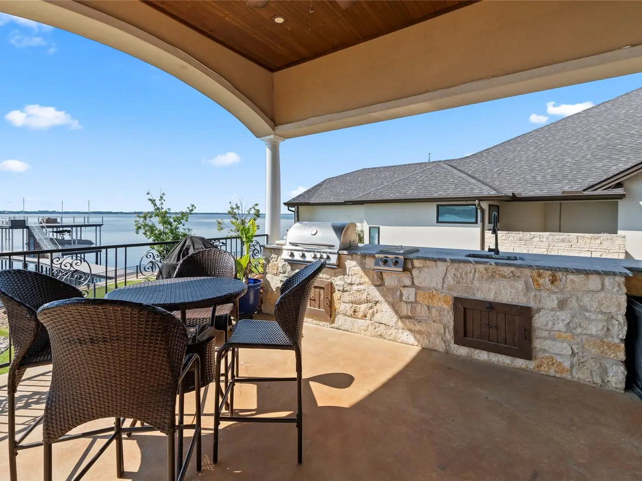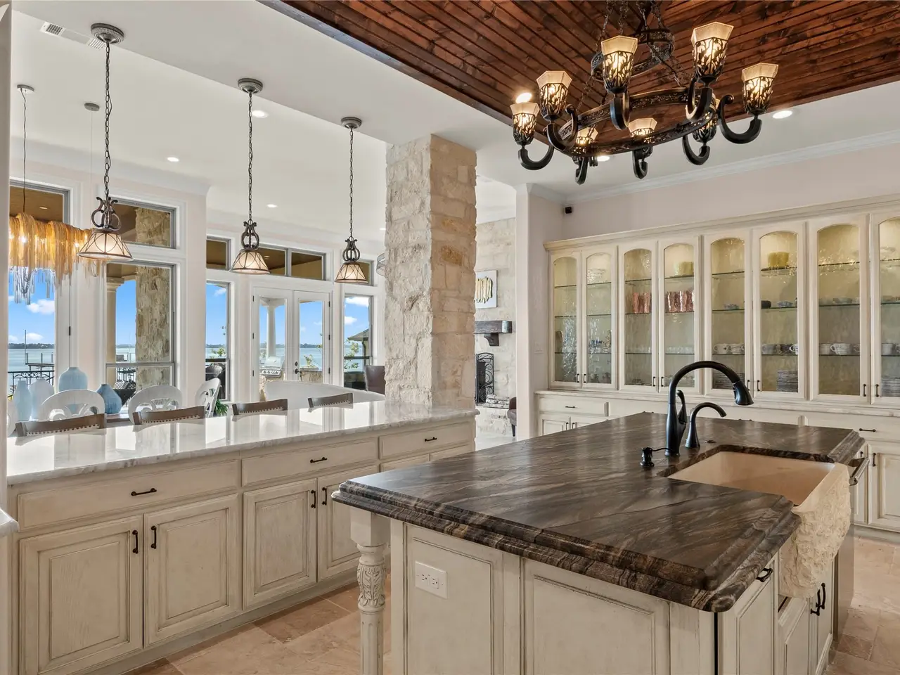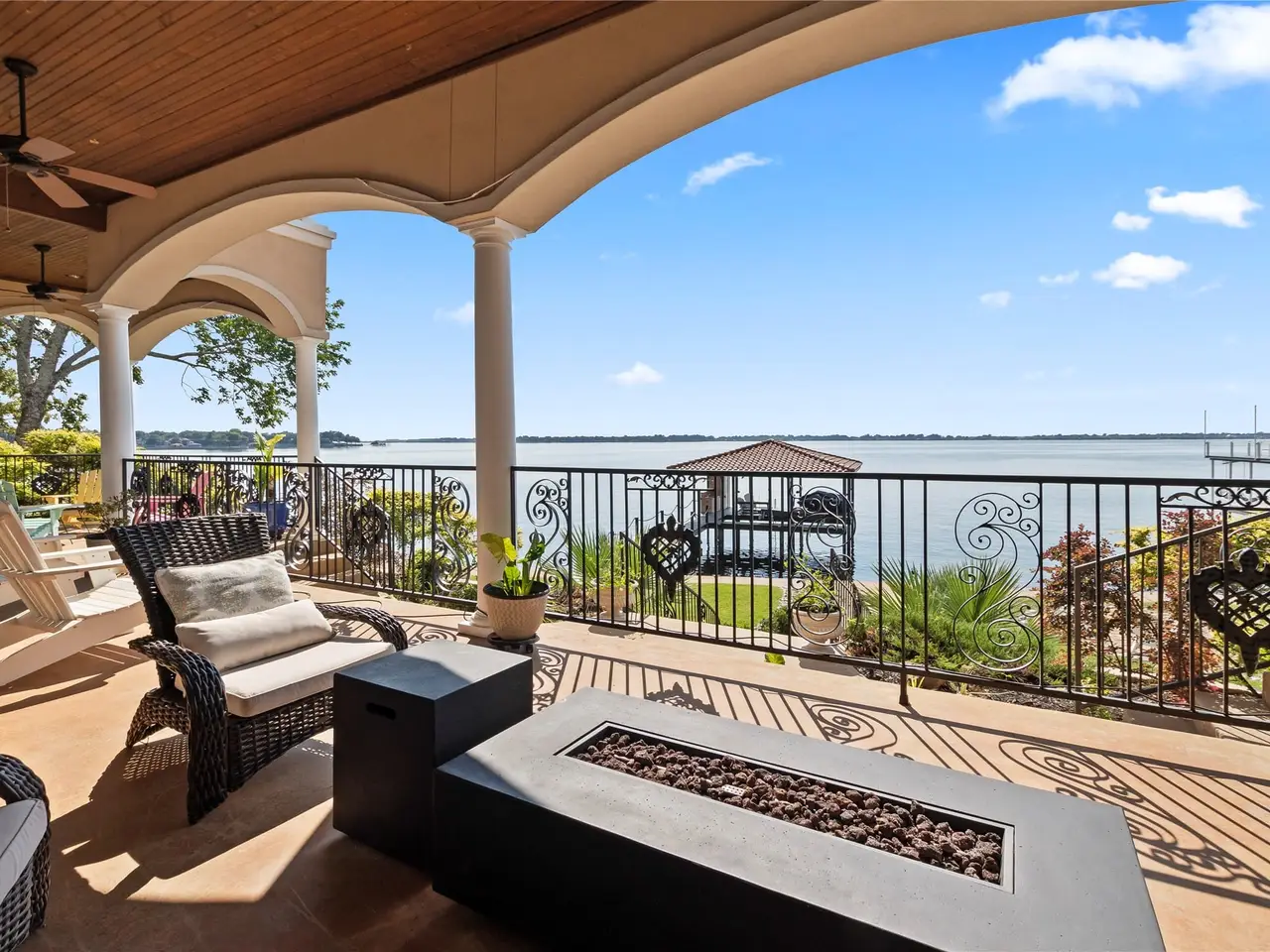 This stunning 2018 home, inspired by the timeless elegance of a Tuscan villa nestled in the foothills of Italy, offers 5,570 sq ft of refined waterfront living on a half-acre lot with 94 feet of open water frontage in the prestigious Pinnacle Golf Club at Cedar Creek Lake. Located in one of the most sought-after areas of the community, it's within walking distance to the clubhouse, restaurant, pool, and fitness center - and perfectly positioned next to the annual July 4 Pinnacle fireworks show for front-row lakeside views. Designed for both luxury and livability, the home features 5 bedrooms, 6 baths, 3 living areas, an office, exercise room, and a 3-car garage. A grand foyer welcomes you with a winding staircase, inlaid tile, chandelier, and sweeping lake views that instantly transport you to a Mediterranean retreat. The main living area is anchored by a stone fireplace and wet bar, flowing into a dining space with butlers pantry into a second spacious living area. The gourmet kitchen boasts a Thermador 6-burner gas range with pot filler framed in stone, Thermador fridge, custom cabinetry, and walk-in pantry. The waterside primary suite features soaring ceilings, plantation shutters, dual vanities, jetted soaking tub, walk-in shower, and two spacious closets. A private office and two full guest baths, including one with outdoor access, complete the main floor. Upstairs offers four bedrooms - two with en suite baths - and a private guest suite with its own living area. A bonus room with wet bar and balcony, plus an exercise room and full bath, create more space to unwind. Outdoor living includes a firepit, full-length balcony with composite decking, and kitchen with griddle and sink. The boathouse offers a boat slip, dual PWC lifts, and a covered seating area. Ownership includes social membership with clubhouse dining, pool, fitness center, tennis and pickleball; golf memberships available separately