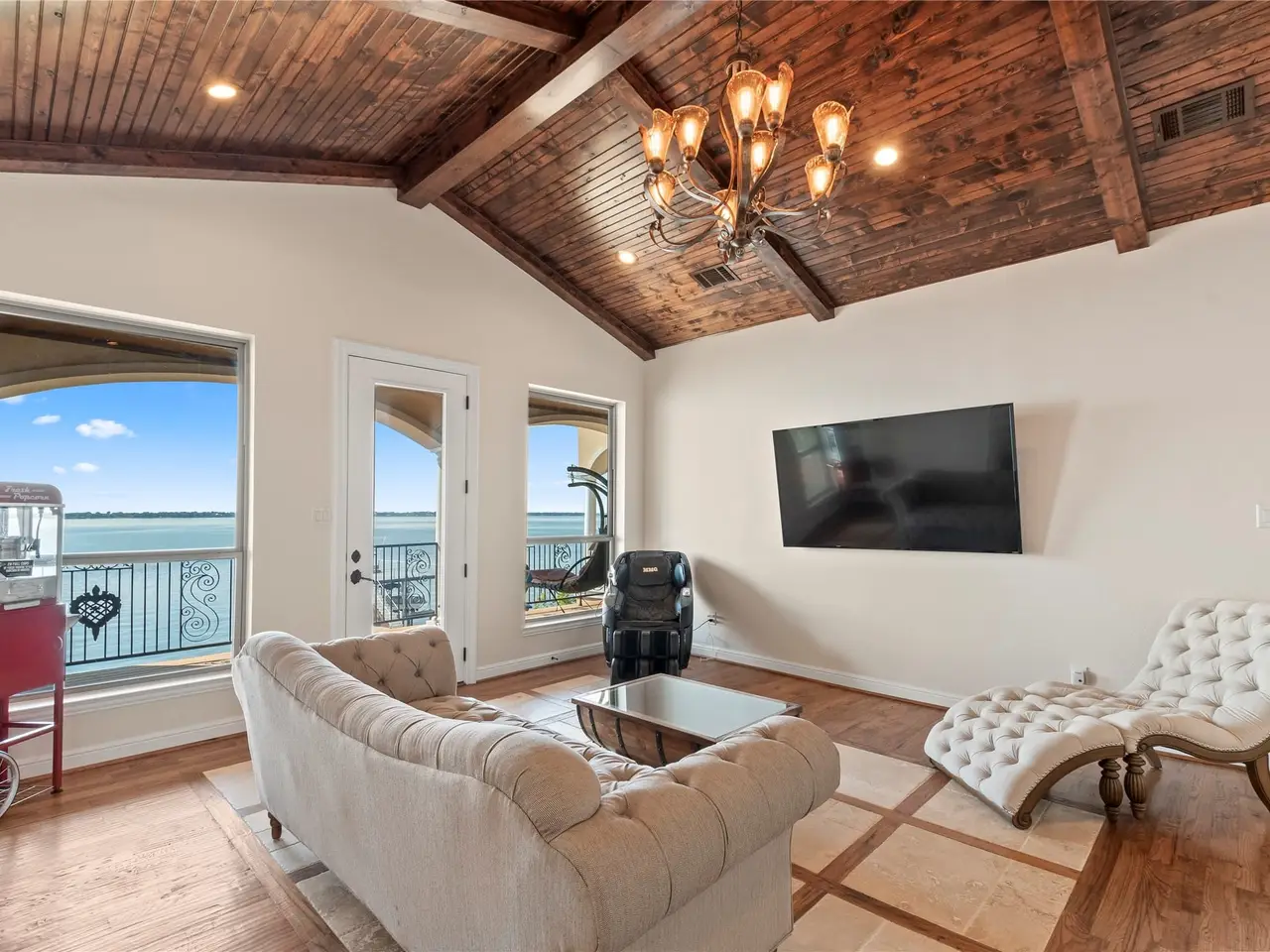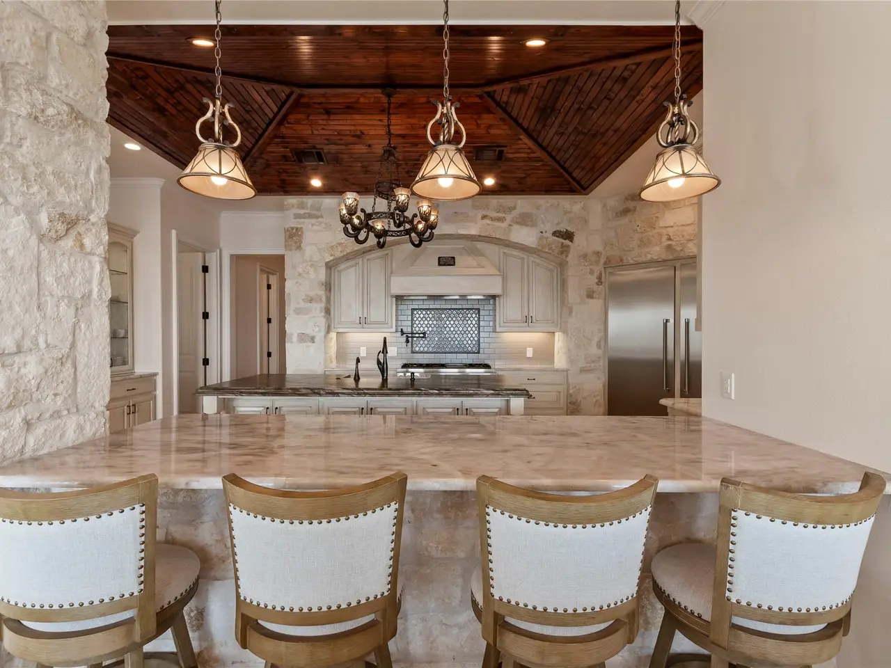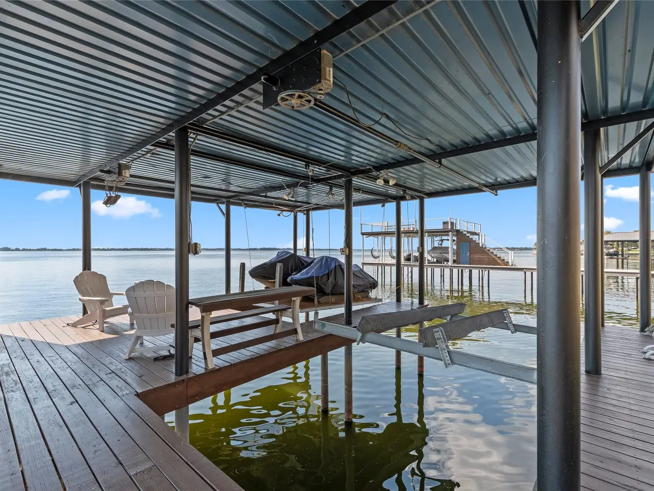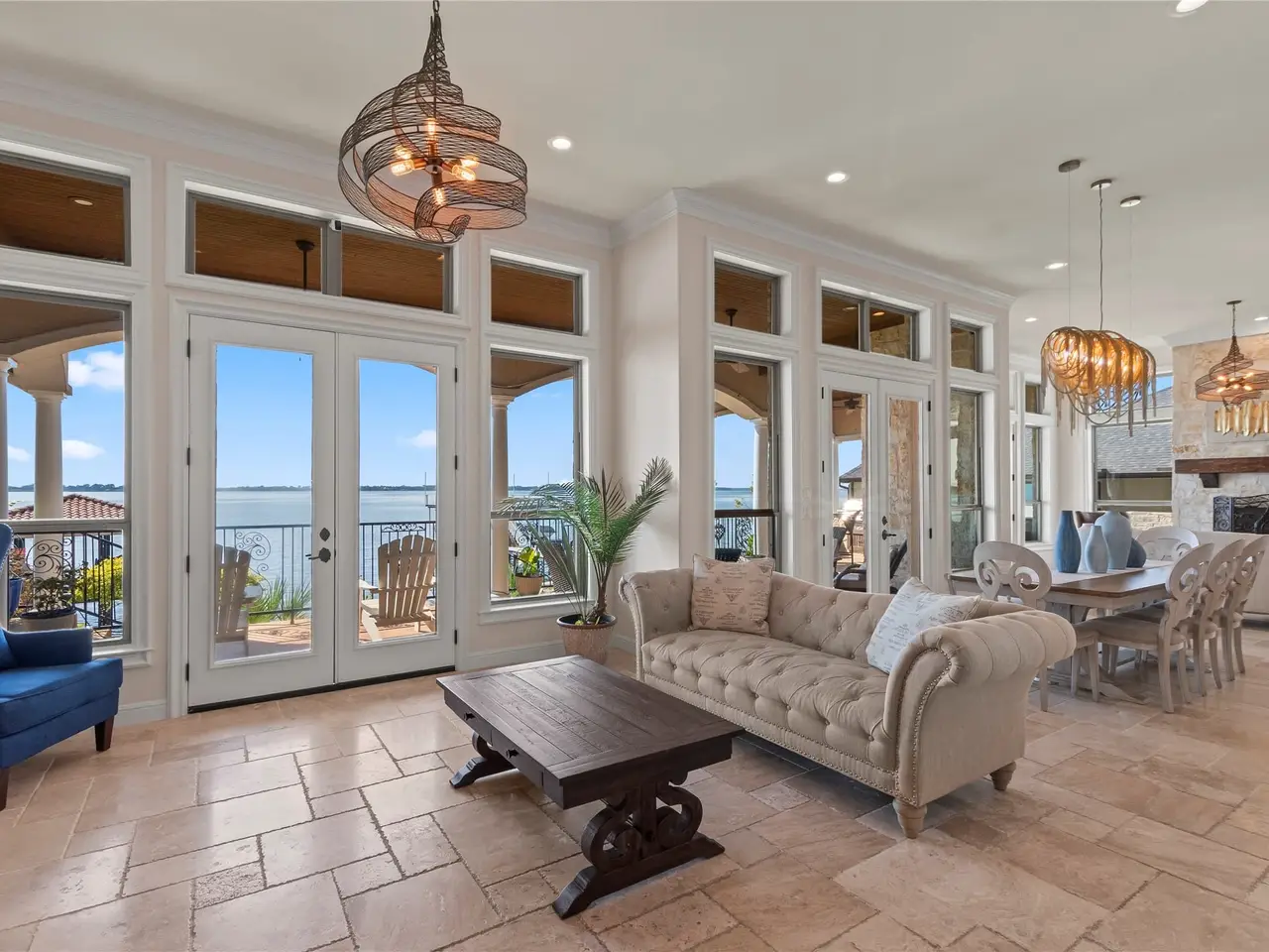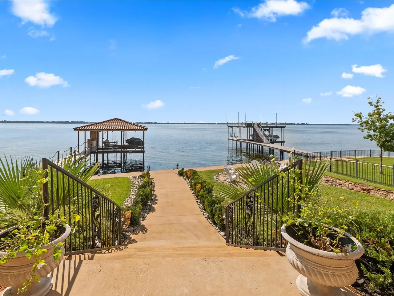 This stunning 2018 home, inspired by the timeless elegance of a Tuscan villa nestled in the foothills of Italy, offers 5,570 sq ft of refined waterfront living on a half-acre lot with 94 feet of open water frontage in the prestigious Pinnacle Golf Club at Cedar Creek Lake. Located in one of the most sought-after areas of the community, it's within walking distance to the clubhouse, restaurant, pool, and fitness center - and perfectly positioned next to the annual July 4 Pinnacle fireworks show for front-row lakeside views. Designed for both luxury and livability, the home features 5 bedrooms, 6 baths, 3 living areas, an office, exercise room, and a 3-car garage. A grand foyer welcomes you with a winding staircase, inlaid tile, chandelier, and sweeping lake views that instantly transport you to a Mediterranean retreat. The main living area is anchored by a stone fireplace and wet bar, flowing into a dining space with butlers pantry into a second spacious living area. The gourmet kitchen boasts a Thermador 6-burner gas range with pot filler framed in stone, Thermador fridge, custom cabinetry, and walk-in pantry. The waterside primary suite features soaring ceilings, plantation shutters, dual vanities, jetted soaking tub, walk-in shower, and two spacious closets. A private office and two full guest baths, including one with outdoor access, complete the main floor. Upstairs offers four bedrooms - two with en suite baths - and a private guest suite with its own living area. A bonus room with wet bar and balcony, plus an exercise room and full bath, create more space to unwind. Outdoor living includes a firepit, full-length balcony with composite decking, and kitchen with griddle and sink. The boathouse offers a boat slip, dual PWC lifts, and a covered seating area. Ownership includes social membership with clubhouse dining, pool, fitness center, tennis and pickleball; golf memberships available separately