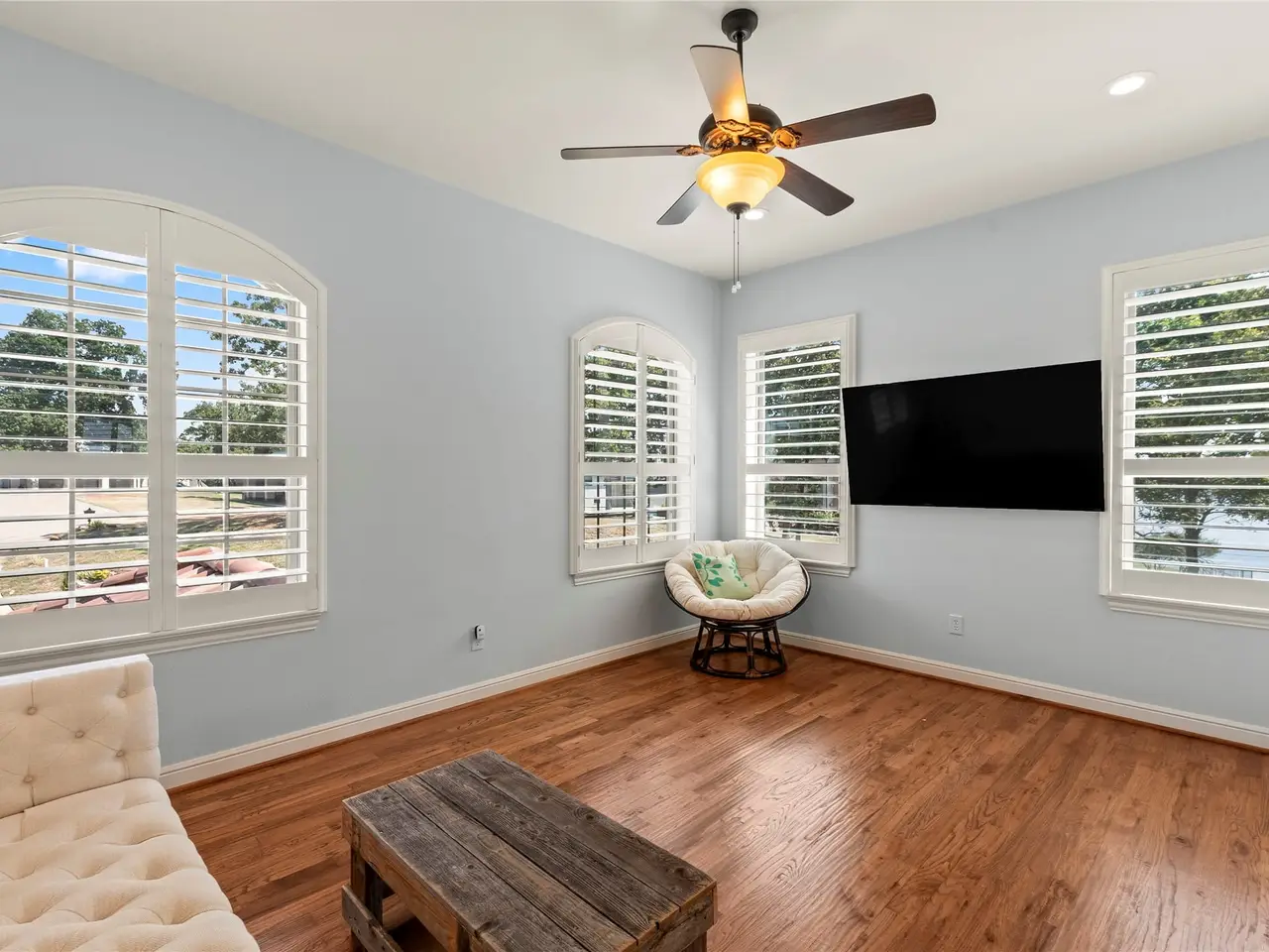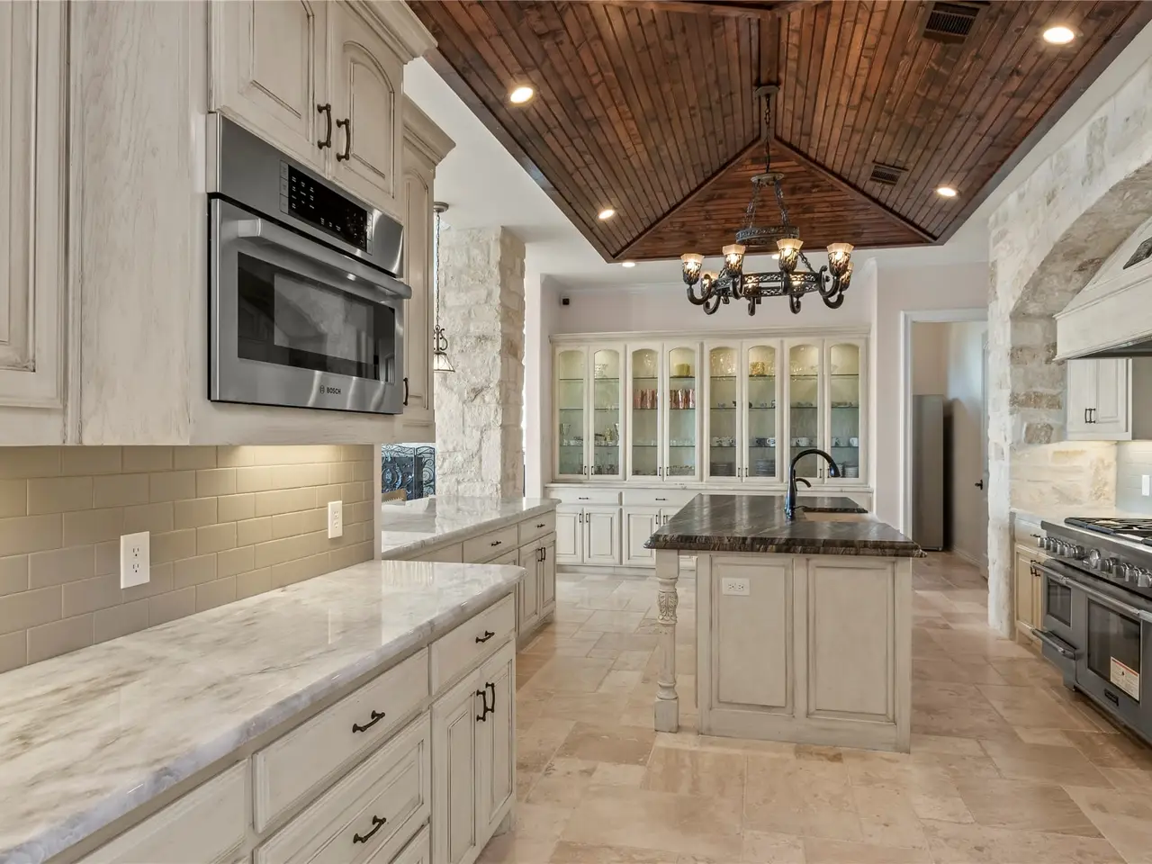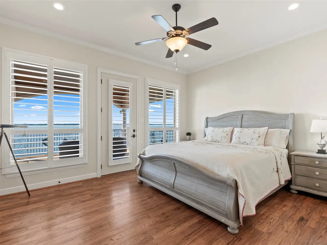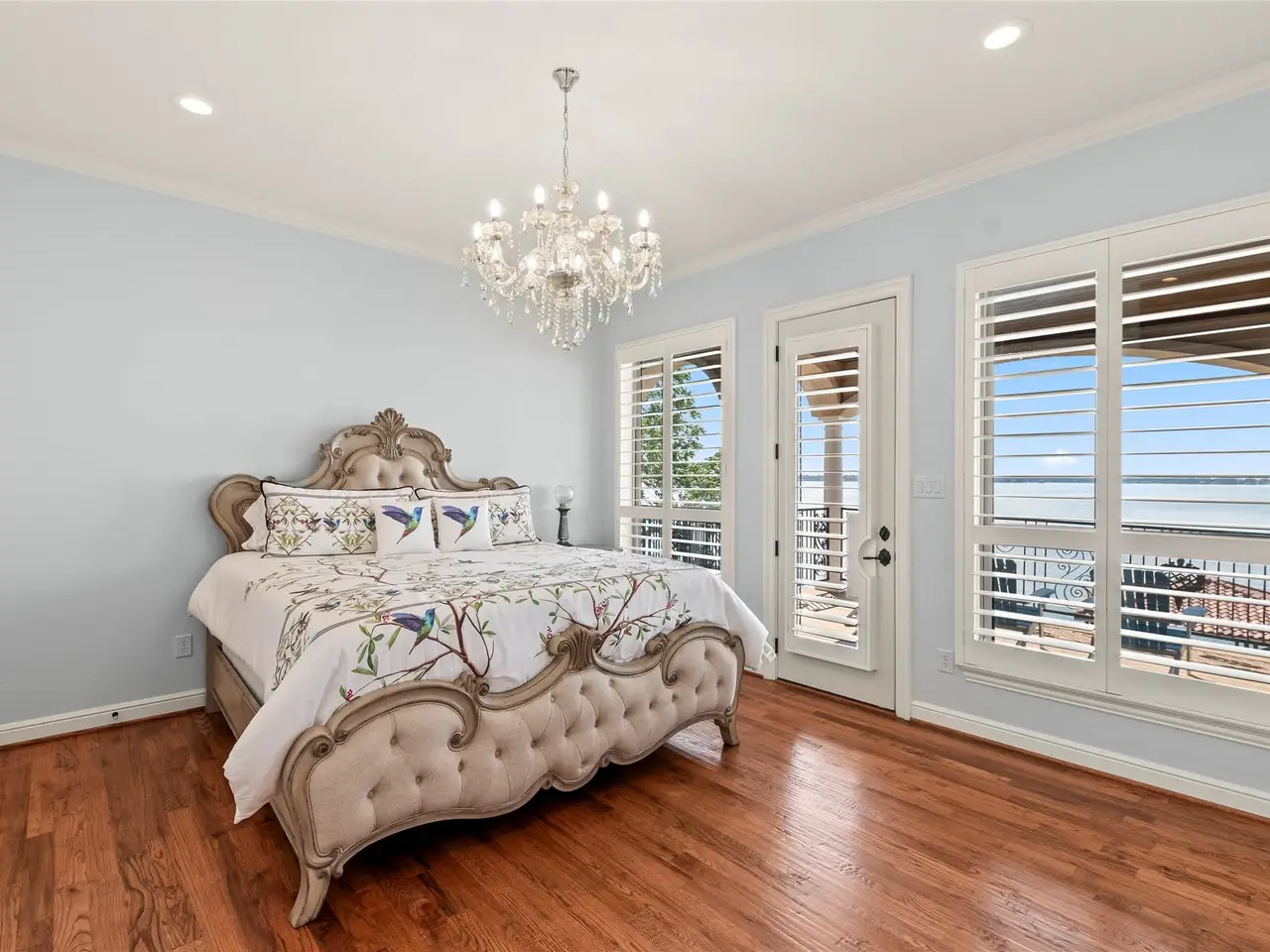 This stunning 2018 home, inspired by the timeless elegance of a Tuscan villa nestled in the foothills of Italy, offers 5,570 sq ft of refined waterfront living on a half-acre lot with 94 feet of open water frontage in the prestigious Pinnacle Golf Club at Cedar Creek Lake. Located in one of the most sought-after areas of the community, it's within walking distance to the clubhouse, restaurant, pool, and fitness center - and perfectly positioned next to the annual July 4 Pinnacle fireworks show for front-row lakeside views. Designed for both luxury and livability, the home features 5 bedrooms, 6 baths, 3 living areas, an office, exercise room, and a 3-car garage. A grand foyer welcomes you with a winding staircase, inlaid tile, chandelier, and sweeping lake views that instantly transport you to a Mediterranean retreat. The main living area is anchored by a stone fireplace and wet bar, flowing into a dining space with butlers pantry into a second spacious living area. The gourmet kitchen boasts a Thermador 6-burner gas range with pot filler framed in stone, Thermador fridge, custom cabinetry, and walk-in pantry. The waterside primary suite features soaring ceilings, plantation shutters, dual vanities, jetted soaking tub, walk-in shower, and two spacious closets. A private office and two full guest baths, including one with outdoor access, complete the main floor. Upstairs offers four bedrooms - two with en suite baths - and a private guest suite with its own living area. A bonus room with wet bar and balcony, plus an exercise room and full bath, create more space to unwind. Outdoor living includes a firepit, full-length balcony with composite decking, and kitchen with griddle and sink. The boathouse offers a boat slip, dual PWC lifts, and a covered seating area. Ownership includes social membership with clubhouse dining, pool, fitness center, tennis and pickleball; golf memberships available separately