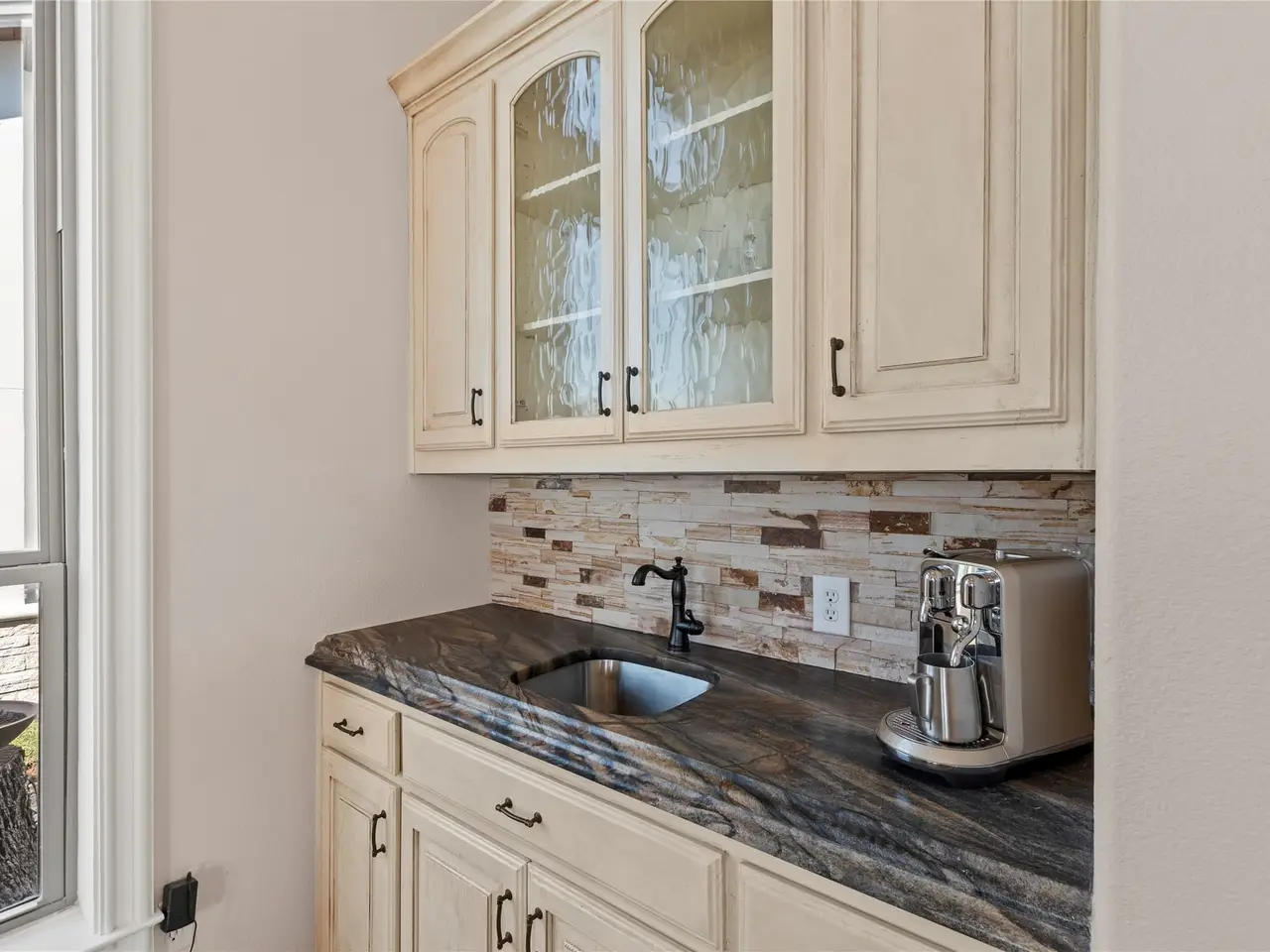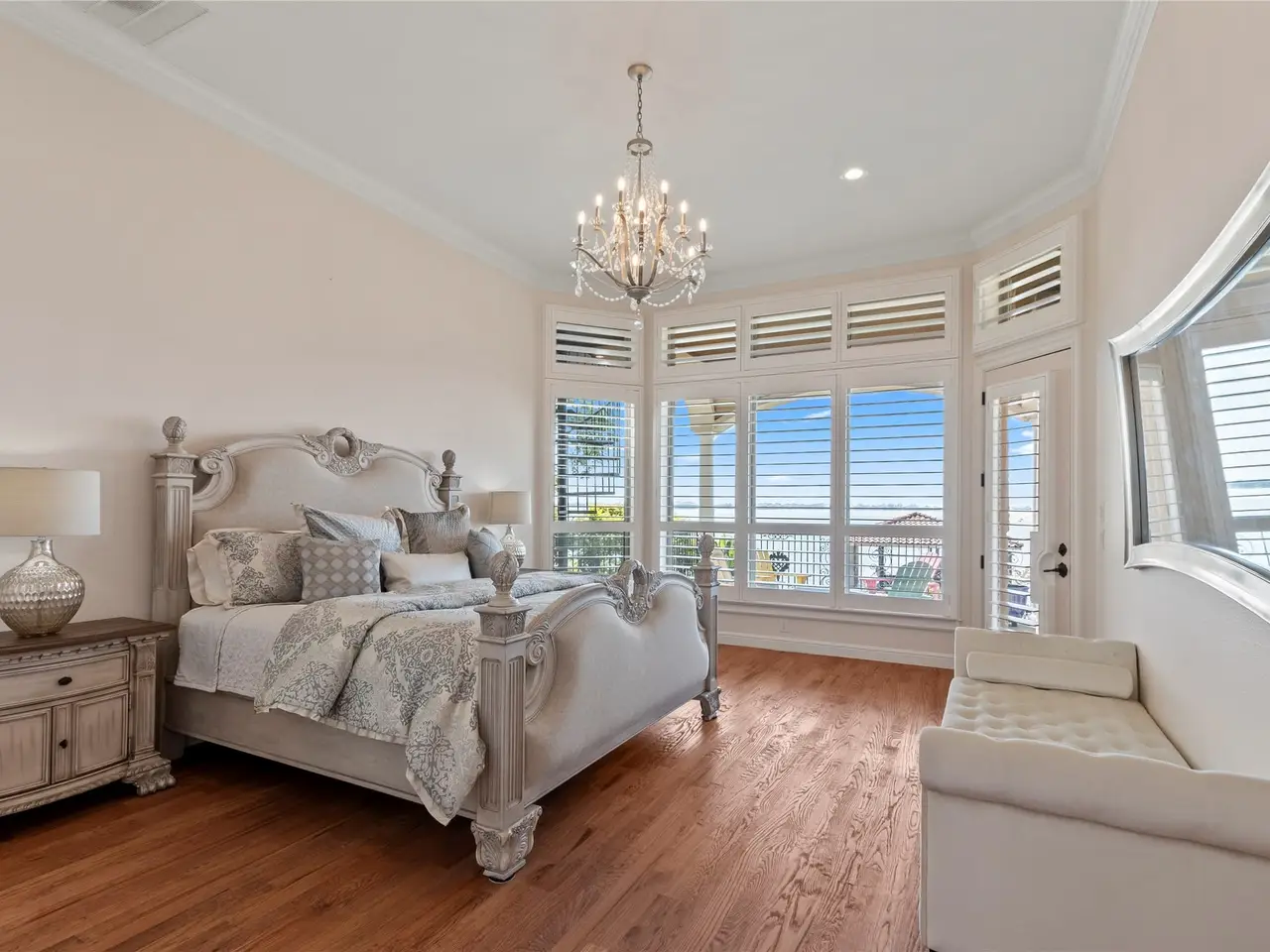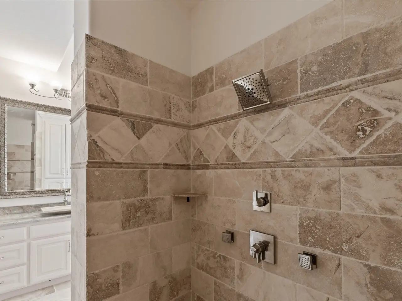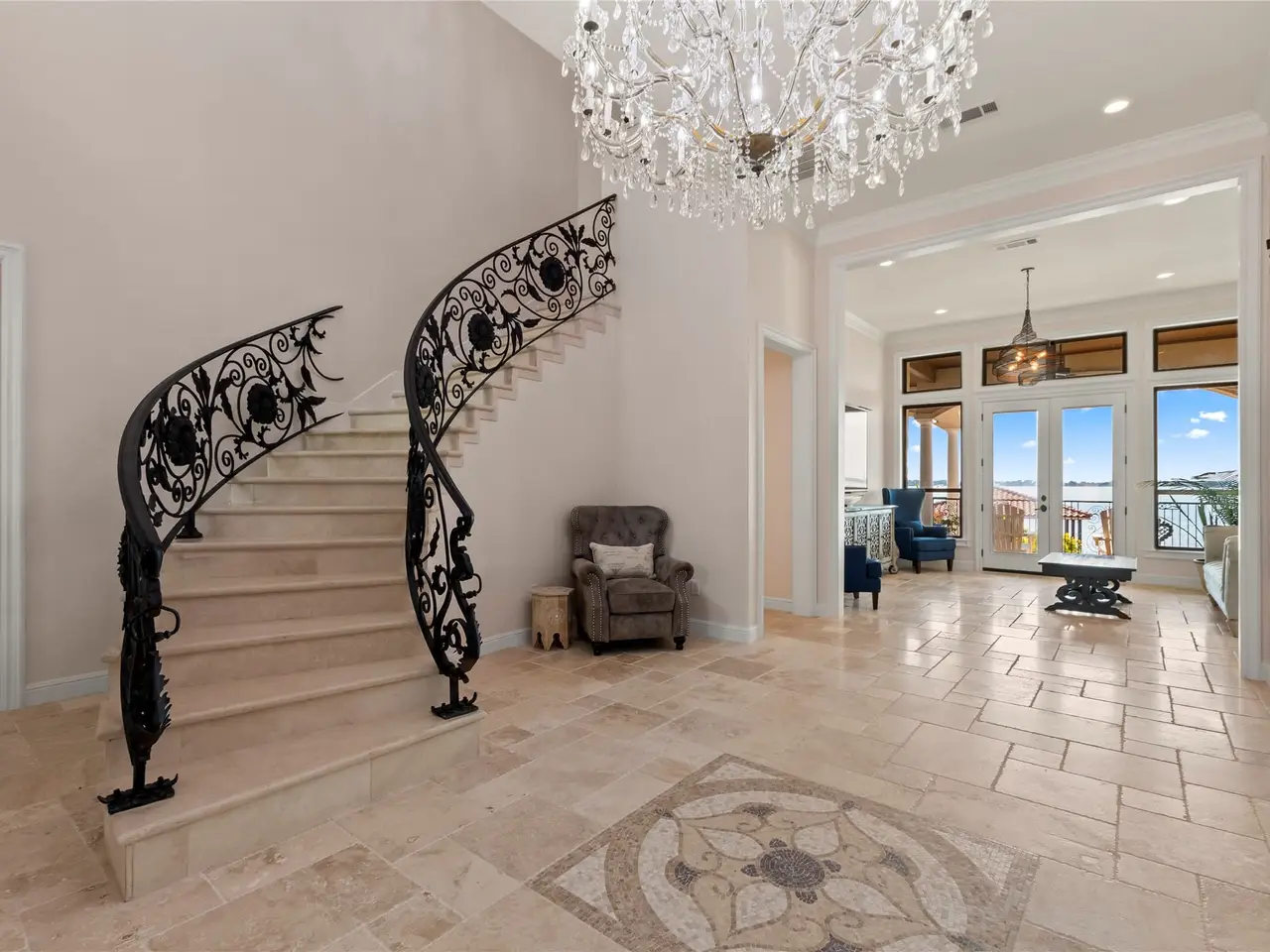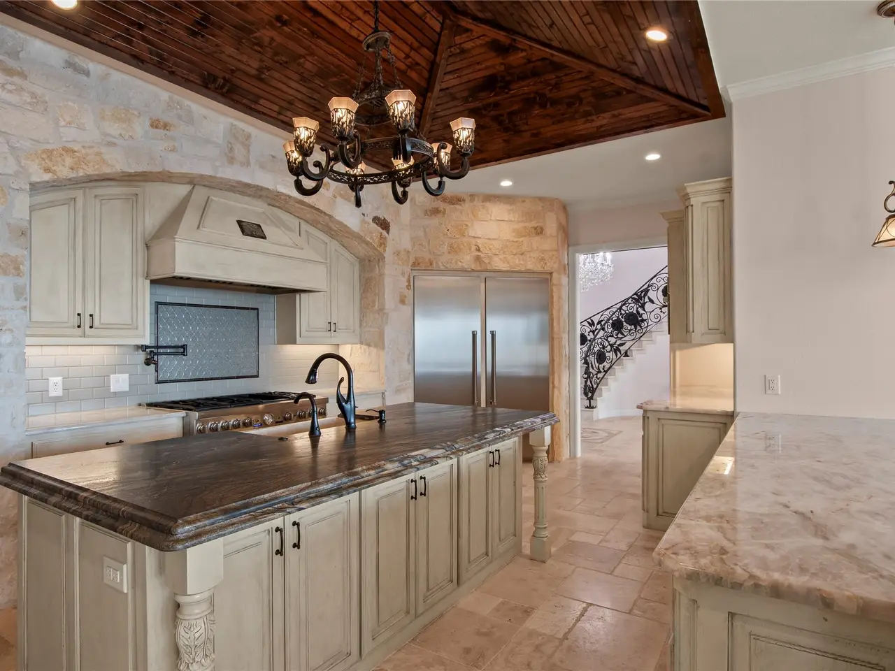 This stunning 2018 home, inspired by the timeless elegance of a Tuscan villa nestled in the foothills of Italy, offers 5,570 sq ft of refined waterfront living on a half-acre lot with 94 feet of open water frontage in the prestigious Pinnacle Golf Club at Cedar Creek Lake. Located in one of the most sought-after areas of the community, it's within walking distance to the clubhouse, restaurant, pool, and fitness center - and perfectly positioned next to the annual July 4 Pinnacle fireworks show for front-row lakeside views. Designed for both luxury and livability, the home features 5 bedrooms, 6 baths, 3 living areas, an office, exercise room, and a 3-car garage. A grand foyer welcomes you with a winding staircase, inlaid tile, chandelier, and sweeping lake views that instantly transport you to a Mediterranean retreat. The main living area is anchored by a stone fireplace and wet bar, flowing into a dining space with butlers pantry into a second spacious living area. The gourmet kitchen boasts a Thermador 6-burner gas range with pot filler framed in stone, Thermador fridge, custom cabinetry, and walk-in pantry. The waterside primary suite features soaring ceilings, plantation shutters, dual vanities, jetted soaking tub, walk-in shower, and two spacious closets. A private office and two full guest baths, including one with outdoor access, complete the main floor. Upstairs offers four bedrooms - two with en suite baths - and a private guest suite with its own living area. A bonus room with wet bar and balcony, plus an exercise room and full bath, create more space to unwind. Outdoor living includes a firepit, full-length balcony with composite decking, and kitchen with griddle and sink. The boathouse offers a boat slip, dual PWC lifts, and a covered seating area. Ownership includes social membership with clubhouse dining, pool, fitness center, tennis and pickleball; golf memberships available separately