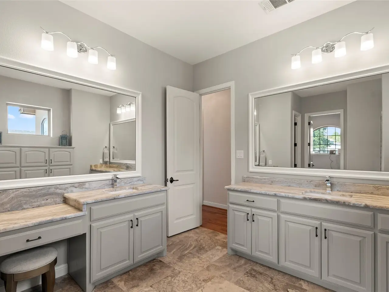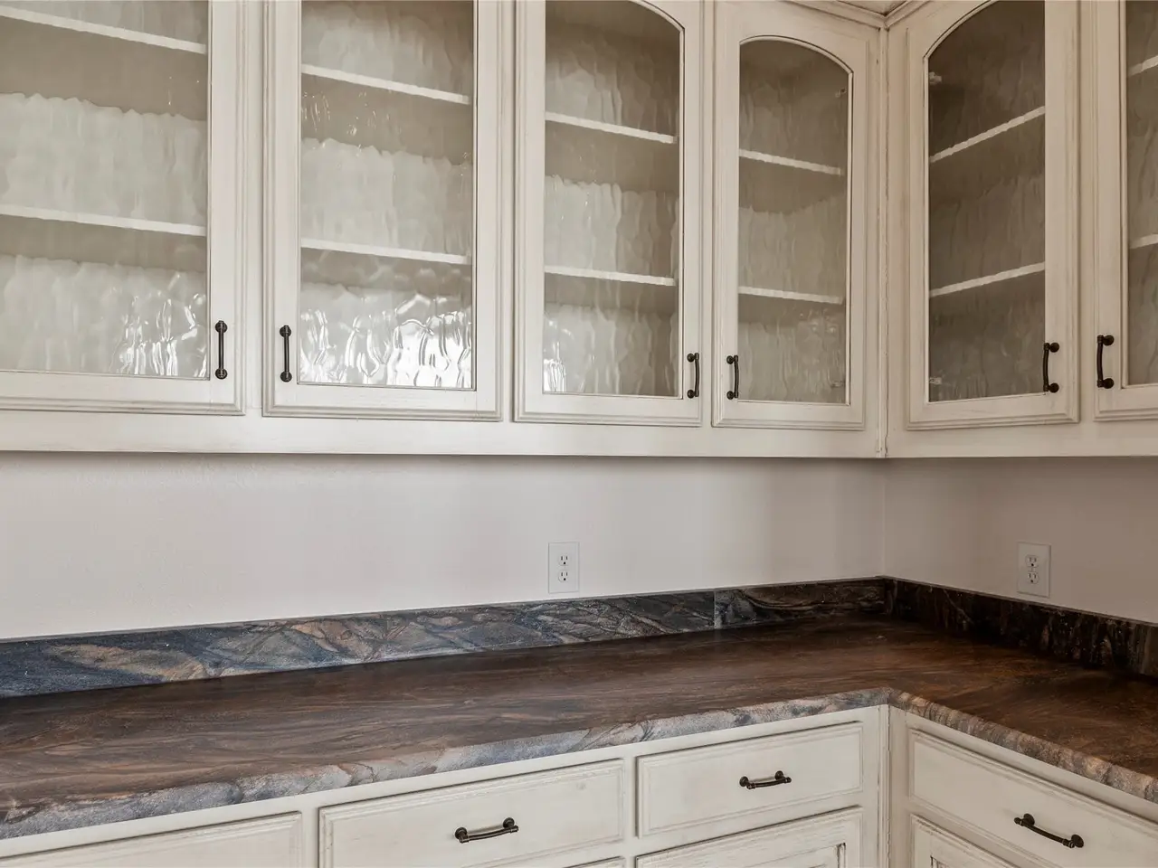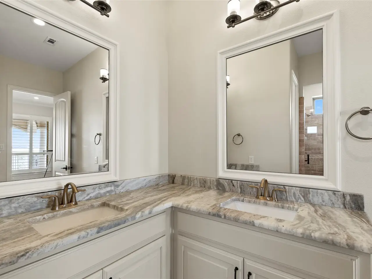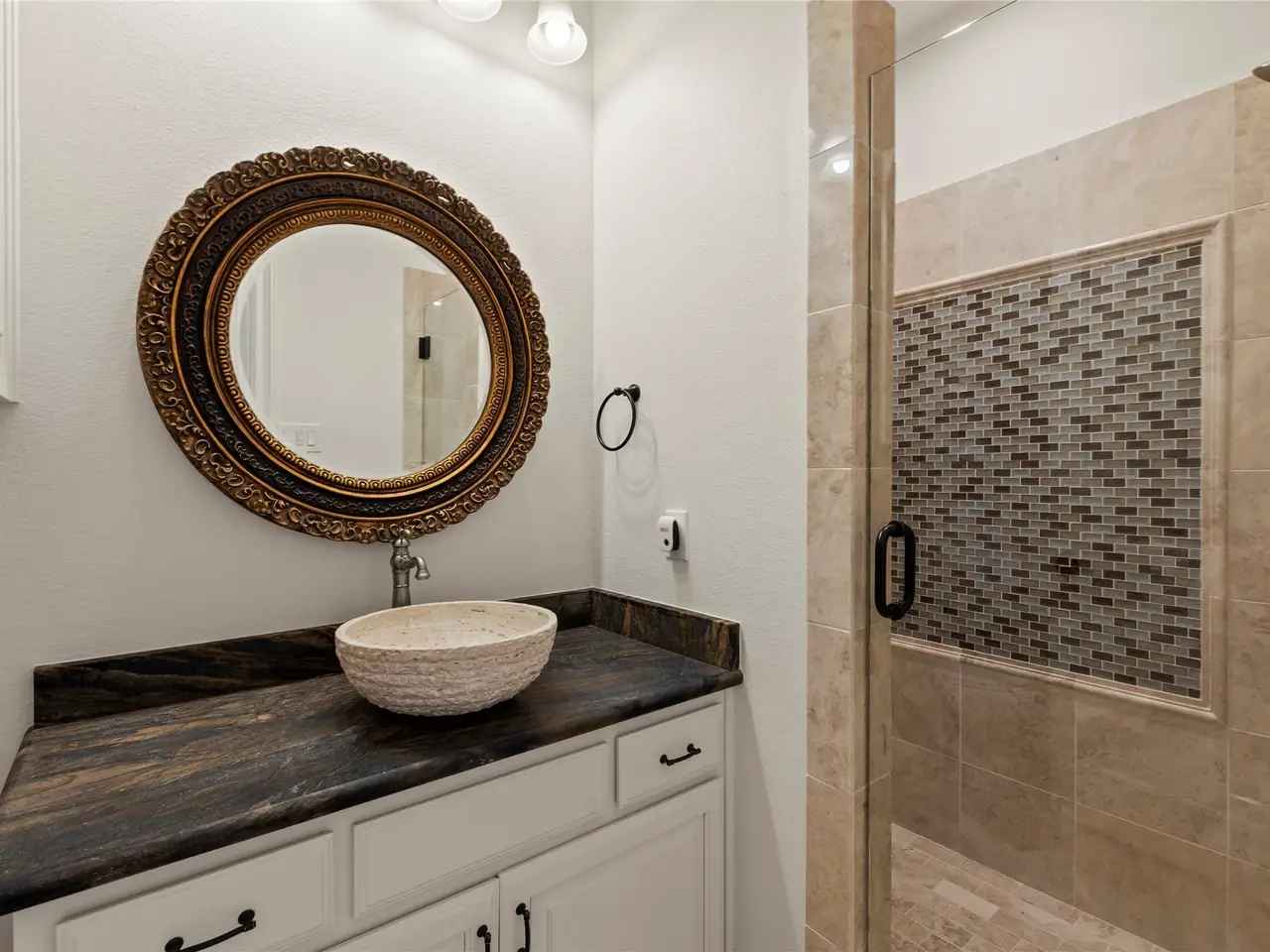 This stunning 2018 home, inspired by the timeless elegance of a Tuscan villa nestled in the foothills of Italy, offers 5,570 sq ft of refined waterfront living on a half-acre lot with 94 feet of open water frontage in the prestigious Pinnacle Golf Club at Cedar Creek Lake. Located in one of the most sought-after areas of the community, it's within walking distance to the clubhouse, restaurant, pool, and fitness center - and perfectly positioned next to the annual July 4 Pinnacle fireworks show for front-row lakeside views. Designed for both luxury and livability, the home features 5 bedrooms, 6 baths, 3 living areas, an office, exercise room, and a 3-car garage. A grand foyer welcomes you with a winding staircase, inlaid tile, chandelier, and sweeping lake views that instantly transport you to a Mediterranean retreat. The main living area is anchored by a stone fireplace and wet bar, flowing into a dining space with butlers pantry into a second spacious living area. The gourmet kitchen boasts a Thermador 6-burner gas range with pot filler framed in stone, Thermador fridge, custom cabinetry, and walk-in pantry. The waterside primary suite features soaring ceilings, plantation shutters, dual vanities, jetted soaking tub, walk-in shower, and two spacious closets. A private office and two full guest baths, including one with outdoor access, complete the main floor. Upstairs offers four bedrooms - two with en suite baths - and a private guest suite with its own living area. A bonus room with wet bar and balcony, plus an exercise room and full bath, create more space to unwind. Outdoor living includes a firepit, full-length balcony with composite decking, and kitchen with griddle and sink. The boathouse offers a boat slip, dual PWC lifts, and a covered seating area. Ownership includes social membership with clubhouse dining, pool, fitness center, tennis and pickleball; golf memberships available separately
