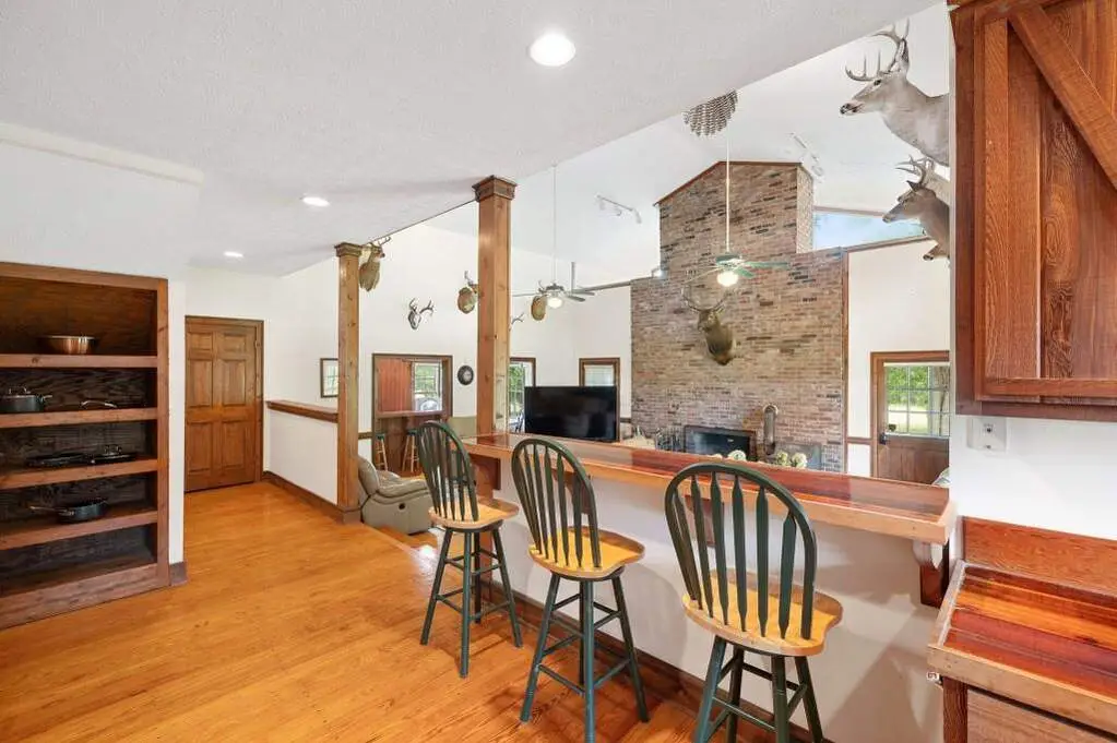 An idyllic lodge with over 82.59 heavily wooded acres of abundant deer hunting and timbering opportunities. Enter the gated property onto a well-maintained grassy lawn with ample parking space among mature, leafy trees. Take a few steps up to the home's wrap-around back porch where an outdoor grill and porch swing have been the popular spaces for overlooking family fun, country weddings, and after-the-hunt dinners on the giant lawn. From the porch, enter the great room with gleaming hardwood floors, high-beamed, two-story ceilings, a huge brick fireplace, a dining area, a wet bar, and game table area. Take one step up to the nearby kitchen which overlooks the great room and has a breakfast counter, stained cabinets, highly-shellacked wooden countertops, and open shelving. Additional rooms on the main level are three spacious bedrooms and one full bath located off a long hall directed toward the property's front door on one end and the kitchen and great room on the other. There is an additional half bath and laundry room off the kitchen and in close proximity to the great room. Upstairs is the billiard room with an open space large enough to accommodate at least four double beds and a few sleeping bags. Perfect for gathering a casual crowd of hunters on the night before the outing. A full bath and two doors leading to two separate outdoor balconies complete the casual camp-style ambiance. The property is the perfect hunting lodge, as the current owners have used it. Or, take advantage of the wide-open outdoor camping spaces for making many childhood family memories. There is even a stand of pecan trees left from the original homeplace for anyone interested in pecan harvesting. Located near the beautiful and historic downtown Madison, it's a great place for all to enjoy.