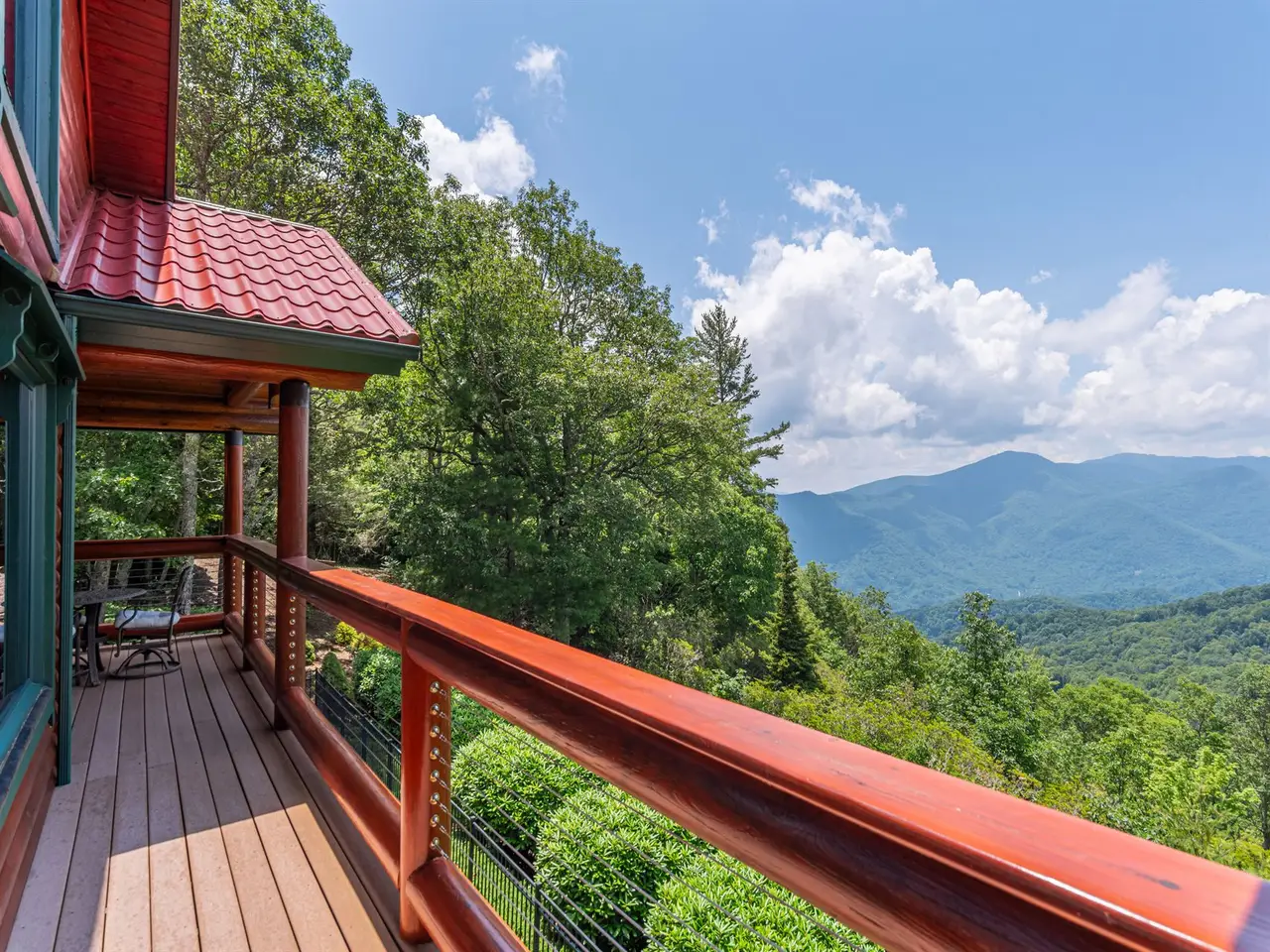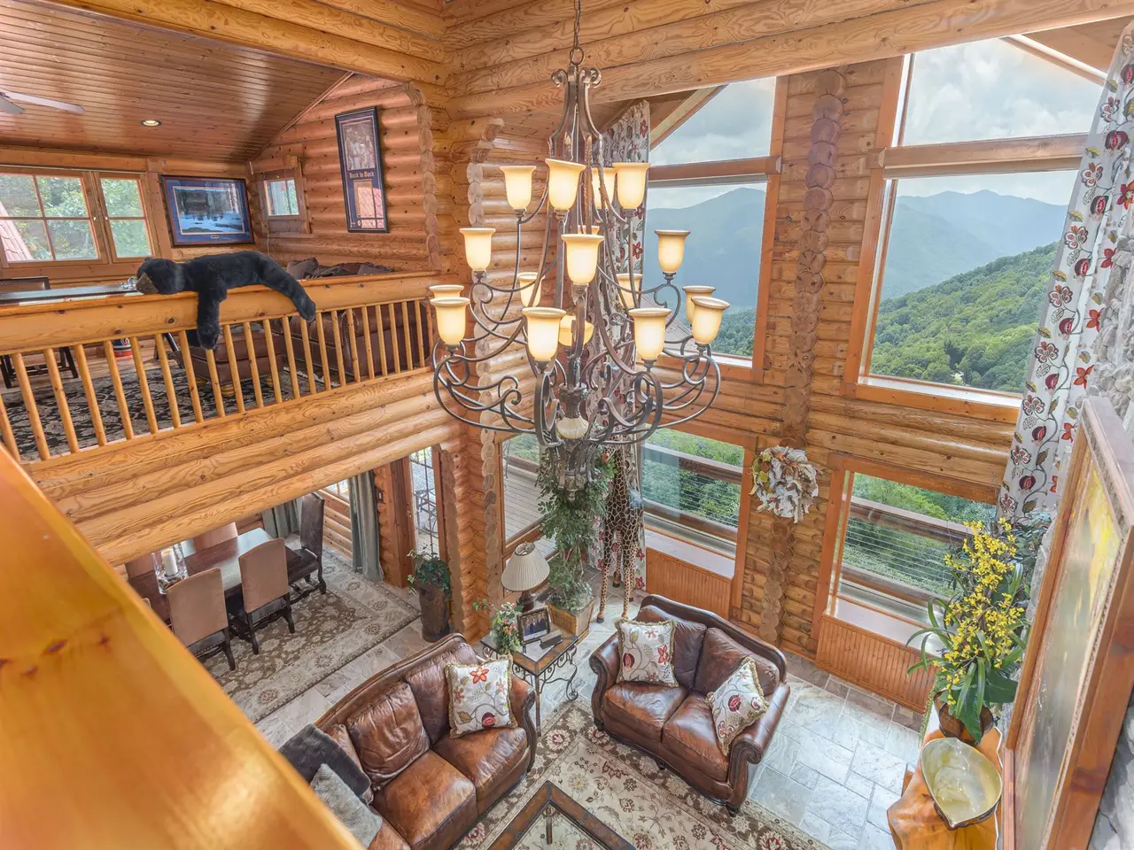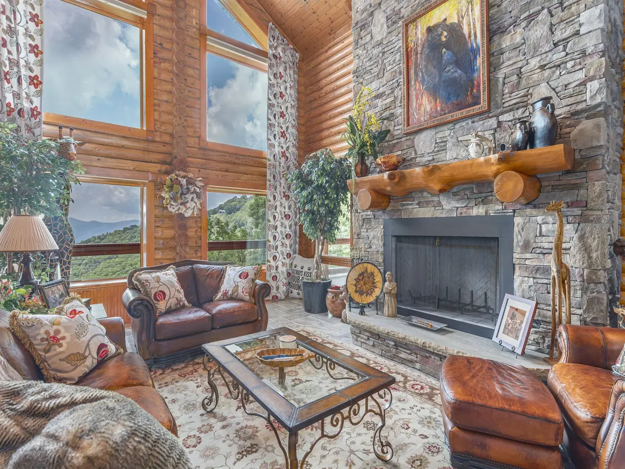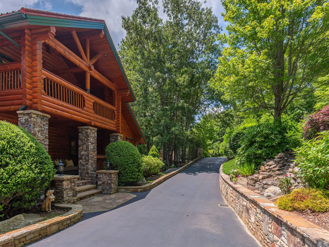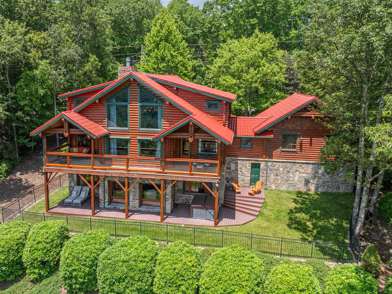 Discover this breathtaking Honka log home of Scandinavian design & precision nestled atop Maggie Valley in gated Laurel Heights. At 4800' elevation, enjoy cool temps and unparalleled long-range views from countless windows. Each of the three luxurious primary suites is a private retreat, boasting spacious rooms, walk-in closets and showers, and garden tubs for ultimate relaxation. For the culinary enthusiast, the main level chef's kitchen is seamlessly connected to the great room, which features a towering wall of windows framing magnificent south-facing views. Downstairs you'll find a second full kitchen, dining area, den, and a sprawling primary suite. The rec room/den is a great secondary entertaining space for gatherings. While mountain living fosters relaxation, the versatile upstairs loft serves as an ideal home office (or a spacious fourth sleeping room). Outside, the curated grounds are filled with exceptional, usable spaces to revel in the fresh mountain air.
