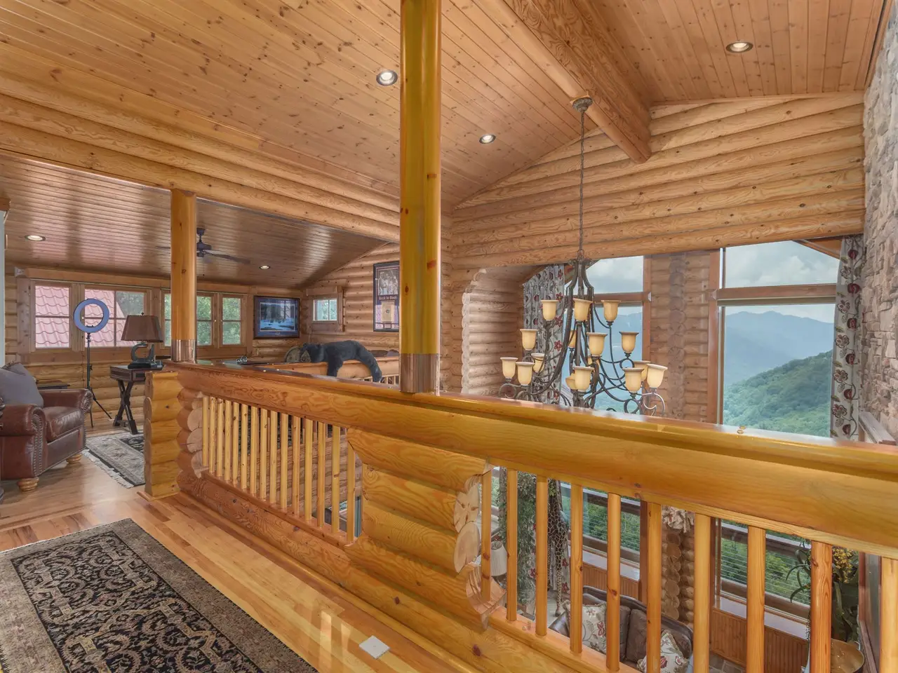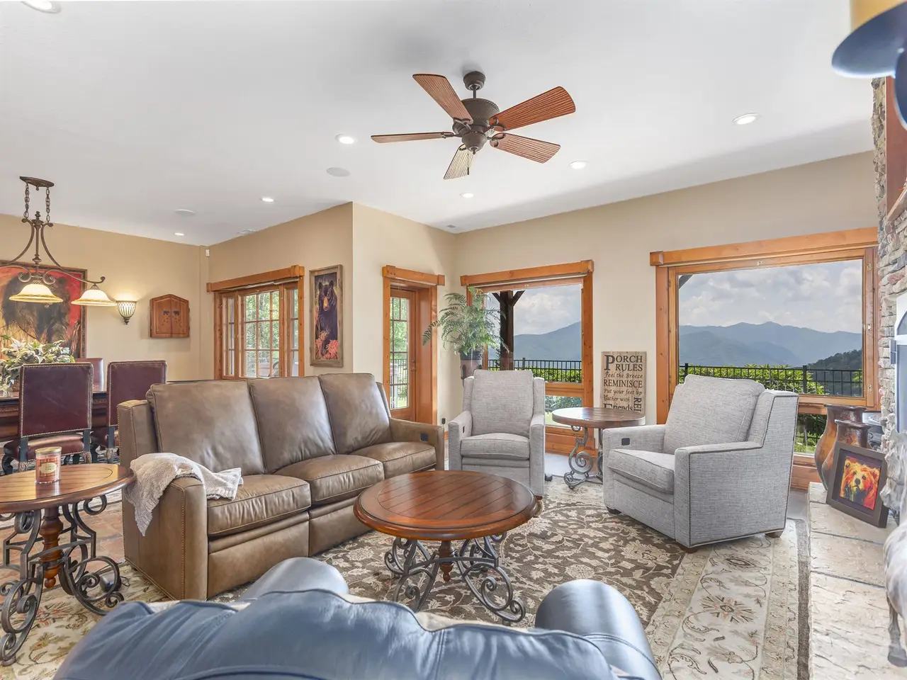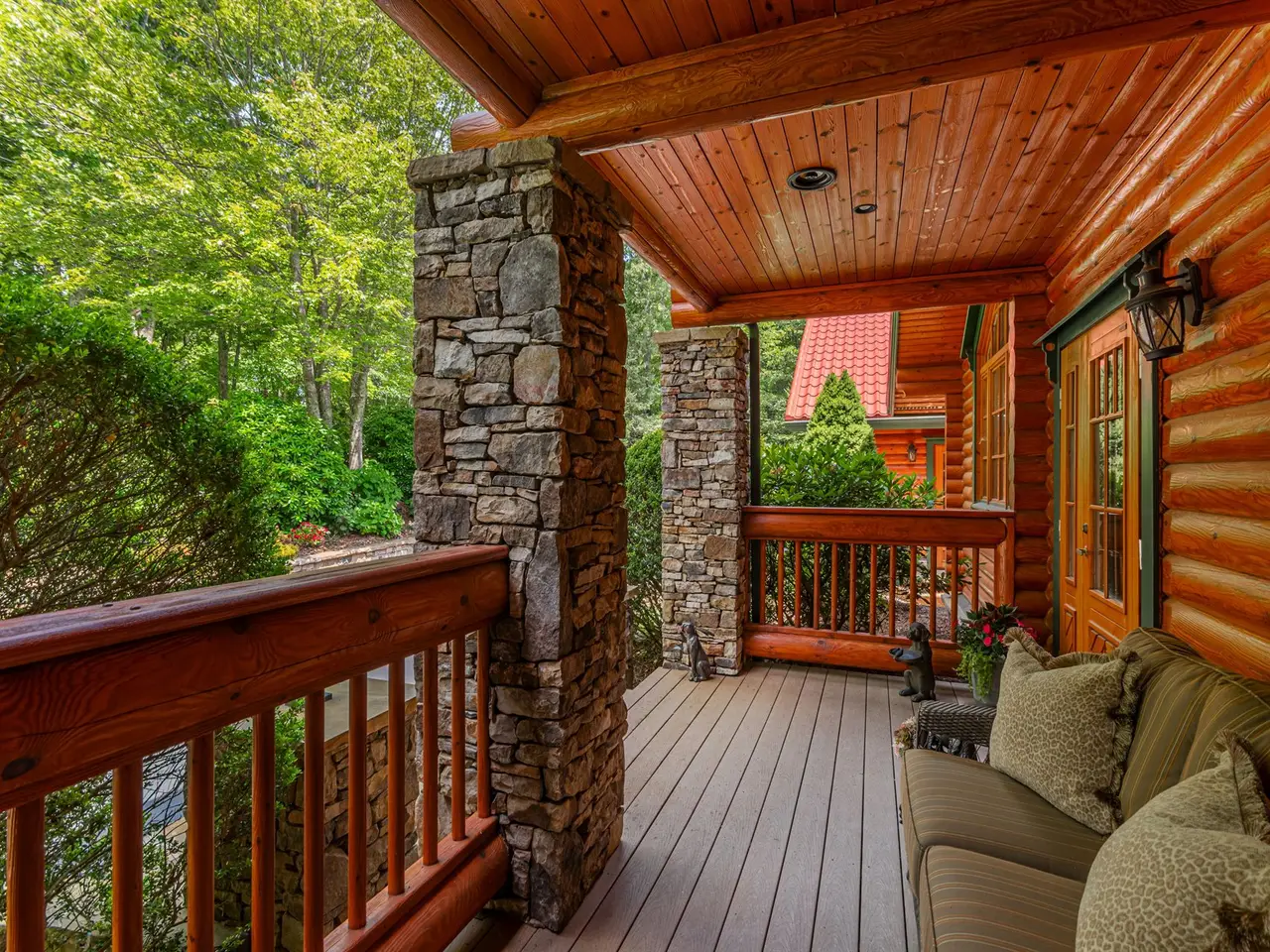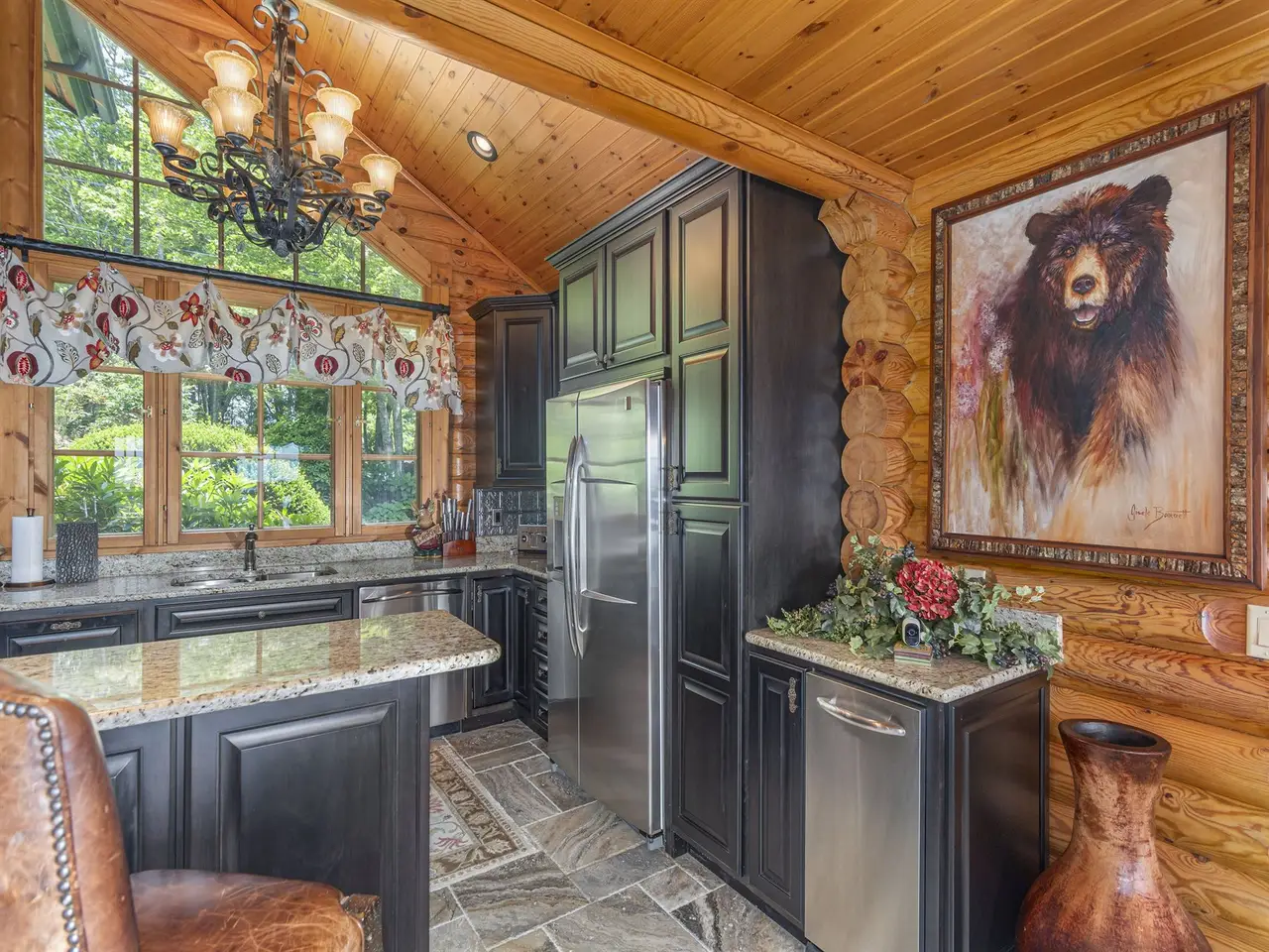 Discover this breathtaking Honka log home of Scandinavian design & precision nestled atop Maggie Valley in gated Laurel Heights. At 4800' elevation, enjoy cool temps and unparalleled long-range views from countless windows. Each of the three luxurious primary suites is a private retreat, boasting spacious rooms, walk-in closets and showers, and garden tubs for ultimate relaxation. For the culinary enthusiast, the main level chef's kitchen is seamlessly connected to the great room, which features a towering wall of windows framing magnificent south-facing views. Downstairs you'll find a second full kitchen, dining area, den, and a sprawling primary suite. The rec room/den is a great secondary entertaining space for gatherings. While mountain living fosters relaxation, the versatile upstairs loft serves as an ideal home office (or a spacious fourth sleeping room). Outside, the curated grounds are filled with exceptional, usable spaces to revel in the fresh mountain air.