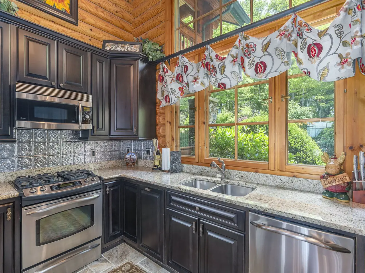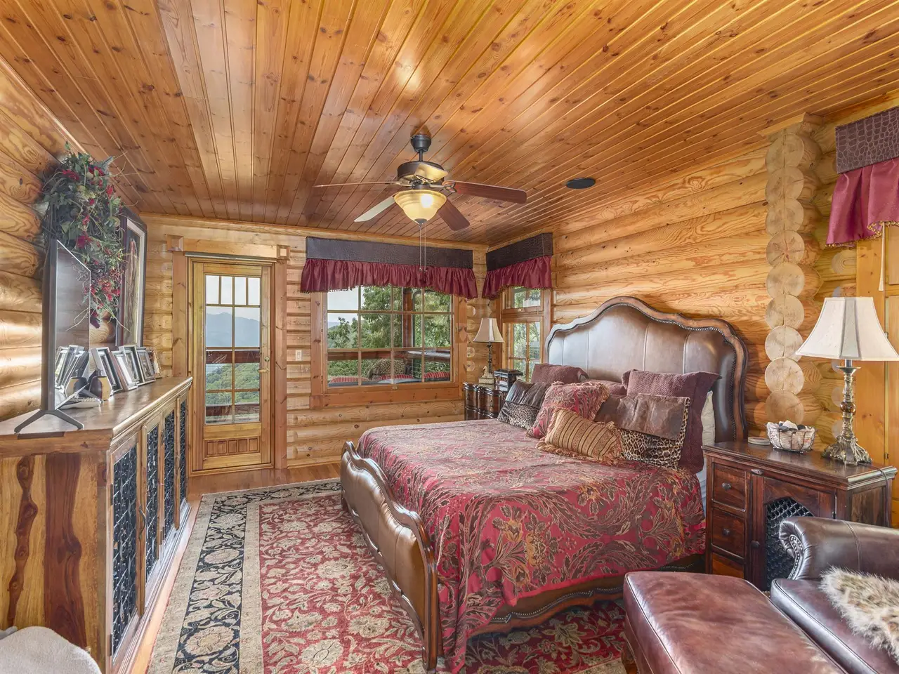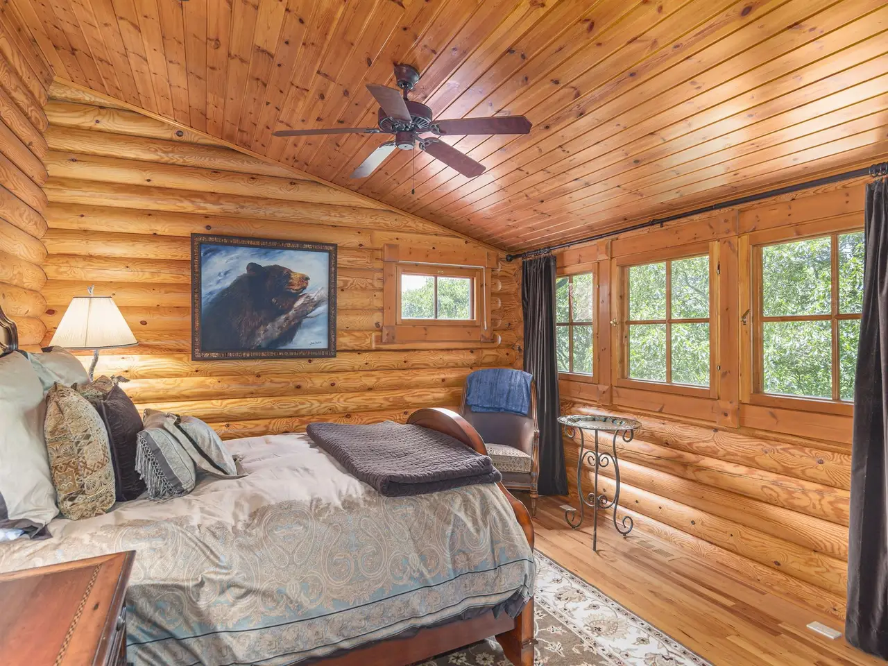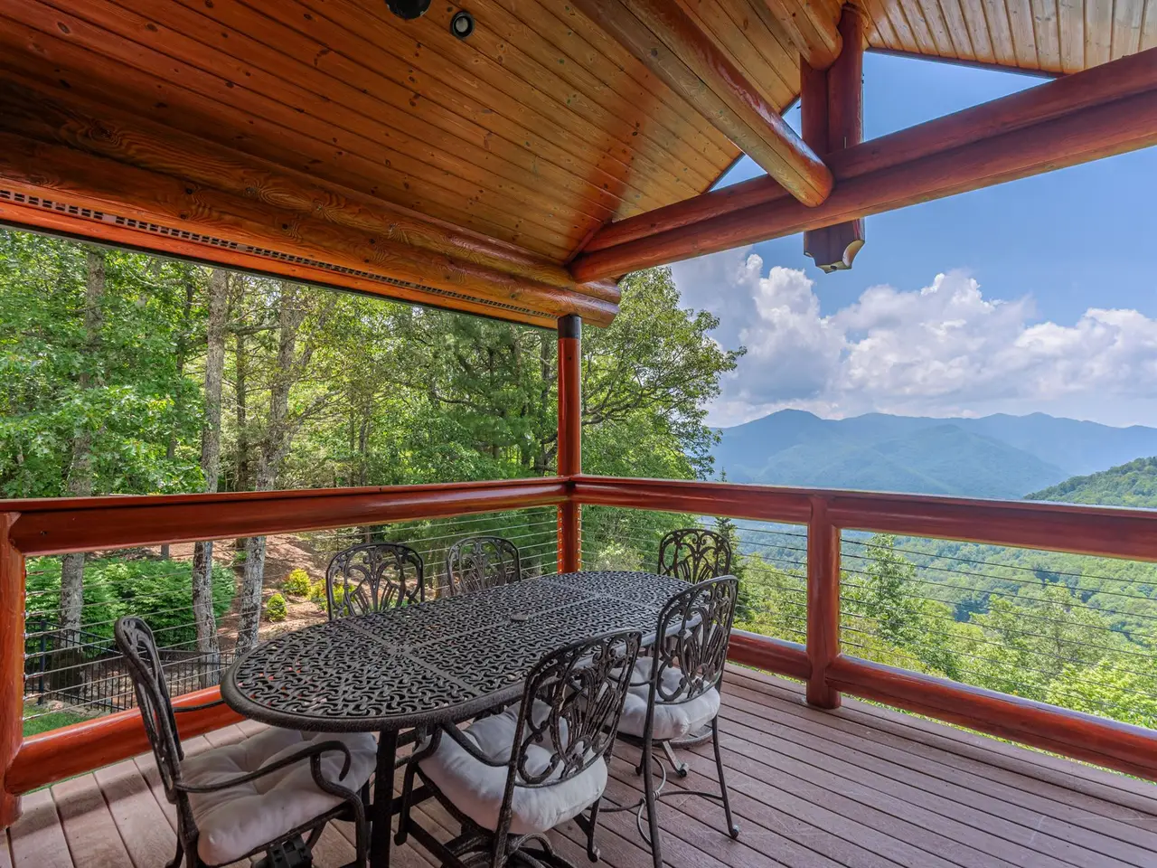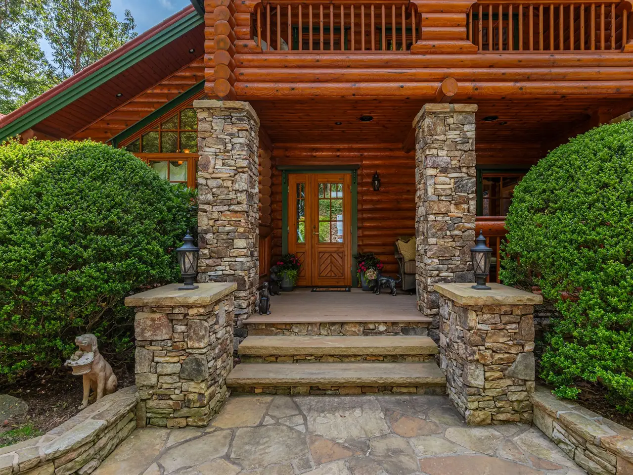 Discover this breathtaking Honka log home of Scandinavian design & precision nestled atop Maggie Valley in gated Laurel Heights. At 4800' elevation, enjoy cool temps and unparalleled long-range views from countless windows. Each of the three luxurious primary suites is a private retreat, boasting spacious rooms, walk-in closets and showers, and garden tubs for ultimate relaxation. For the culinary enthusiast, the main level chef's kitchen is seamlessly connected to the great room, which features a towering wall of windows framing magnificent south-facing views. Downstairs you'll find a second full kitchen, dining area, den, and a sprawling primary suite. The rec room/den is a great secondary entertaining space for gatherings. While mountain living fosters relaxation, the versatile upstairs loft serves as an ideal home office (or a spacious fourth sleeping room). Outside, the curated grounds are filled with exceptional, usable spaces to revel in the fresh mountain air.