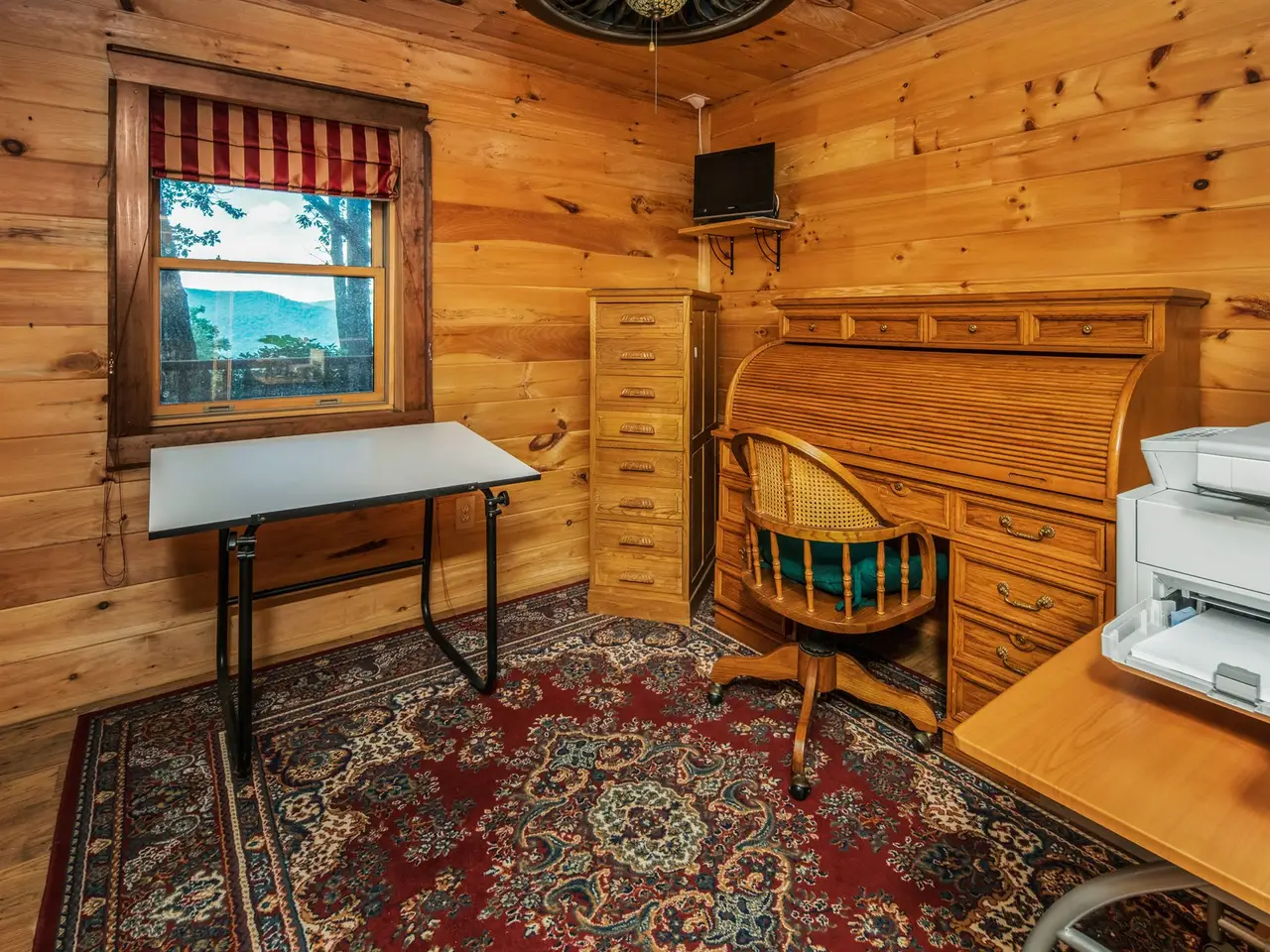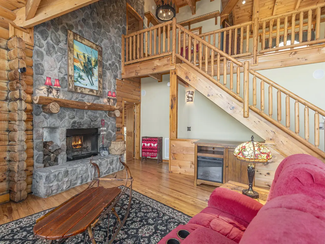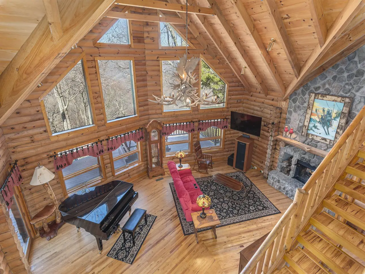 Experience the pinnacle of Maggie Valley mtn living in this custom lodge-like log home, nestled at a breathtaking 4200' elevation. Set on over 3 acres, the home offers privacy and inspiring views. Inside, discover high-end custom finishes throughout. The expansive open-plan living area features a stunning stone fireplace, and the large windows frame awe-inspiring views. Huge primary bedroom suite on the main also enjoys a fireside setting, along with direct access to the sprawling deck. Upstairs you'll find two more bedrooms, bathroom, and a large loft overlooking the 2-story great room. Ideal for entertaining, the lower level boasts a den with pool table/fireplace/bar, bonus rooms, garage, and abundant storage space. Outside, you'll find ample deck space to enjoy the cool summer temps. Newly stained/sealed exterior and new roof ensures lasting beauty/durability. Below the home is a small site-built cabin, perfect as a playhouse or hobby space. 600 sq ft detached studio/workshop is ideal for creative/practical pursuits. Paved roads lead to the gated property. Adjoining included parcel makes a great buffer... or an additional build site with big views! This gated property has so much to offer, and it is your opportunity to own a piece of Blue Ridge paradise.