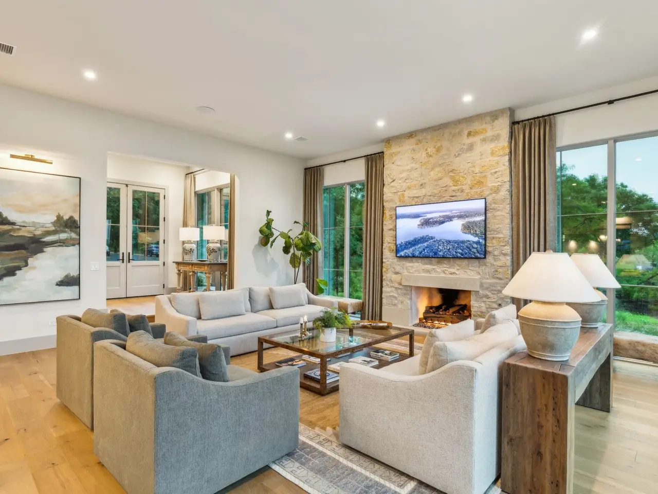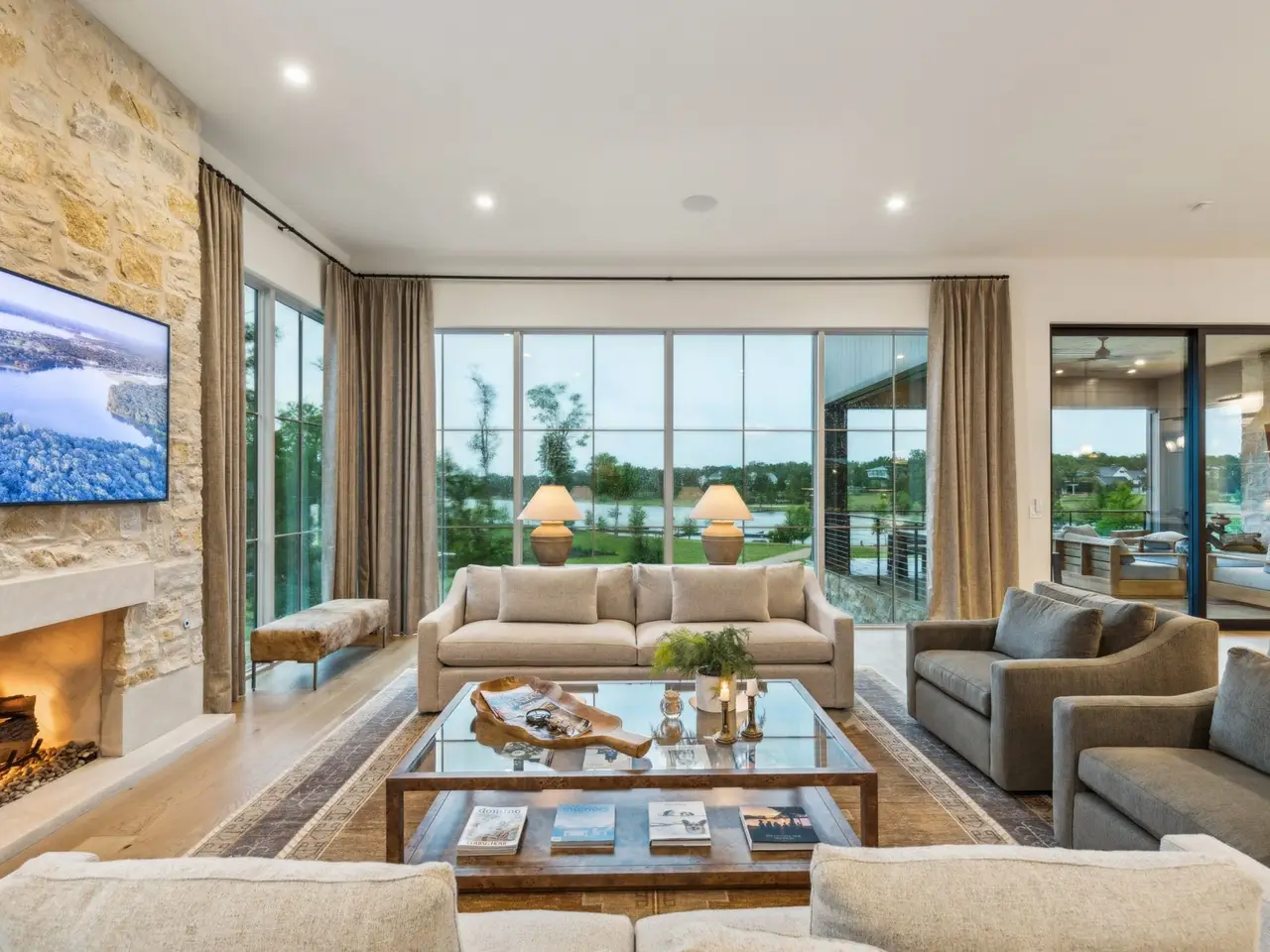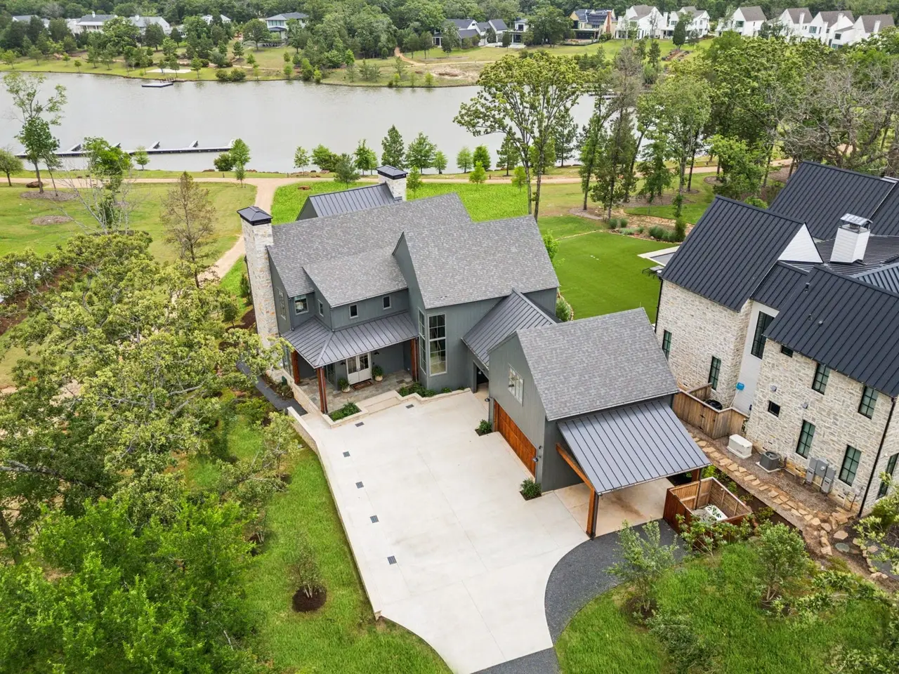 Tucked beneath a canopy of trees on a premium oversized lakefront lot in Long Cove, 13160 Woodsy Way blends luxury, comfort, and privacy in a beautifully designed retreat. With over 4800 square feet, plus additional bonus space above the garage, this custom oasis offers stunning lake views and direct access to the shoreline trail, perfect for long walks or golf cart rides. The open-concept layout connects expansive indoor and outdoor living spaces. A premium sound system runs throughout the home, including the large upstairs game room and covered outdoor porch with motorized screens, outdoor wood-burning fireplace, and built-in patio heaters, perfect for year-round entertaining. Gather around the outdoor fire pit or soak in the views from the sunning deck, all framed by a professionally designed landscape. Inside, the chef's kitchen features Taj Mahal quartzite countertops, premium appliances, custom cabinetry, a spacious walk-in pantry, and a large island ideal for entertaining. A marble-clad primary bathroom, Providence Lane custom drapery and window shades, Visual Comfort lighting, and a two-office setup, including one with incredible lake views, elevate the lifestyle even further. Each of the additional four large bedrooms features its own en-suite bathroom, with one bedroom designed as a bunk room accommodating two California King beds and two twin beds. Practical elegance continues with a spacious mudroom, custom cubbies, and herringbone brick flooring. An outdoor breezeway is designed to hold two golf carts and connects the home to a two-car garage and carport, and turfed dog yard for furry friends. Peace of mind comes built-in with full exterior video monitoring, lightning rods, a whole-house water filtration system, and a backup generator. Whether you're looking for the perfect weekend escape or a forever home, 13160 Woodsy Way delivers resort-style living in a private, wooded setting just steps from the lake.