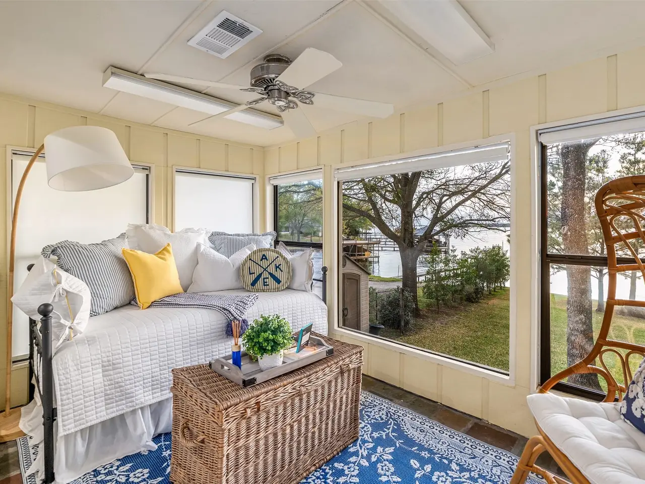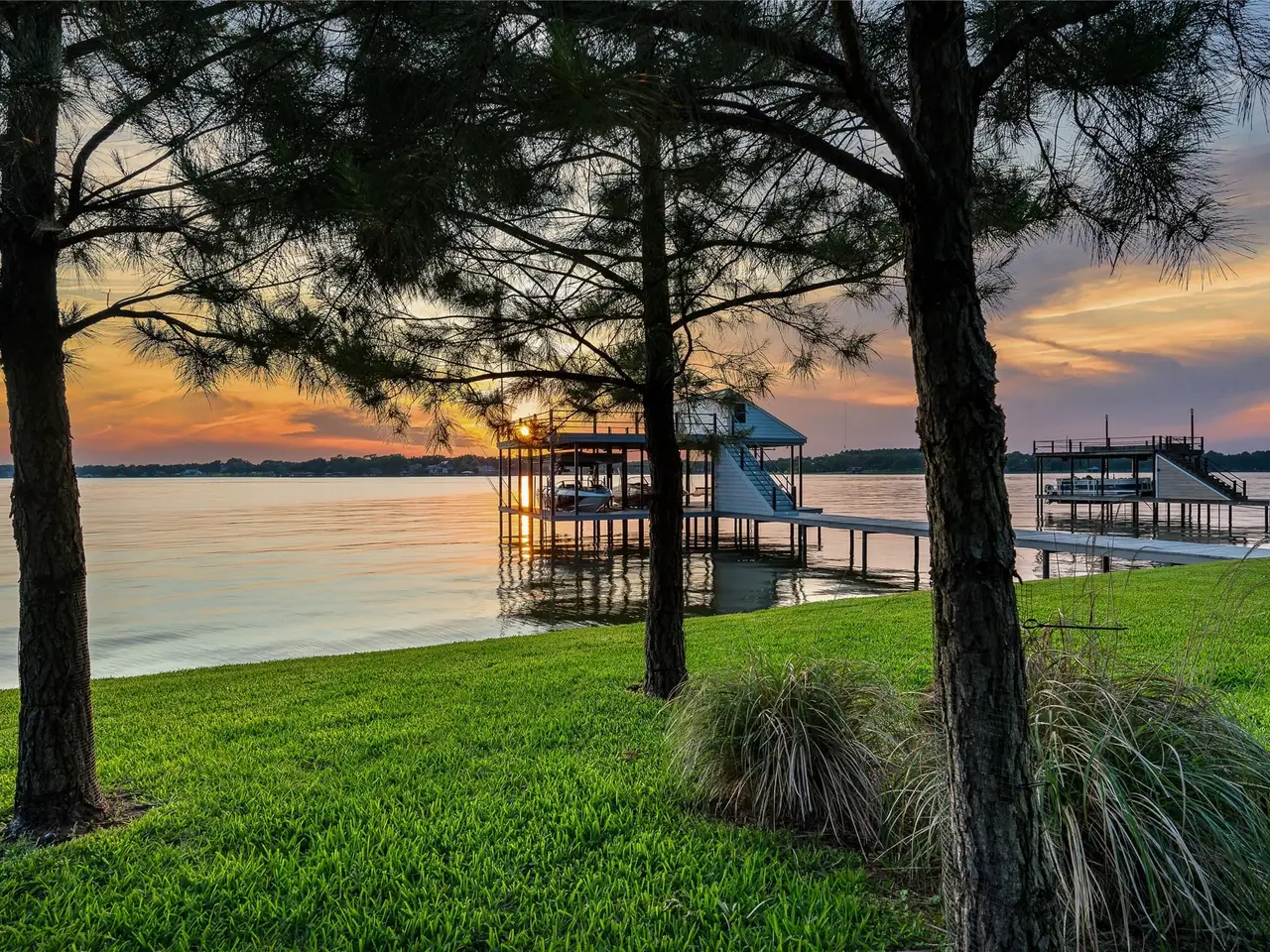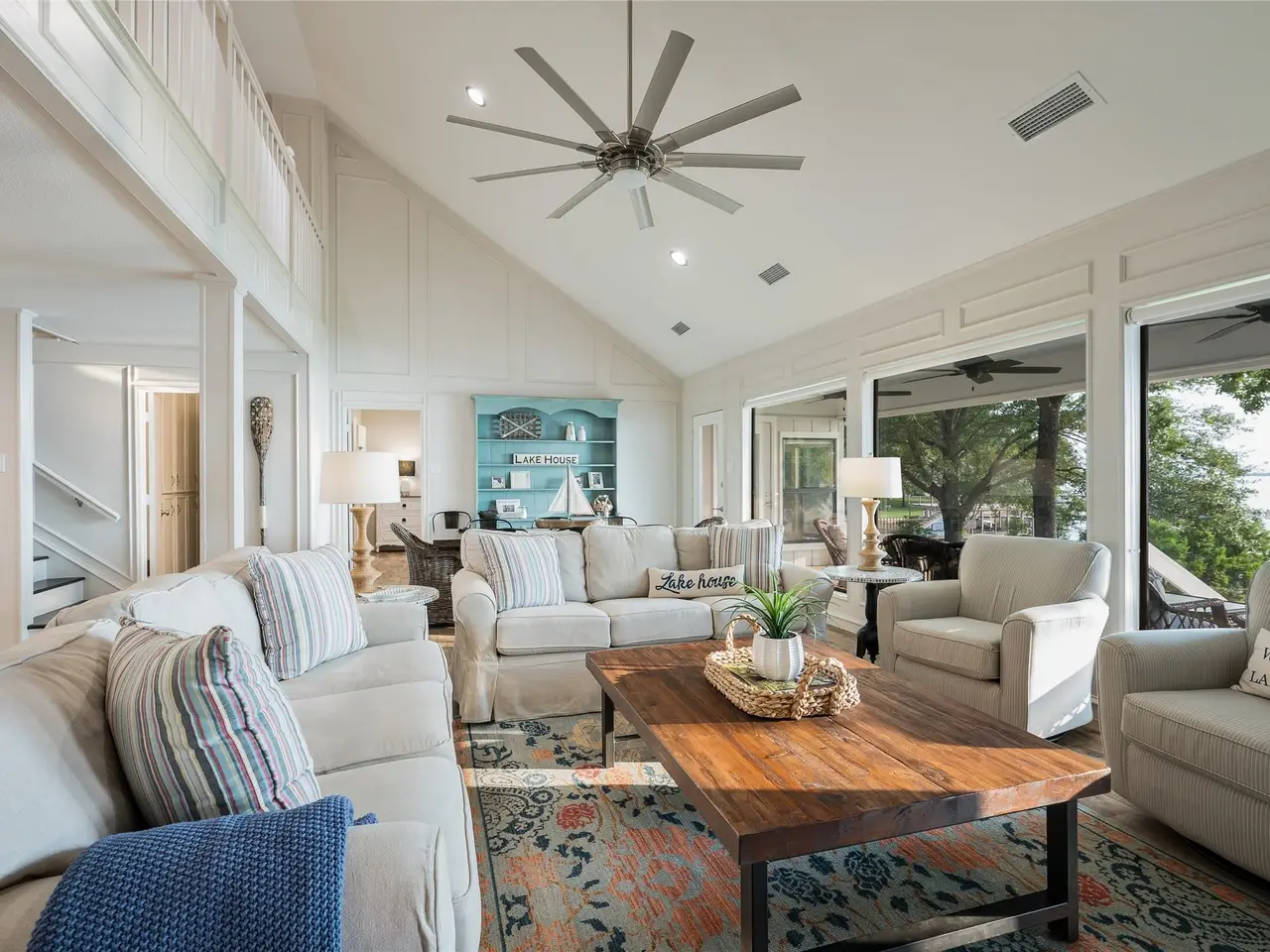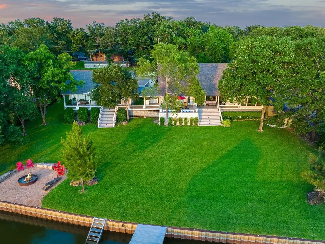Stunning double lot estate with main home and guest house totaling 3,165 sf on one-half acre with wide open water views and some of the deepest water you'll find on Cedar Creek Lake. This tastefully updated home gives modern, coastal vibes and has room to sleep and entertain a crowd. The main home has 4 bedrooms, 3 and 1 half baths, soaring vaulted ceilings, wood-burning fireplace, built-in bar with wine cooler, a sunroom that can double as a guest bedroom, full utility room, and walls of glass to the lake. The guest house, built in 2019, shares a deck with outdoor kitchen and includes a bunkroom and full bathroom, kitchen, and laundry. The large, updated boathouse has two boat slips - one is equipped with heavy duty, double cable, double motor lift system for your wake boat - double Sea-Doo lift, and plenty of storage for all your water toys. Extras include a touchless boat cover, spider misting system, sprinkler system from lake pump, golf cart garage, under deck storage with work bench and professional landscaping with outdoor lighting, and a beautiful firepit area at the water's edge to enjoy amazing sunsets.