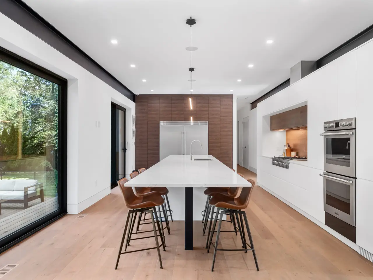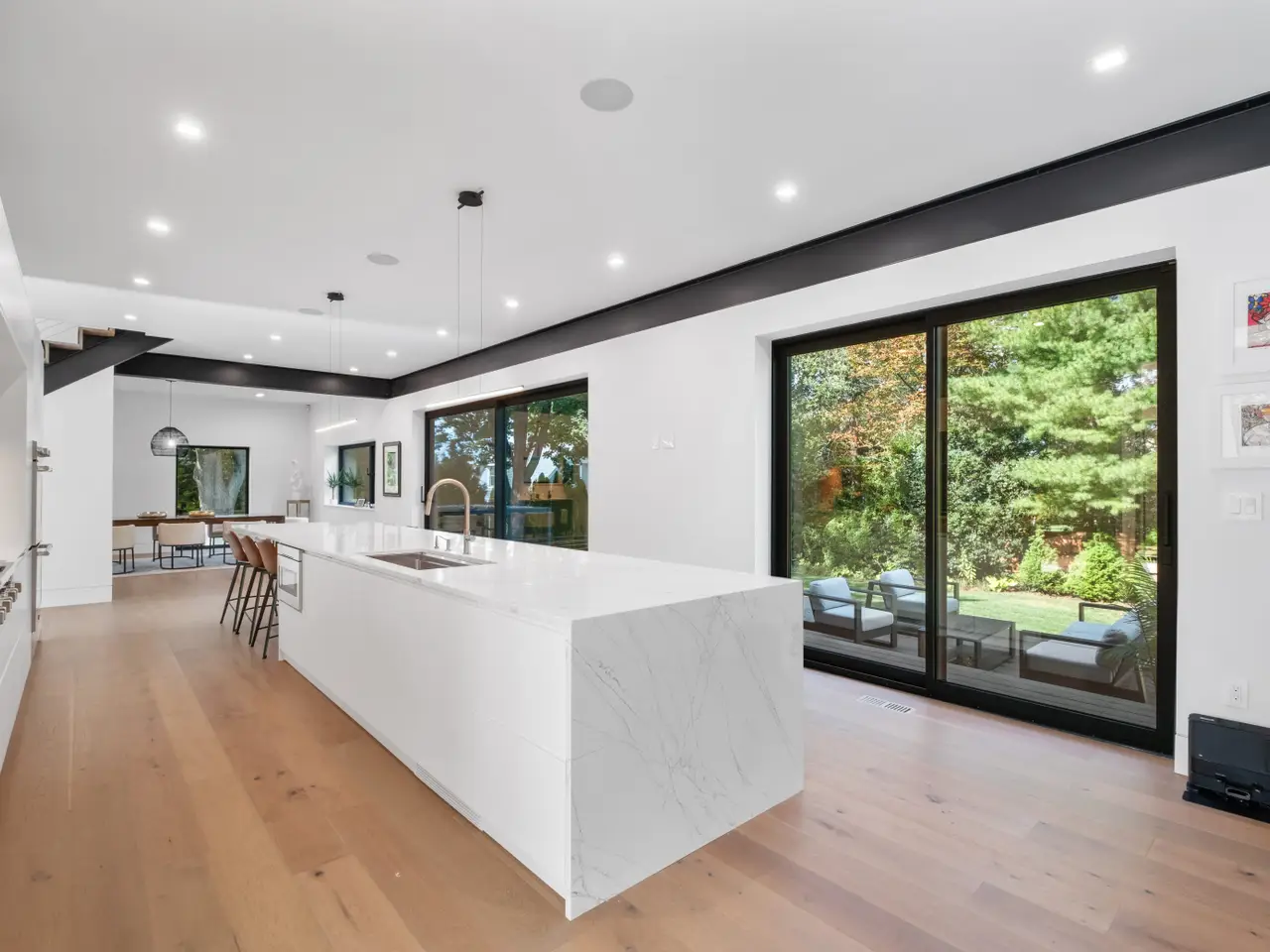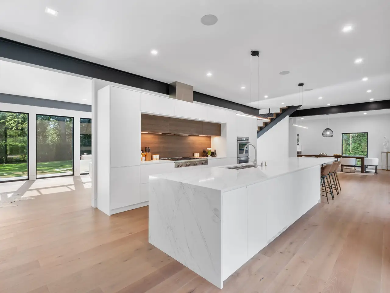 Dramatic walls of glass Custom-designed kitchen with 19-foot waterfall island