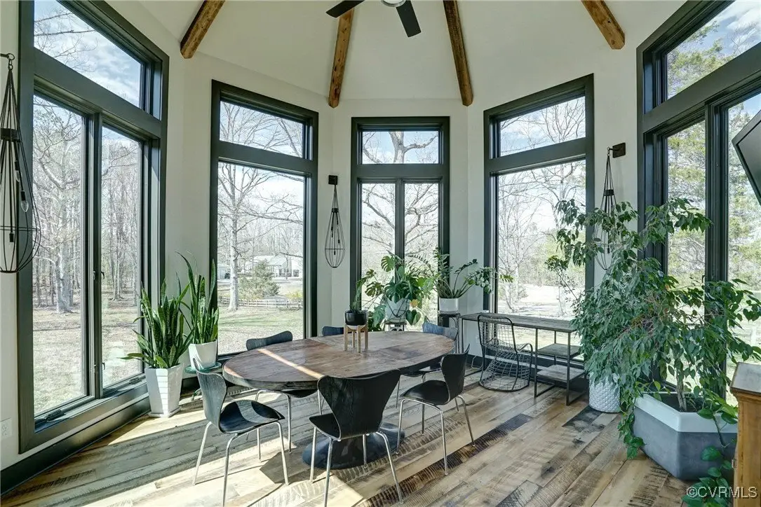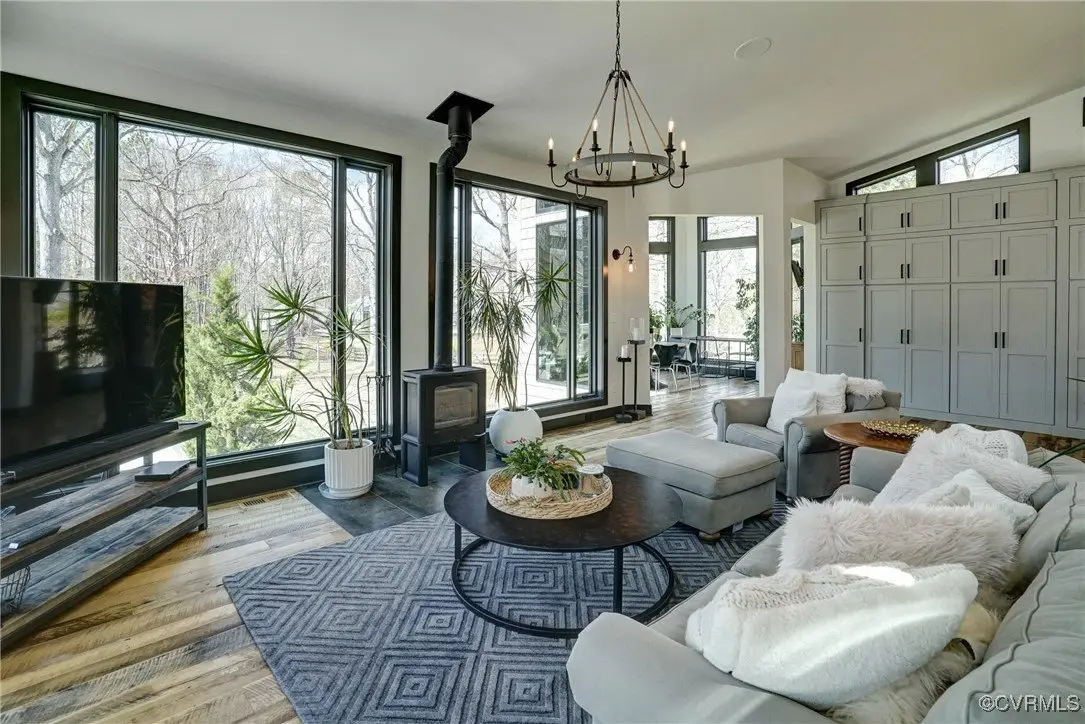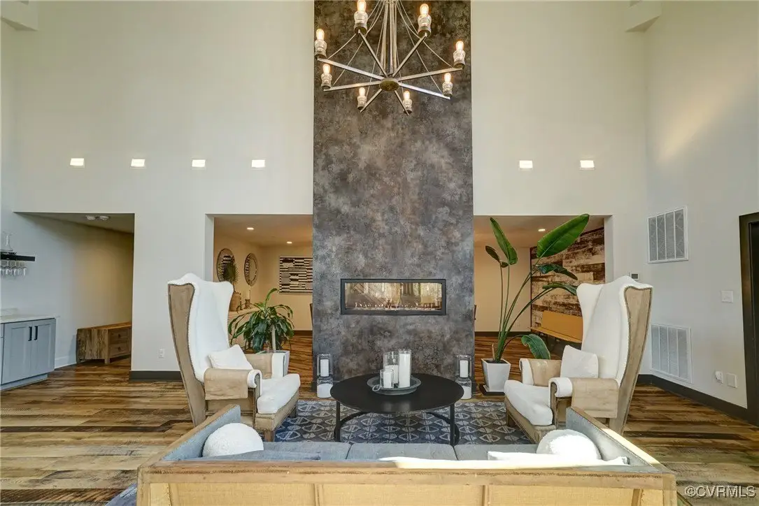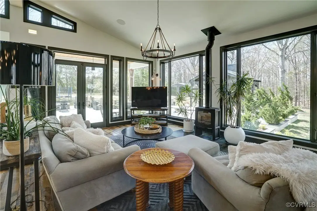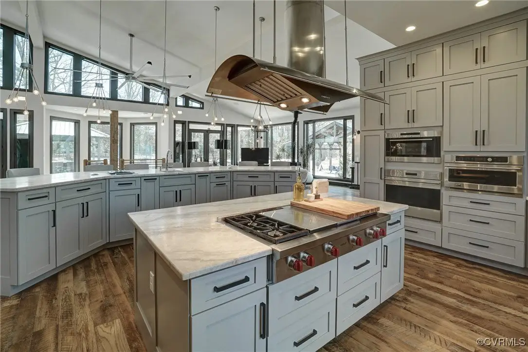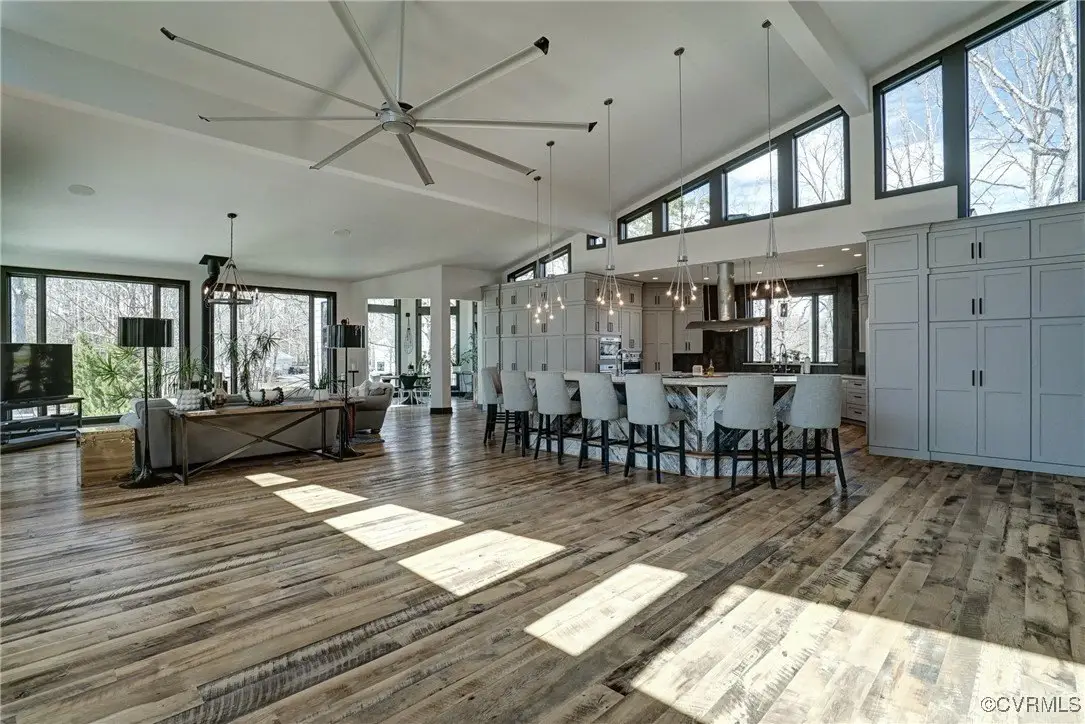 Entertainer's dream home has been extensively renovated with high end design and decorator finishes for your immediate enjoyment. The addition includes a 20 ft vaulted family room, custom kitchen and morning room for casual dining and features a floor to ceiling gas fireplace feature wall, random width reclaimed oak flooring, Umanoff lighting and walls of Pella windows and doors that flood the interiors with natural light and offer fantastic views of the nearly 5-acre site. The kitchen has a Wolf gas rangetop with griddle and grill, a steam convection oven, a convection wall oven, countertop steamer, Advantium oven, Sub-Zero refrigerator freezer and wine refrigerator. Custom cabinetry, quartzite countertops and and reclaimed wood on the island. The formal dining room has wonderful ambience from the fireplace shared with the family room. A private study with custom cabinetry and living room create additional private and quiet rooms for work and study. First floor primary suite has a huge walk-in closet and a gorgeous renovated bathroom with heated floors, steam sauna shower with dual heads and a rainwater head and dual granite vanities. A fully finished walk-out basement features a large entertainment room with gas fireplace, a walnut floating bar that seats 6, wall cabinet with copper sinks and a 2,500 bottle wine cellar. Upstairs is a second primary bedroom suite with walk-in closet and two bedrooms with a Jack and Jill bath, a home theatre with HD projector and 10 ft screen, an exercise room with a rubber floor and third floor bonus room. The outdoor living areas are fabulous with a covered kitchen and grill area, composite decking, a pool pavilion with fireplace, a 20 ft X 40 ft salt pool with tanning ledge and automatic cover for safety and a custom fire pit. Two-car attached garage. Bring your RV, boat and cars to the 40 ft X 36 ft detached garage with 2-15 ft garage doors. Whole house generator, Great location in Goochland's Centerville Village so convenient to Short Pump,West Creek and I-64 & Route 288.