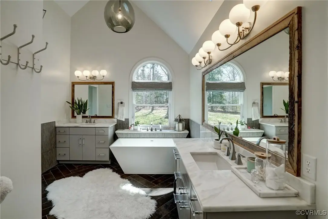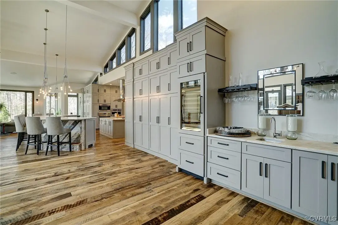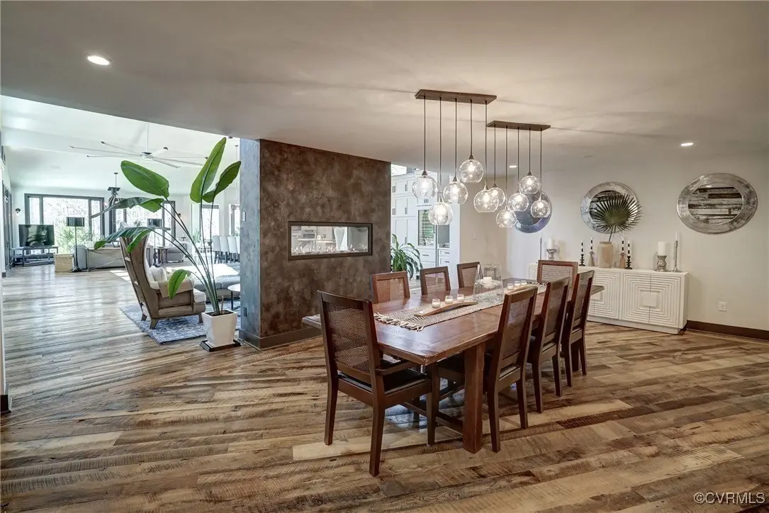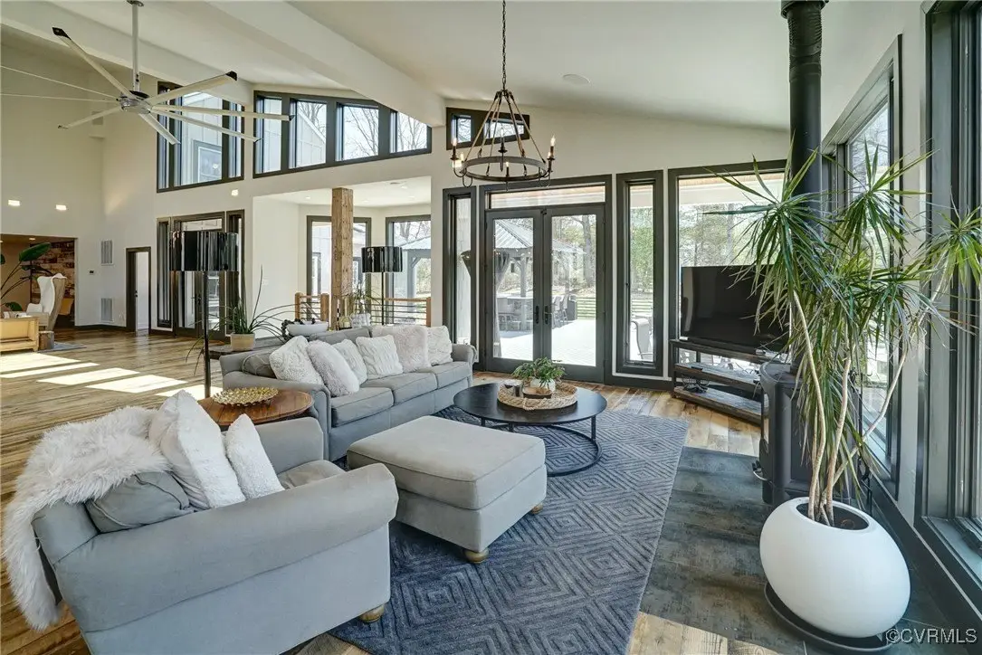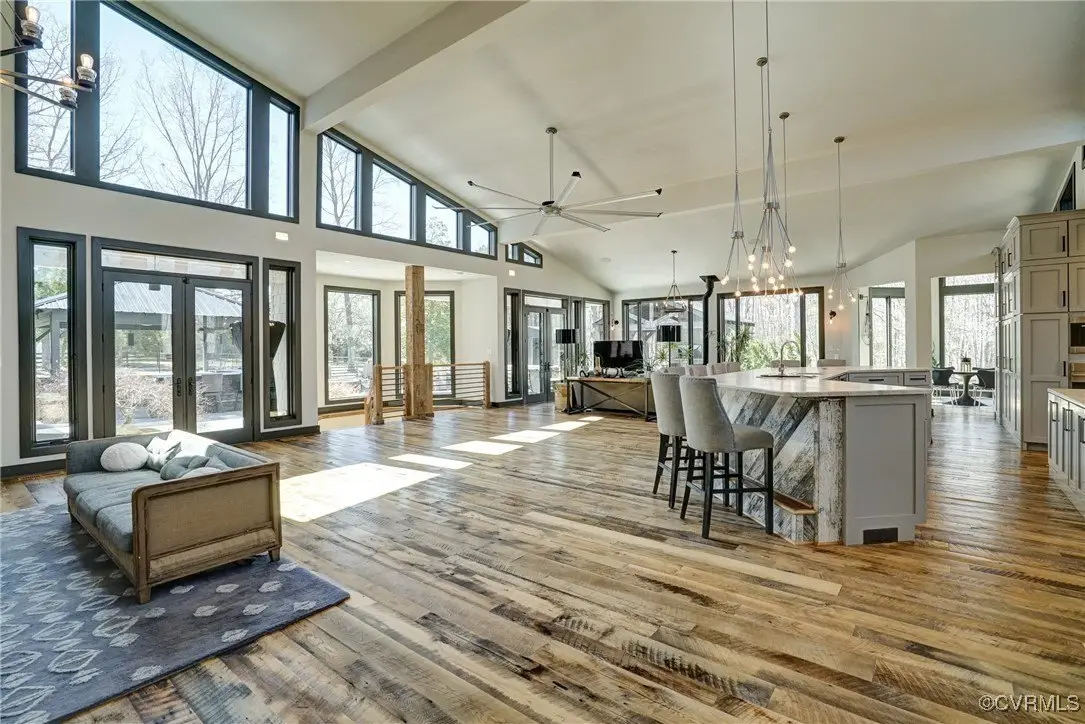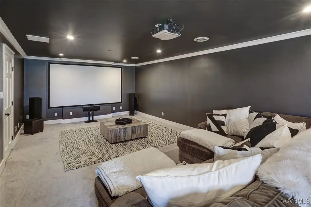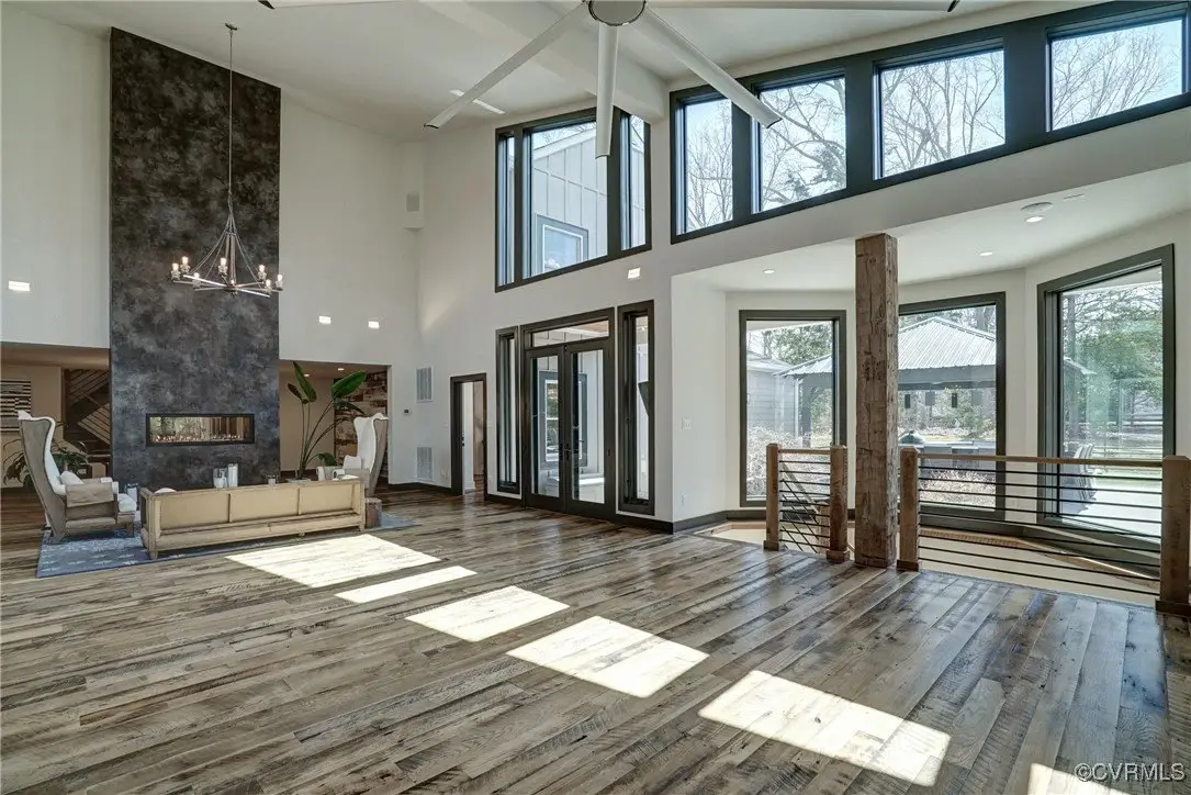 Entertainer's dream home has been extensively renovated with high end design and decorator finishes for your immediate enjoyment. The addition includes a 20 ft vaulted family room, custom kitchen and morning room for casual dining and features a floor to ceiling gas fireplace feature wall, random width reclaimed oak flooring, Umanoff lighting and walls of Pella windows and doors that flood the interiors with natural light and offer fantastic views of the nearly 5-acre site. The kitchen has a Wolf gas rangetop with griddle and grill, a steam convection oven, a convection wall oven, countertop steamer, Advantium oven, Sub-Zero refrigerator freezer and wine refrigerator. Custom cabinetry, quartzite countertops and and reclaimed wood on the island. The formal dining room has wonderful ambience from the fireplace shared with the family room. A private study with custom cabinetry and living room create additional private and quiet rooms for work and study. First floor primary suite has a huge walk-in closet and a gorgeous renovated bathroom with heated floors, steam sauna shower with dual heads and a rainwater head and dual granite vanities. A fully finished walk-out basement features a large entertainment room with gas fireplace, a walnut floating bar that seats 6, wall cabinet with copper sinks and a 2,500 bottle wine cellar. Upstairs is a second primary bedroom suite with walk-in closet and two bedrooms with a Jack and Jill bath, a home theatre with HD projector and 10 ft screen, an exercise room with a rubber floor and third floor bonus room. The outdoor living areas are fabulous with a covered kitchen and grill area, composite decking, a pool pavilion with fireplace, a 20 ft X 40 ft salt pool with tanning ledge and automatic cover for safety and a custom fire pit. Two-car attached garage. Bring your RV, boat and cars to the 40 ft X 36 ft detached garage with 2-15 ft garage doors. Whole house generator, Great location in Goochland's Centerville Village so convenient to Short Pump,West Creek and I-64 & Route 288.