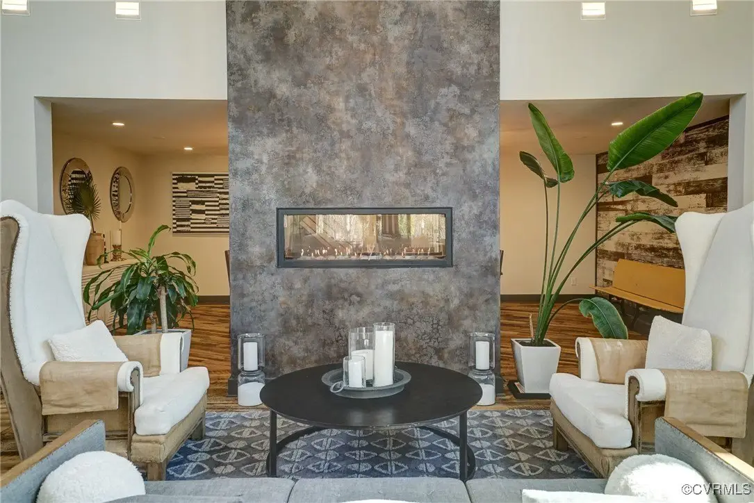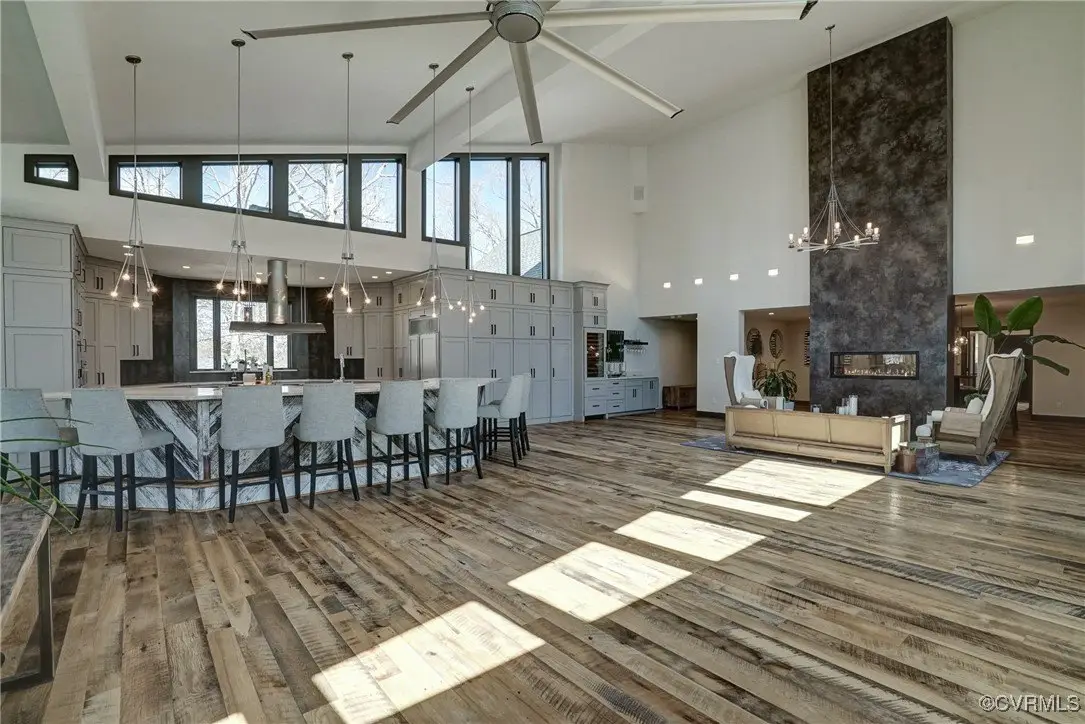 Vaulted family room with floor-to-ceiling gas fireplace wall