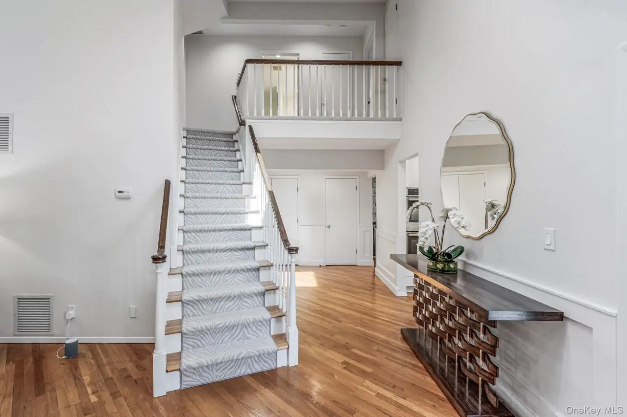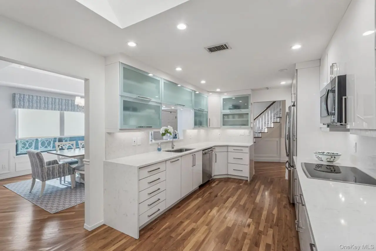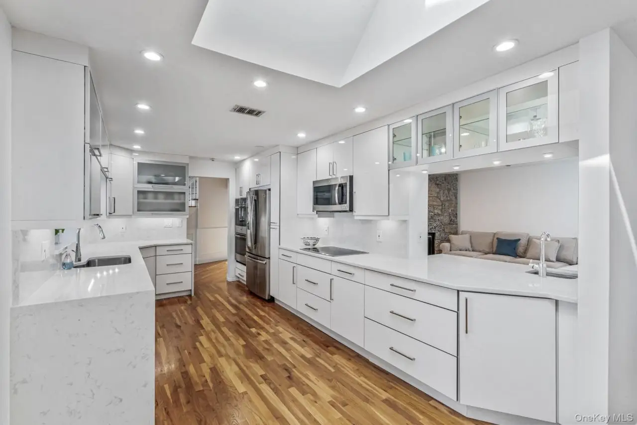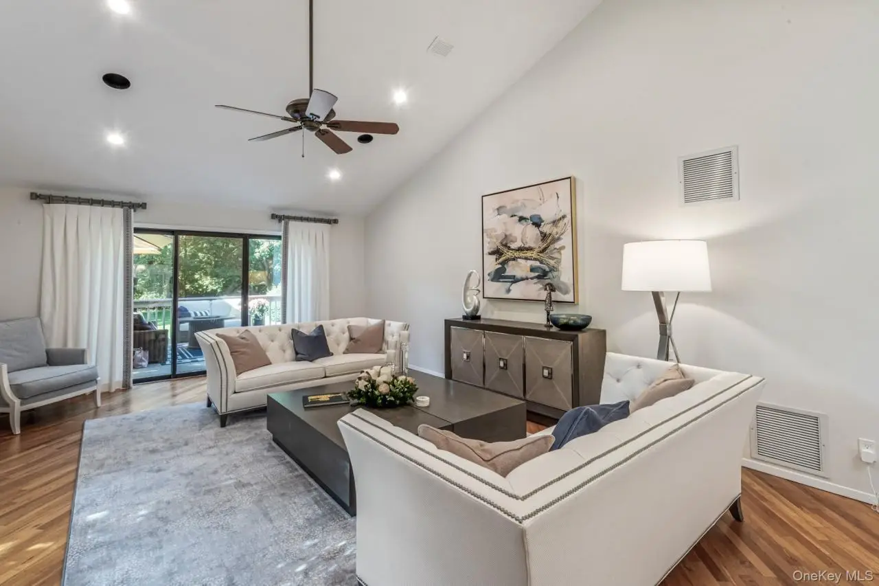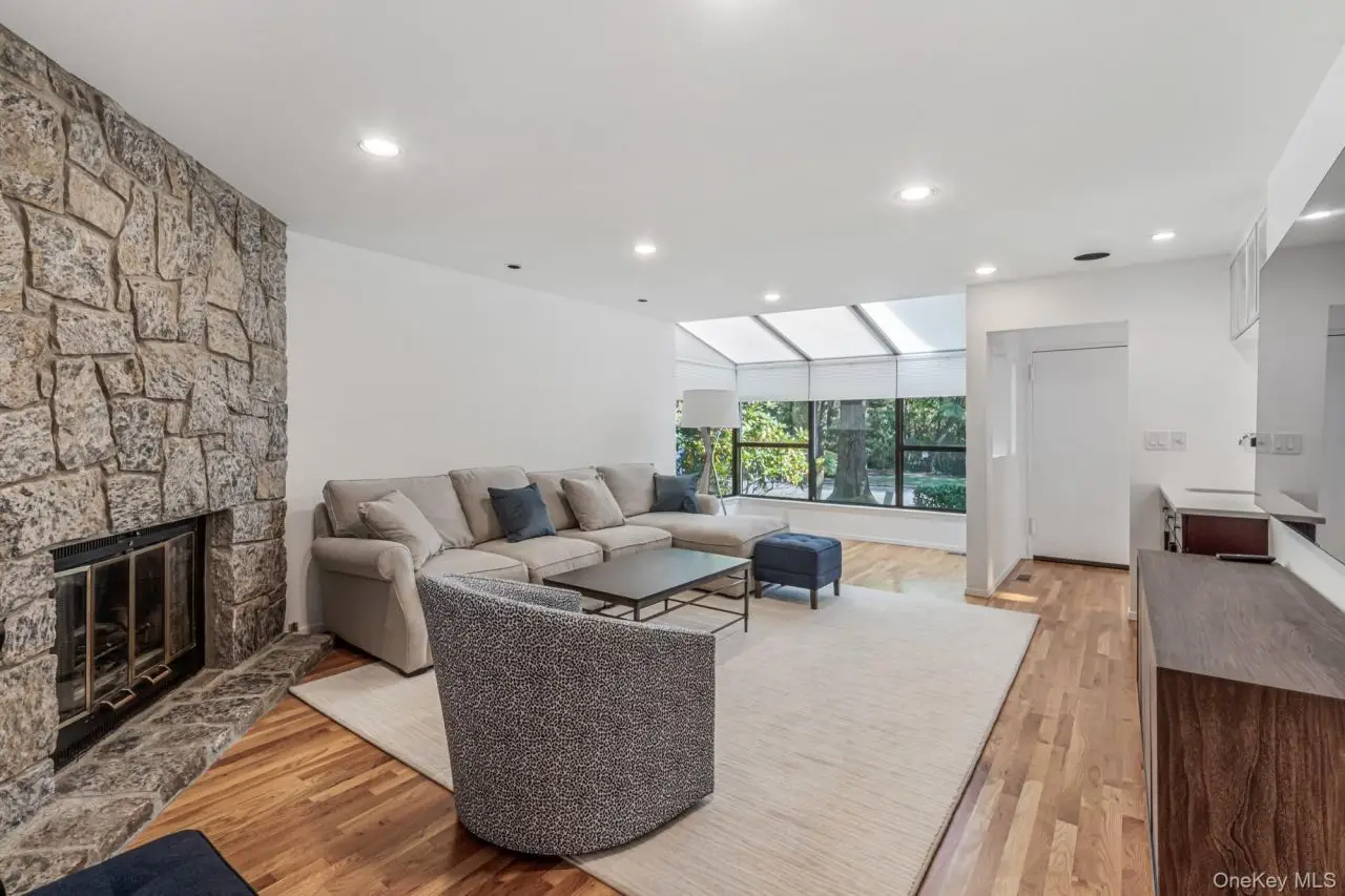 Welcome to this beautiful and tranquil home in the heart of the Gated Community of The Fairways. The home is characterized by hardwood floors, high ceilings, an open floor plan, large rooms and oversized windows that overlook green vistas and flood the interior with natural light. The renovated all white Modern Kitchen, with Stainless Steel appliances and Quartz Countertops opens to a large dining room with storage cabinets: perfect for entertaining! The Living room features a soaring cathedral ceiling and sliding doors to a quiet and peaceful outdoor deck surrounded by green space. Serene First Floor Primary Suite with walk in closet, laundry room, renovated Primary Bath, and access to the deck. For the winter months, there is a comfortable family room with wood burning fireplace and sun catching solarium windows. The second floor features 2 large bedrooms and a bath. The lower level has tons of storage, a recreation/home gym room, and a cedar closet. Attached 2 car garage with interior access, central vacuum. Enjoy community pool, tennis, pickle ball and basketball courts, and 24/7 security. Herricks School District.
