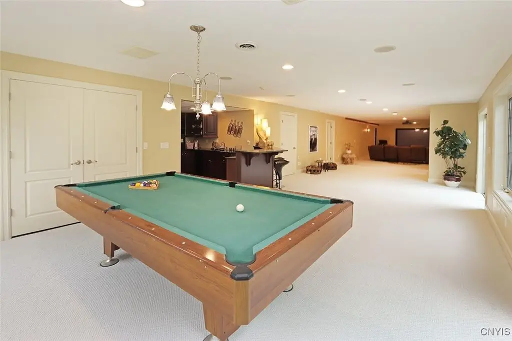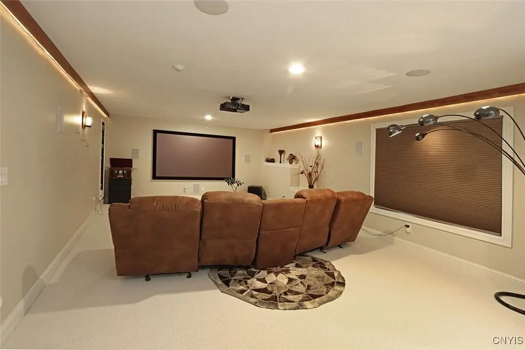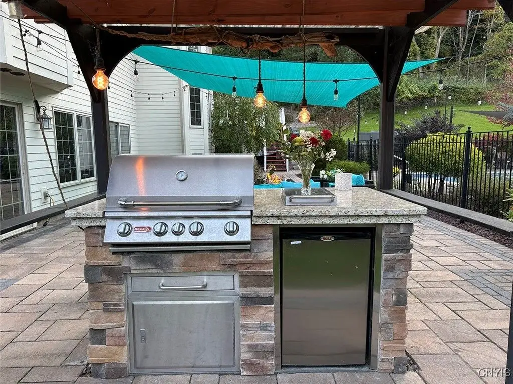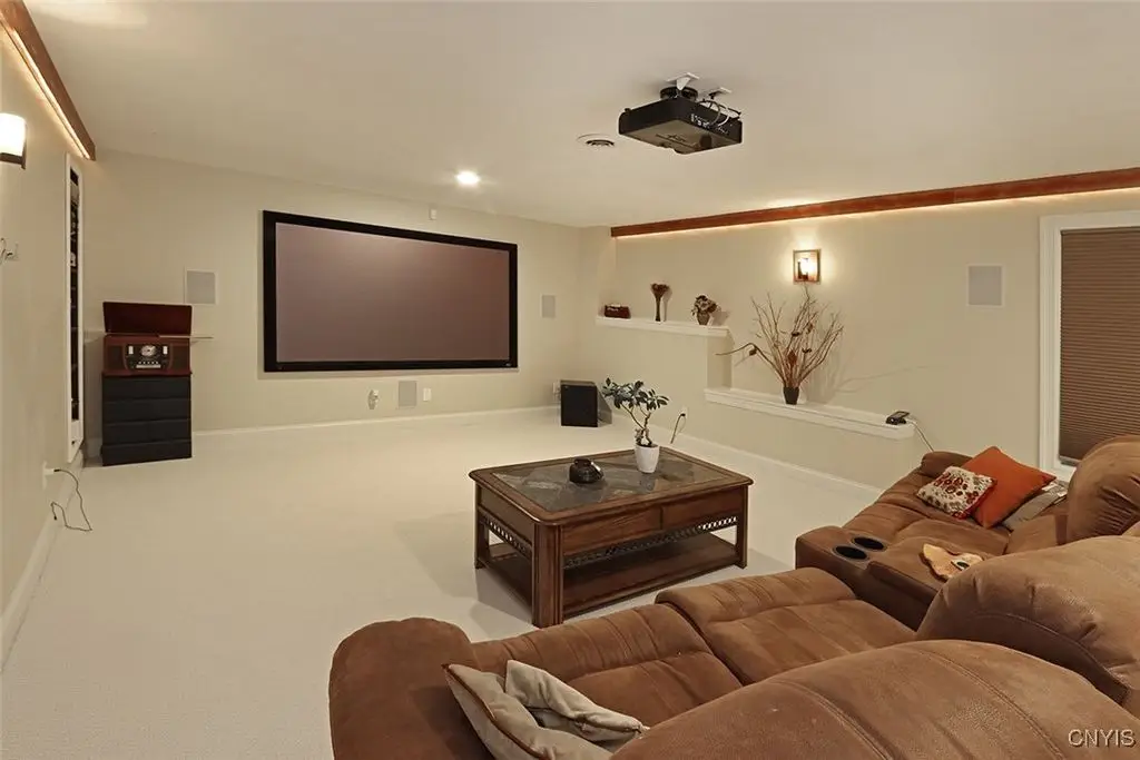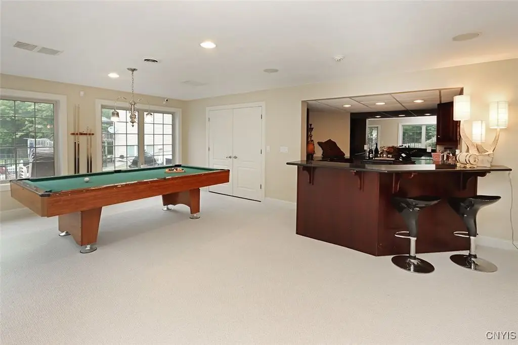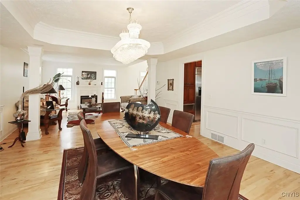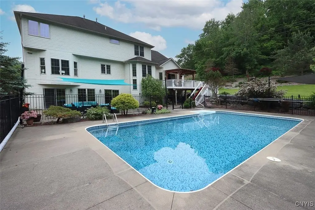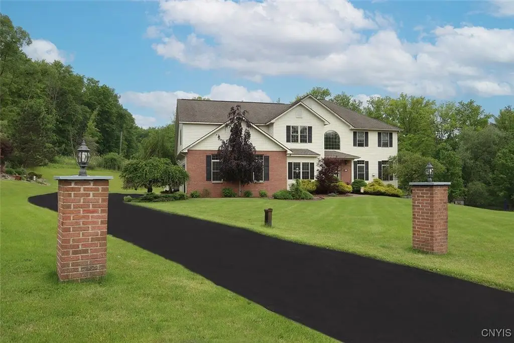 Expect to be impressed with this custom Colonial tucked at the end of a quiet cul-de-sac on 1.8 acres of beautifully landscaped grounds. The striking two-story foyer welcomes you with marble floors, a sweeping staircase and a stunning imported Asfour crystal chandelier. Gleaming hardwood floors, crown molding and bespoke millwork throughout create an atmosphere of refined elegance. A spacious home office with custom built-ins offers the optimal remote work setting. The open living and dining areas are divided by elegant columns, creating an ideal space for hosting. The living room features one of two gas fireplaces with a custom marble mantle, while the formal dining room is enhanced by wainscoting and a tray ceiling. The gourmet kitchen boasts a 10x5 granite island with breakfast bar, solid cherry cabinetry, GE Monogram stainless appliances, double ovens, dual dishwashers, walk-in pantry and casual dining area. The adjacent family room features a second fireplace, built-in media center, vaulted ceiling, slider to the back deck and a secondary staircase. Two powder rooms and a mudroom complete this level. Upstairs are four bedrooms, including the expansive primary suite with a generous walk-in closet and spa-like ensuite. Two bedrooms share a Jack-and-Jill bath and the fourth has a private bath. A convenient laundry center rounds out this floor. The finished walkout lower level adds 900 sq ft (included in total) and offers a full wet bar with wine rack, granite counters, fridge, dishwasher and ice makerC/B?B=perfect for entertaining. A custom home theater with built-ins sets the stage for movie nights and a bonus room plus full bath add even more versatility. Outside, enjoy a backyard oasis with an inground saltwater pool, expansive patio and a stone-faced outdoor kitchenC/B?B=fitting for summer gatherings. An upper deck overlooks the landscaped, tree-lined yard. Additional features include a whole-house security system, indoor/outdoor surround sound, lighted water feature and a large shed. Just minutes to Manlius Village, schools, shops and highways, this distinctive property showcases a refined blend of luxury, comfort and thoughtful design. Award-winning FM Schools!