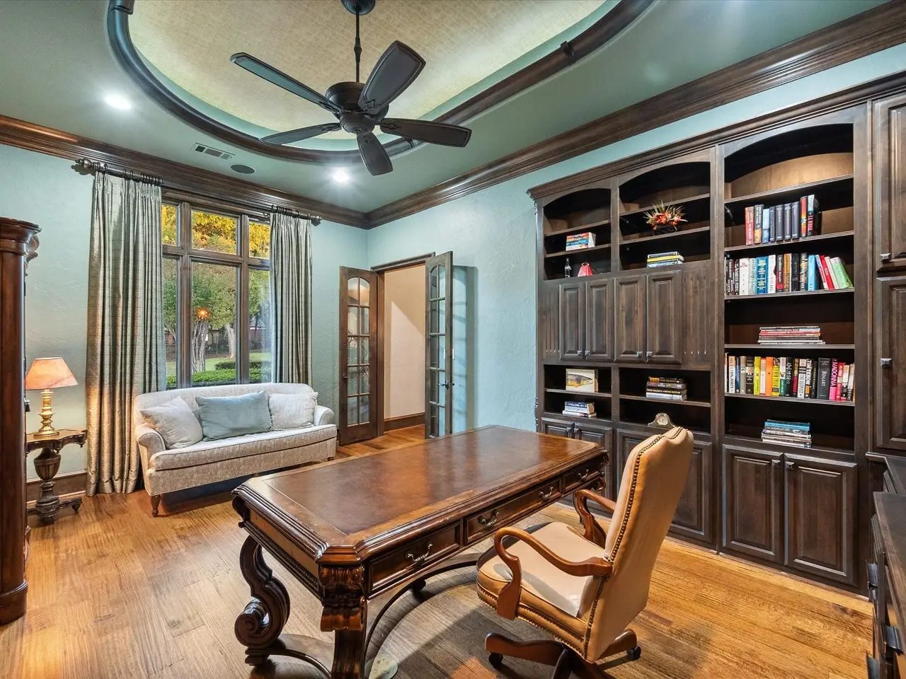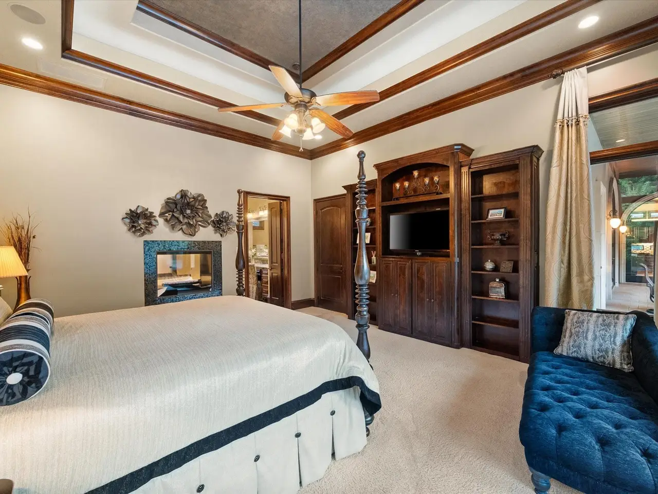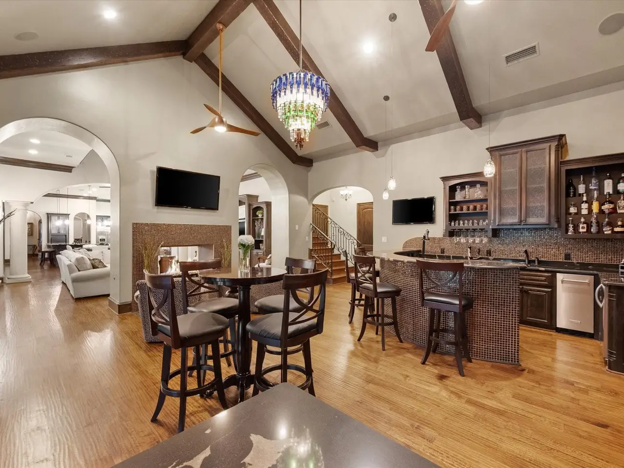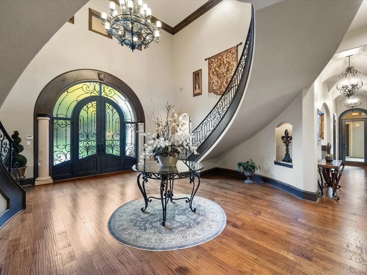 Welcome to a masterpiece of elegance and seclusion in Mansfield’s prestigious Strawberry Fields - a luxury estate where resort living and timeless design unite on two private, beautifully landscaped lots. Behind its stately stucco and stone facade, a grand foyer with a sweeping staircase sets the tone for sophisticated living. Step inside and discover hand-scraped hardwood floors throughout, soaring ceilings, and walls of Custom Marvin windows that bathe every space in natural light. Off the entry, a richly appointed study and formal dining room introduce the homes gracious flow. The primary wing is a private retreat, complete with a fireside bedroom overlooking the pool, a coffee bar with sink and refrigerator, and a spa-worthy bath featuring a Jacuzzi tub and custom cabinetry. Designed for entertaining, the heart of the home reveals a gourmet Thermador kitchen anchored by a striking custom copper vent hood, two dishwashers, butler’s pantry, and open sightlines to the formal living area and double-sided fireplace. A spacious bar with refrigerator, dishwasher and ice maker connects the formal and casual living areas, creating seamless gathering spaces. A second bedroom suite is conveniently located downstairs. Upstairs, movie nights shine in the media room with popcorn bar, flanked by two additional bedroom suites, a large living area, and a balcony overlooking the grounds. Outside, an award-winning pool - featured on HGTVs Cool Pools - steals the show, complete with a heated spa, dramatic fire bowls, multiple covered lounges with fireplace and bar, and a secluded lower fire pit. Expansive lawns offer room for play or future additions. A 4-car foam-encapsulated garage, air-conditioned workshop, Control4 whole-home smart system, tornado shelter, pet shower, and abundant storage ensure modern comfort and peace of mind. This is more than a home – it’s a resort-inspired sanctuary, crafted to impress and designed to be lived in beautifully.