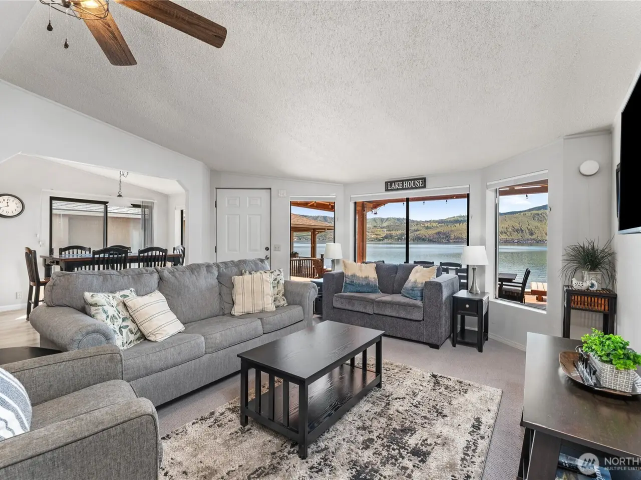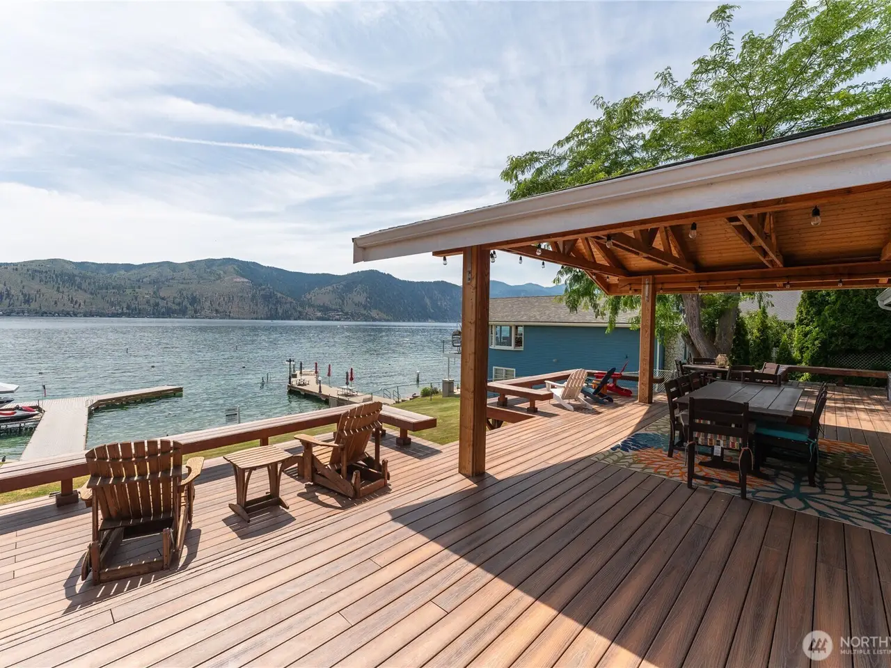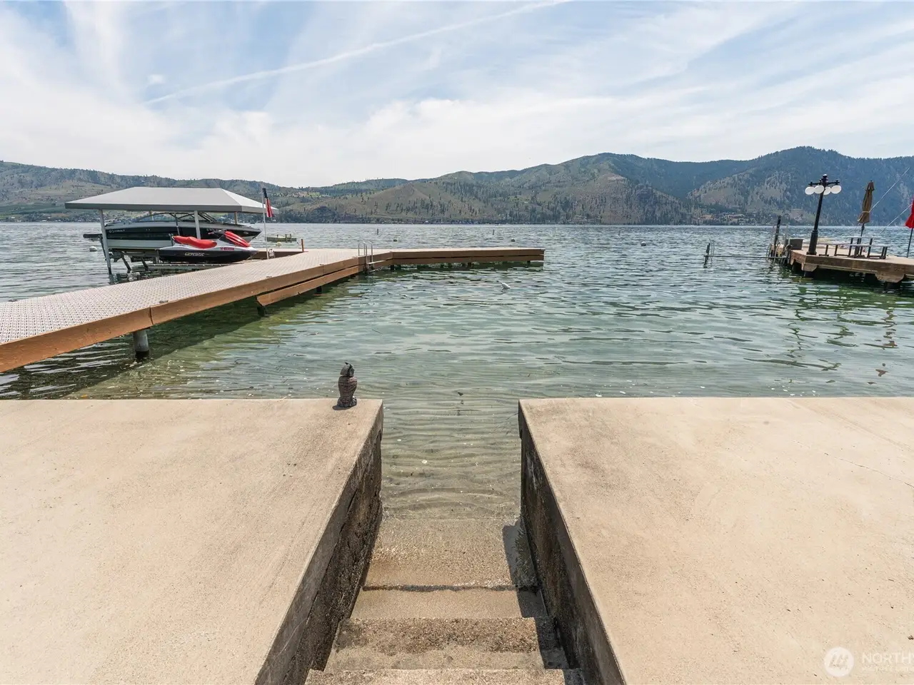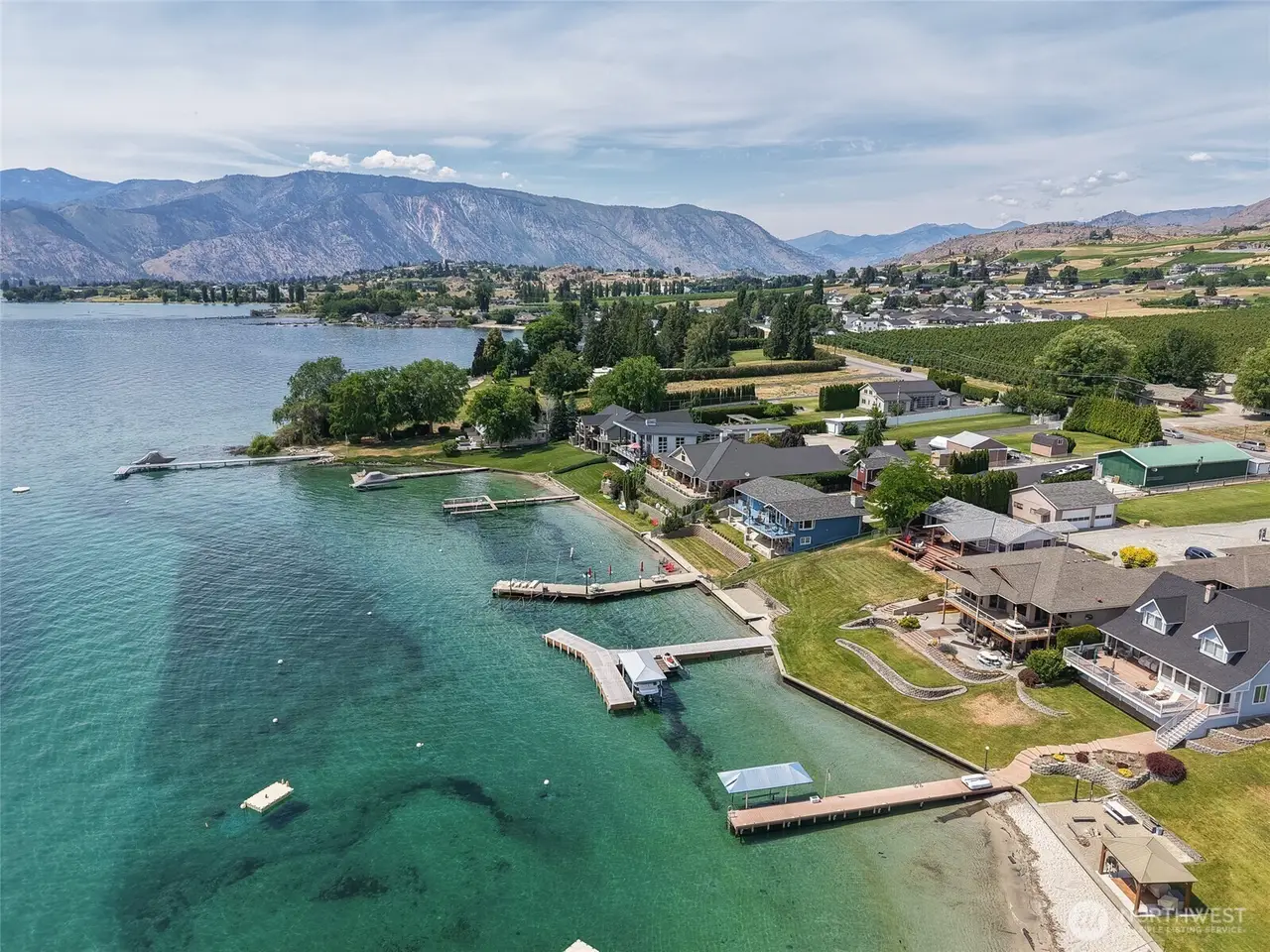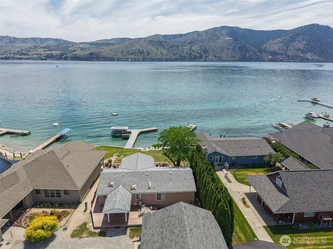 Welcome to 34 Leisure Lane! This rare .9-acre property boasts 56 feet of low bank waterfront with a concrete bulkhead and stairs to a sandy beach. Enjoy a resurfaced shared dock and a stunning, newer lake-facing deck off a charming three bed, two bath, 1,300 square foot home. Two lots (front and back) offer exceptional flexibility and space, including a three-bay shop, four RV hookups, and tons of parking. Mostly flat with a gentle slope - perfect for outdoor living and future development/building. Prime location with easy, level access off a paved road. On sewer, with LCRD domestic water and irrigation. One of the nicest stretches of real estate on Lake Chelan & amongst some incredible new homes and remodels. House plans by Complete Design can be included!