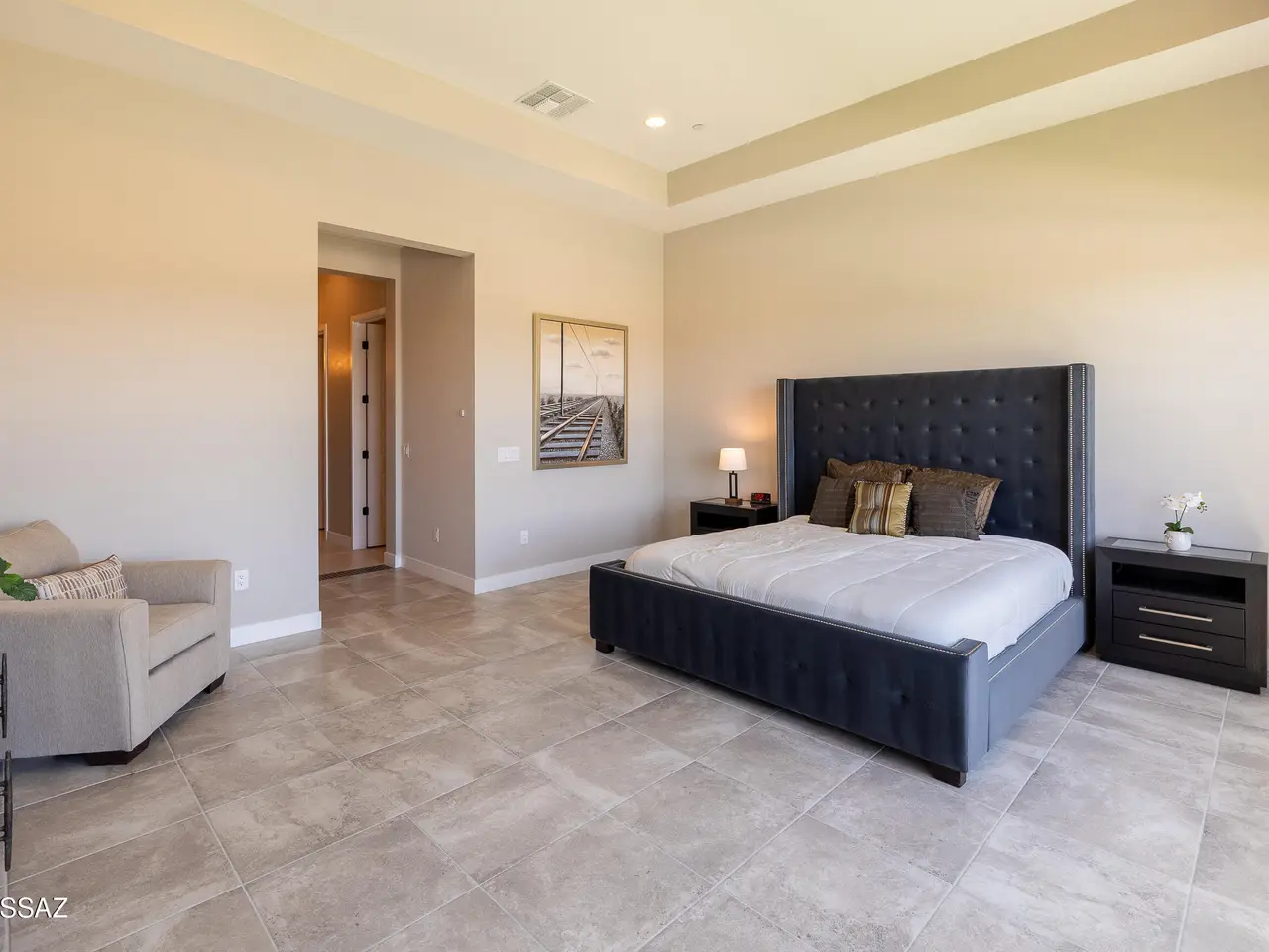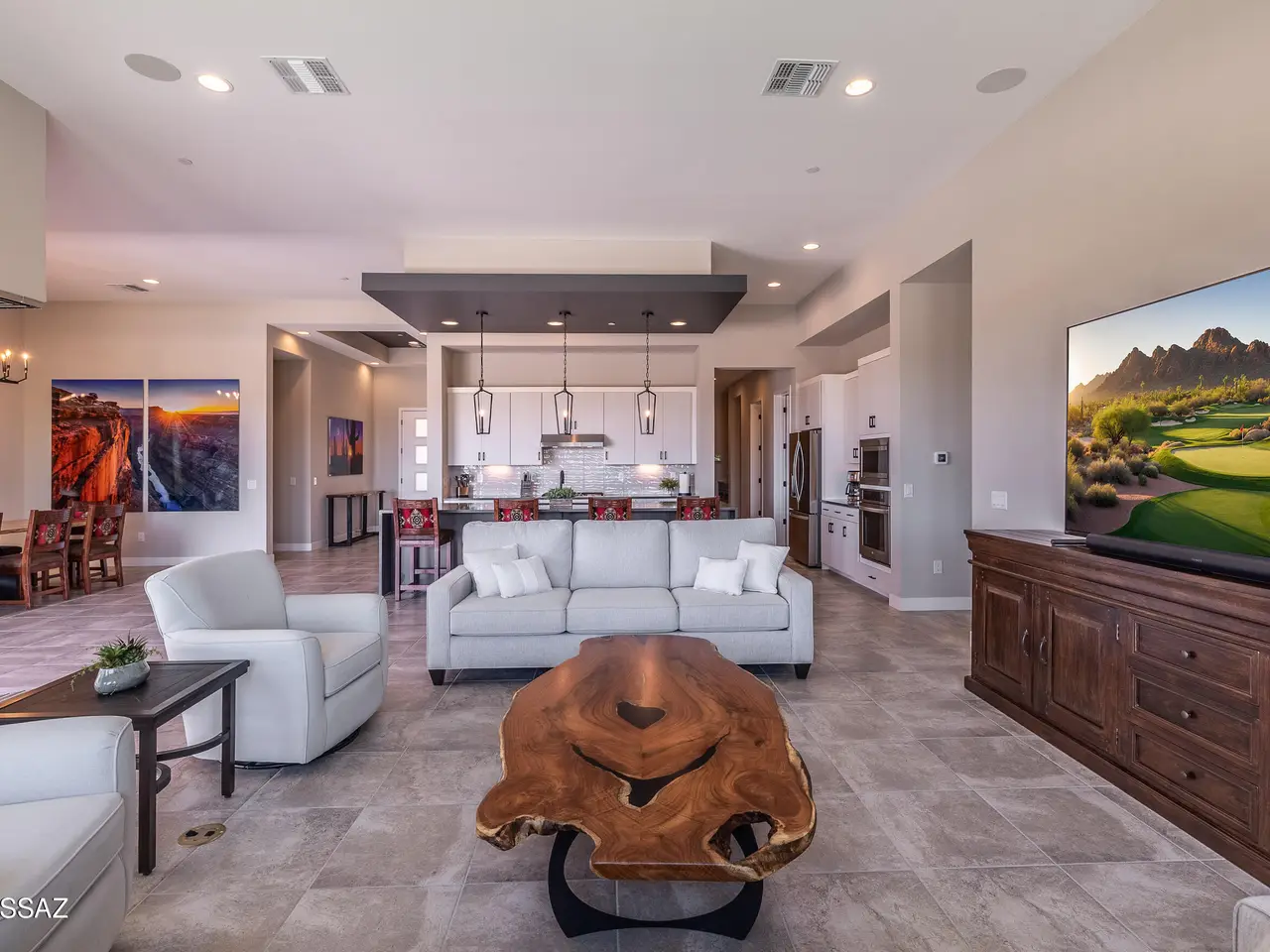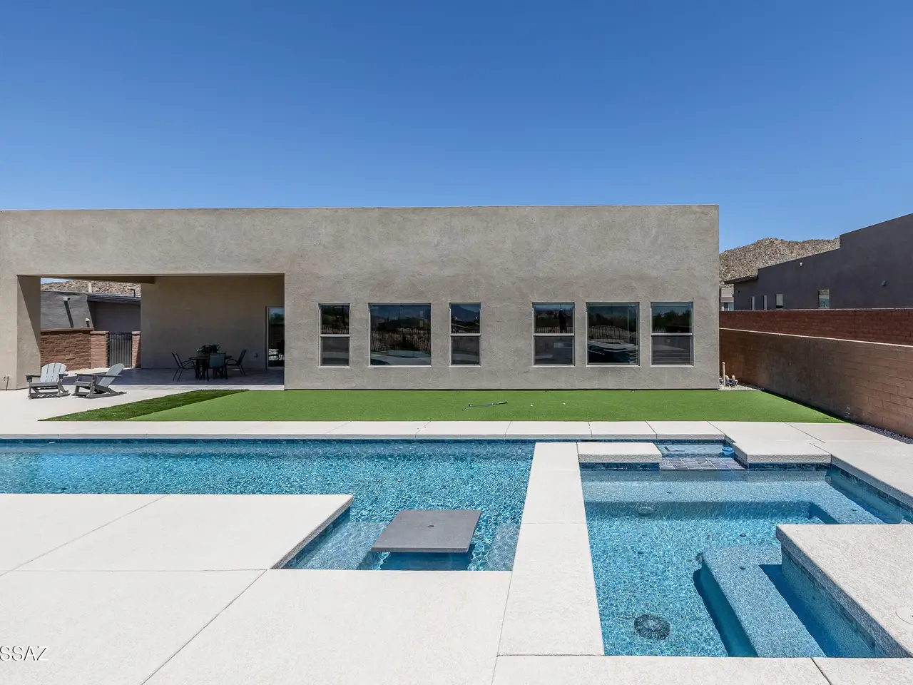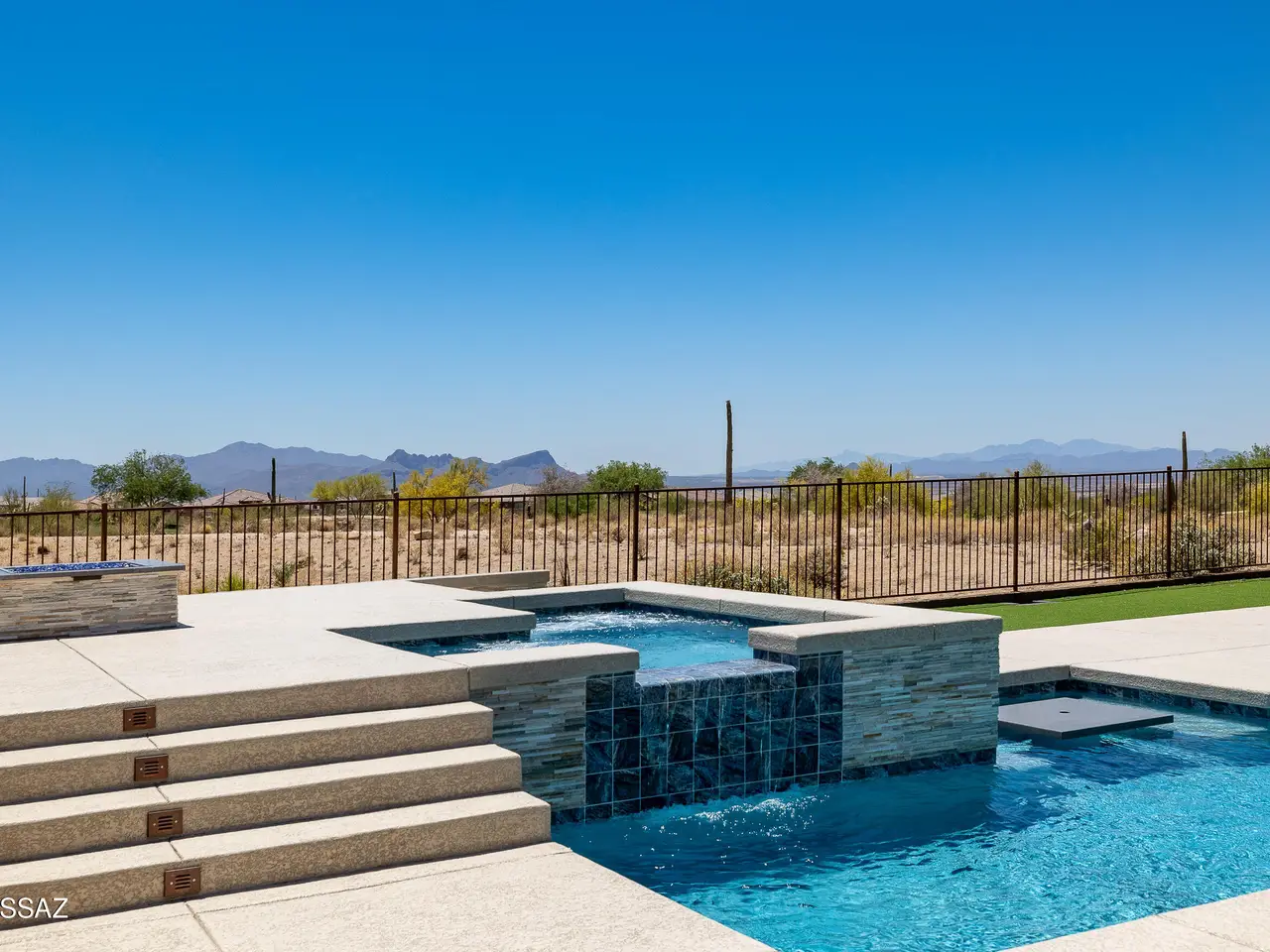 WOW best describes this stunning, relaxing, luxury-living-in-the-desert exquisite home at Fairfield's Boulder Bridge Pass. Owner has spared nothing to make this home the most inviting residence in the neighborhood. One of a kind 60ft heated lap pool let's you swim real laps- real exercise! Plus other casual entertainment: your own putting green & bocce ball court! Elevated spa & modern crushed glass firepit hosts beautiful mountain views. All at your own relaxing resort style home. No homes behind-natural desert buffer then the golf course beyond. Sunrise & sunset skies will mesmerize you at different times of the year. Panoramic mountain views throughout backyard. Deep & spacious under porch area + private (and rare for the subdivision) front courtyard. Great for private relaxation. + This Sycamore model has been modified to become a full 4 bedroom all w/private ensuite bathrooms - & of course an extra powder room. Grand open great room concept living. Spacious kitchen island bar, grand dining area, and additional private den or bonus room. Drop station as you enter the home through garage (which is an oversized 3 car garage w/tankless water heater. Expansive laundry room w/utility sink and mini mud room/hallway. Darkening room tight window shades in all bedrooms. Kitchen is state of the art w/LG stainless appliances. NO carpet in home! Stylish and modern 12'x8ft high corner meet Multi-Slide door in great room/dining. Clean, crisp & new. Home barely lived in. Still has new home feel! Lovely custom front landscape design just installed May 2025. This is a spectacular home - new and absolutely beautiful with basically nothing left to do but move in and enjoy your oasis resort style living in the desert!