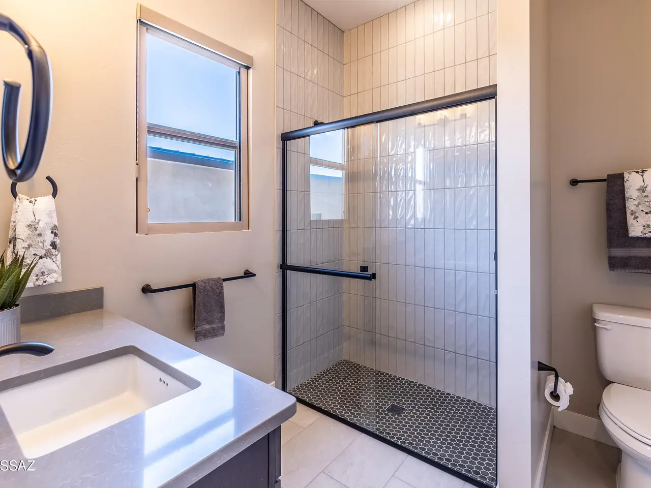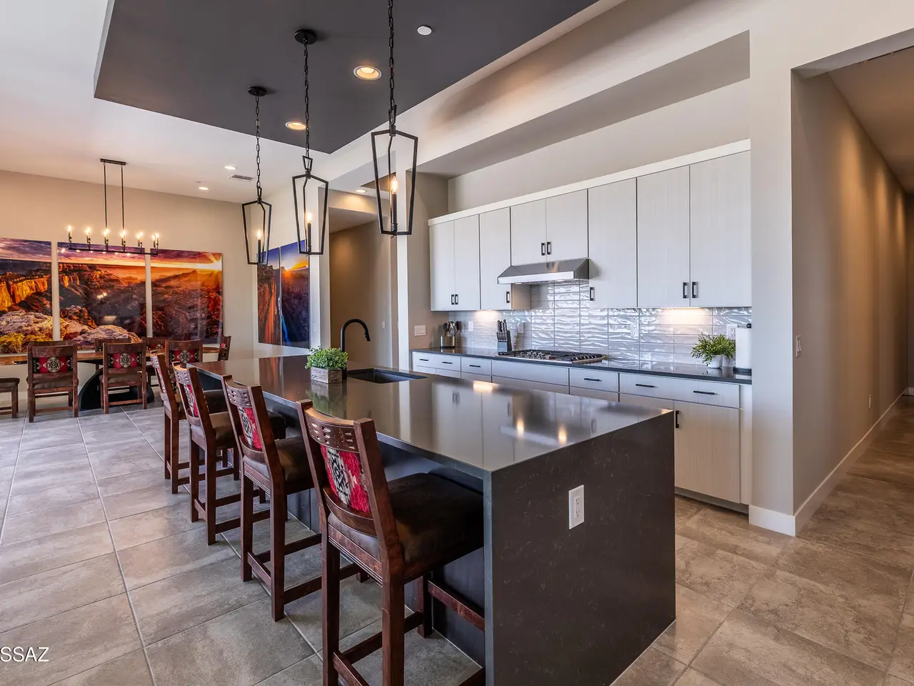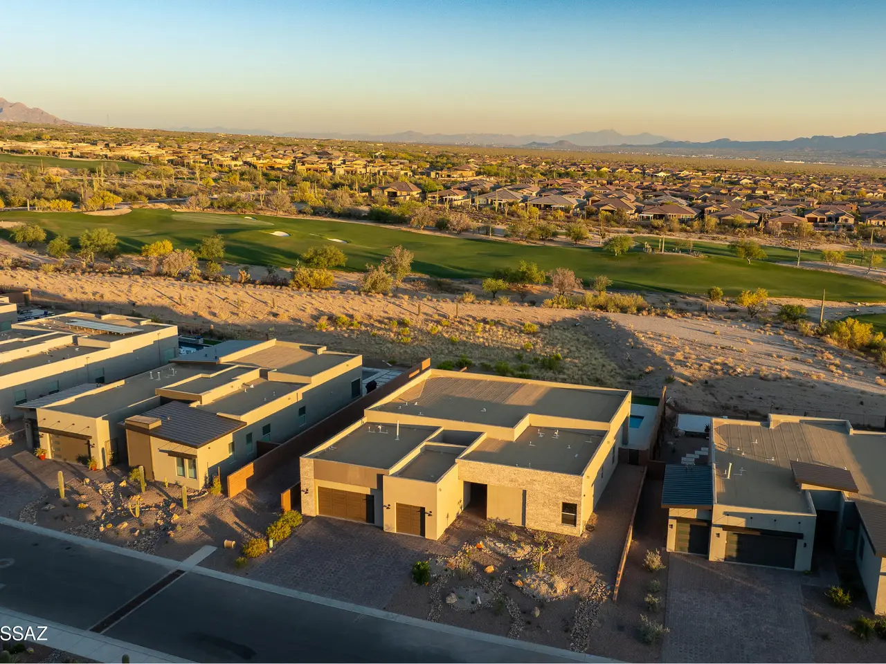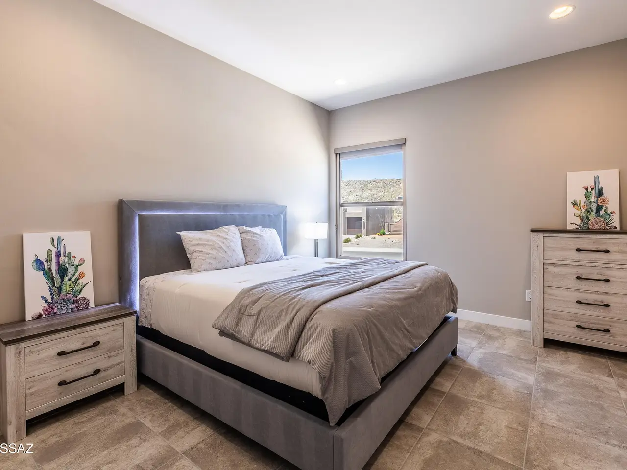WOW best describes this stunning, relaxing, luxury-living-in-the-desert exquisite home at Fairfield's Boulder Bridge Pass. Owner has spared nothing to make this home the most inviting residence in the neighborhood. One of a kind 60ft heated lap pool let's you swim real laps- real exercise! Plus other casual entertainment: your own putting green & bocce ball court! Elevated spa & modern crushed glass firepit hosts beautiful mountain views. All at your own relaxing resort style home. No homes behind-natural desert buffer then the golf course beyond. Sunrise & sunset skies will mesmerize you at different times of the year. Panoramic mountain views throughout backyard. Deep & spacious under porch area + private (and rare for the subdivision) front courtyard. Great for private relaxation. + This Sycamore model has been modified to become a full 4 bedroom all w/private ensuite bathrooms - & of course an extra powder room. Grand open great room concept living. Spacious kitchen island bar, grand dining area, and additional private den or bonus room. Drop station as you enter the home through garage (which is an oversized 3 car garage w/tankless water heater. Expansive laundry room w/utility sink and mini mud room/hallway. Darkening room tight window shades in all bedrooms. Kitchen is state of the art w/LG stainless appliances. NO carpet in home! Stylish and modern 12'x8ft high corner meet Multi-Slide door in great room/dining. Clean, crisp & new. Home barely lived in. Still has new home feel! Lovely custom front landscape design just installed May 2025. This is a spectacular home - new and absolutely beautiful with basically nothing left to do but move in and enjoy your oasis resort style living in the desert!