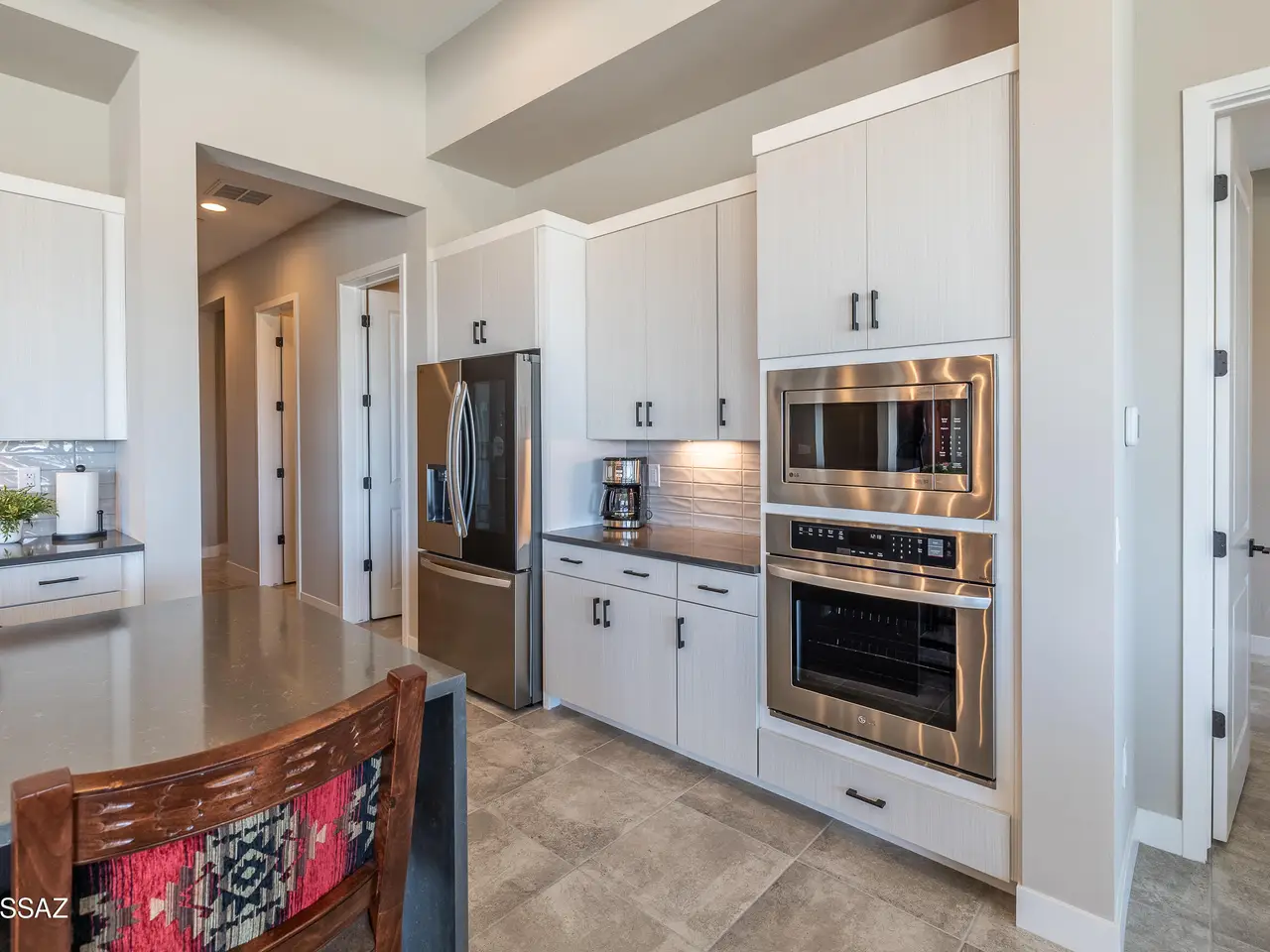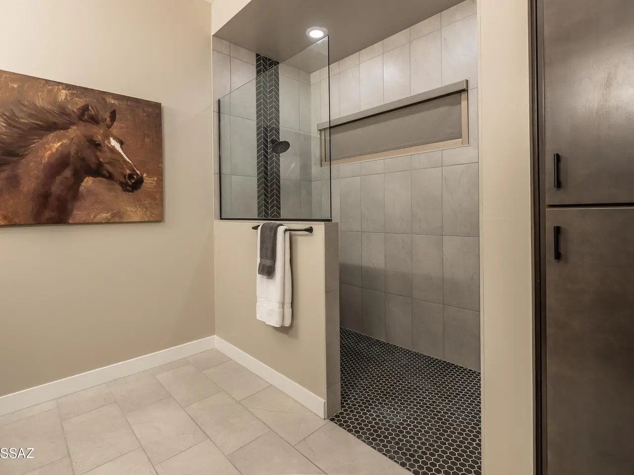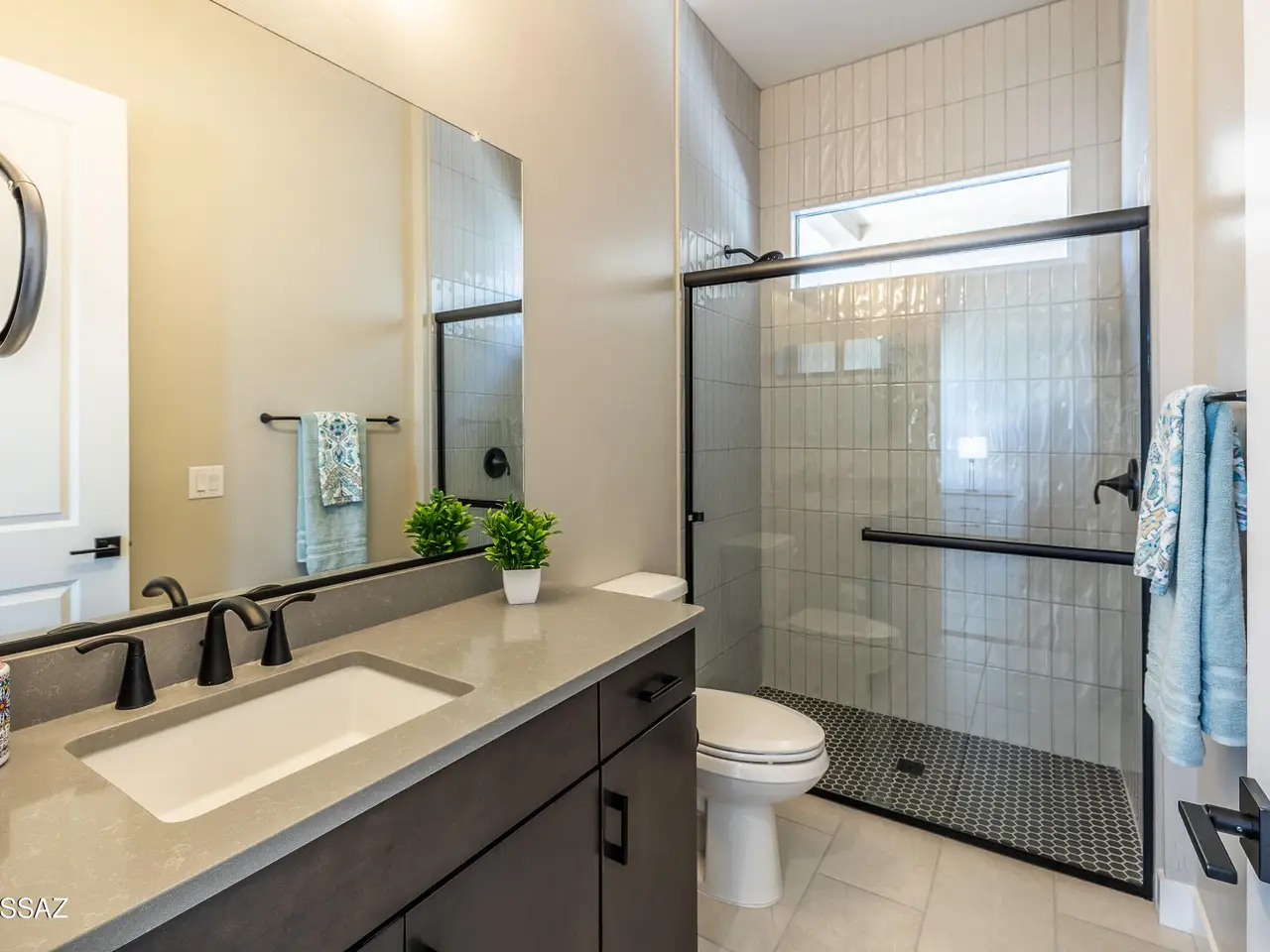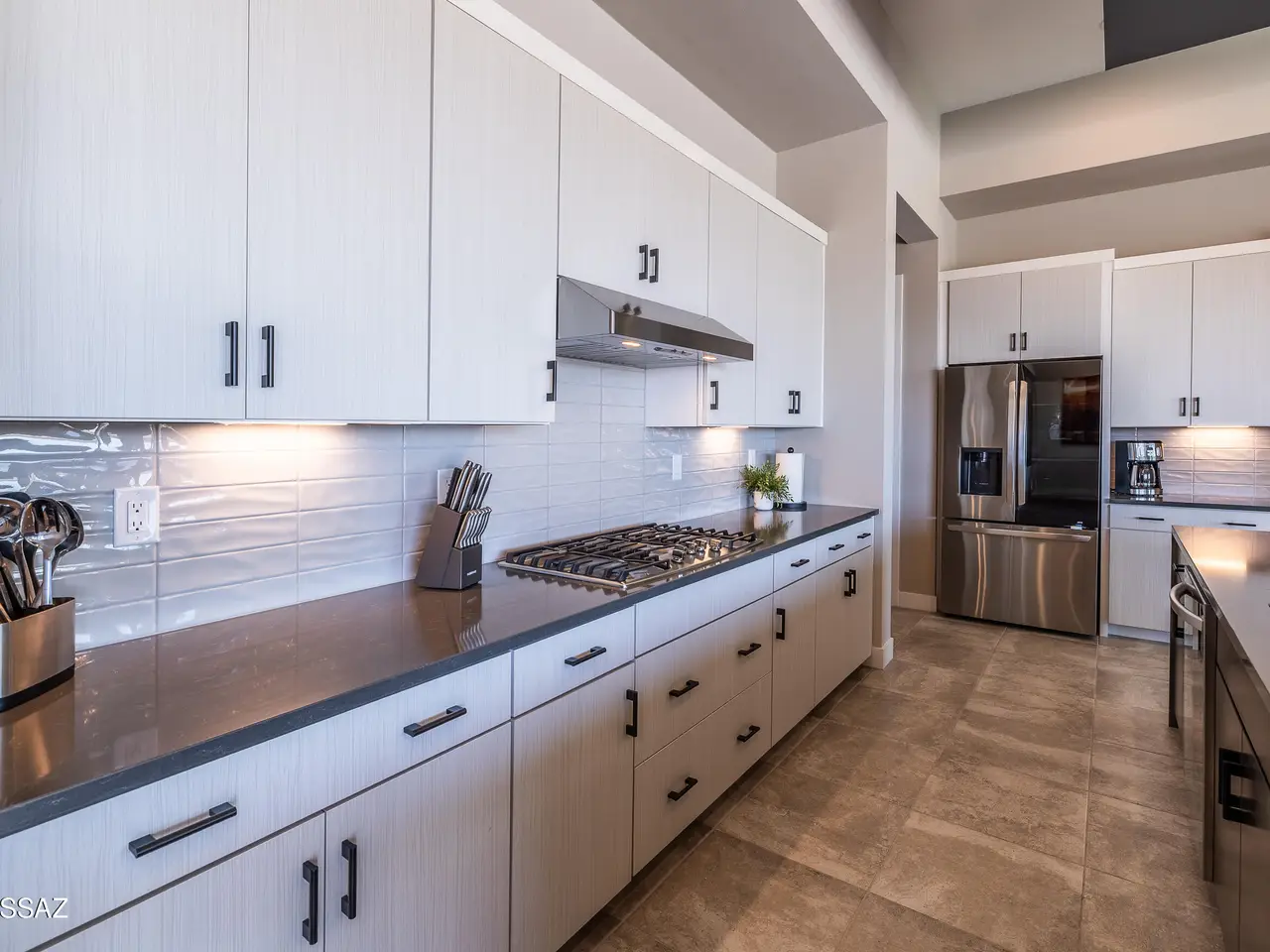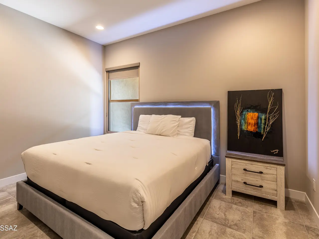 WOW best describes this stunning, relaxing, luxury-living-in-the-desert exquisite home at Fairfield's Boulder Bridge Pass. Owner has spared nothing to make this home the most inviting residence in the neighborhood. One of a kind 60ft heated lap pool let's you swim real laps- real exercise! Plus other casual entertainment: your own putting green & bocce ball court! Elevated spa & modern crushed glass firepit hosts beautiful mountain views. All at your own relaxing resort style home. No homes behind-natural desert buffer then the golf course beyond. Sunrise & sunset skies will mesmerize you at different times of the year. Panoramic mountain views throughout backyard. Deep & spacious under porch area + private (and rare for the subdivision) front courtyard. Great for private relaxation. + This Sycamore model has been modified to become a full 4 bedroom all w/private ensuite bathrooms - & of course an extra powder room. Grand open great room concept living. Spacious kitchen island bar, grand dining area, and additional private den or bonus room. Drop station as you enter the home through garage (which is an oversized 3 car garage w/tankless water heater. Expansive laundry room w/utility sink and mini mud room/hallway. Darkening room tight window shades in all bedrooms. Kitchen is state of the art w/LG stainless appliances. NO carpet in home! Stylish and modern 12'x8ft high corner meet Multi-Slide door in great room/dining. Clean, crisp & new. Home barely lived in. Still has new home feel! Lovely custom front landscape design just installed May 2025. This is a spectacular home - new and absolutely beautiful with basically nothing left to do but move in and enjoy your oasis resort style living in the desert!