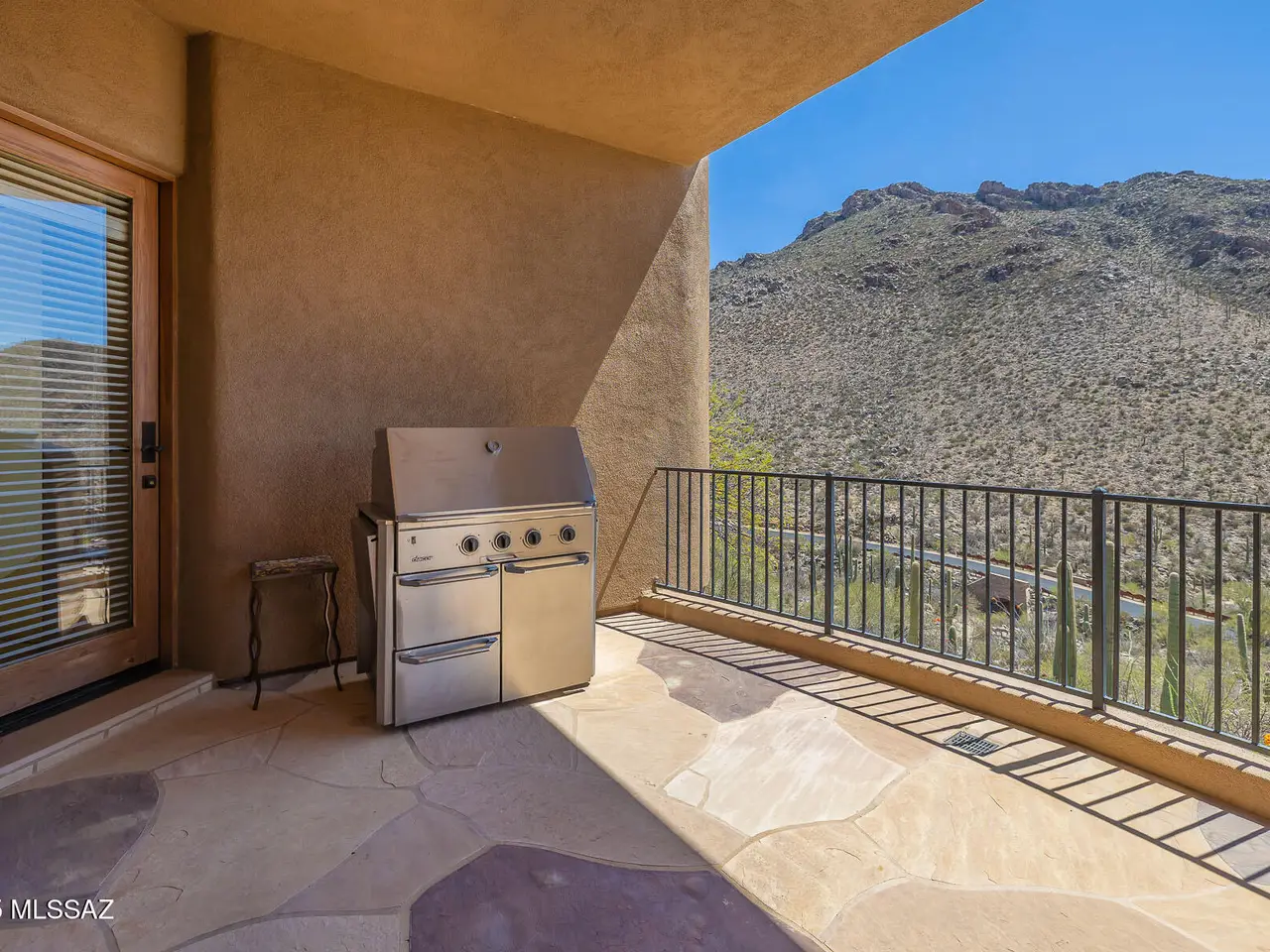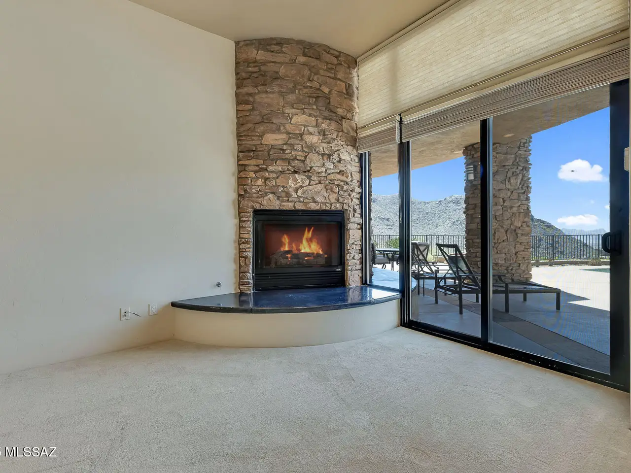 LUXURIOUS CUSTOM ESTATE sits high nestled against the Tortolita Mountains in the premier, guard gated community of Canyon Pass at Dove Mountain. Enjoy breathtaking panoramic views of the canyon, valley and mountains beyond... plus a sparkling, heated pool. Gated drive winds to a flagstone patio entrance with orbital water fountain. This 3, 665 sq ft residence affords 4 bedrooms and 4 full baths plus den/office. Large gathering room greets you with soaring ceilings, wall-to-wall view windows, corner stacked stone fireplace and custom art/media center. Formal dining area with views lies off a gourmet kitchen offering large island with prep sink, granite slab countertops, stainless/black appliances, built-in workstation and pantry, plus wood paneled Sub-Zero refrigerator/freezer, Dacor microwave and Asko dishwasher. Elegant Owner's suite accesses rear patio and hosts a stacked stone fireplace and luxury bath with granite covered vanity, jetted tub, circular tiled walk-in shower plus dual walk-in closets. Bedrooms 2 & 3 offer luxury en suite baths. Bedroom 4 lies off hall bath. Other luxury amenities include flagstone flooring, alderwood cabinets, curved walls & windows, stacked stone outdoor columns & interior accents, custom closets, skylights, art niches, recessed ceilings & clerestory windows. Extended laundry with sink, zoned heating/cooling and water heaters, plus 3-car extended garage with customized storage room. Security features include gated driveway, alarm and fire suppression. Retreat to a spectacular rear oasis with flagstone patio accents, wrought iron view fence, heated pool with rock waterfall plus breathtaking panoramic views. Dove Mountain is home to the Ritz-Carlton Resort & Spa, Gallery Golf & Sports Club, Golf Club at Dove Mountain, plus sport parks and hiking/biking trails.