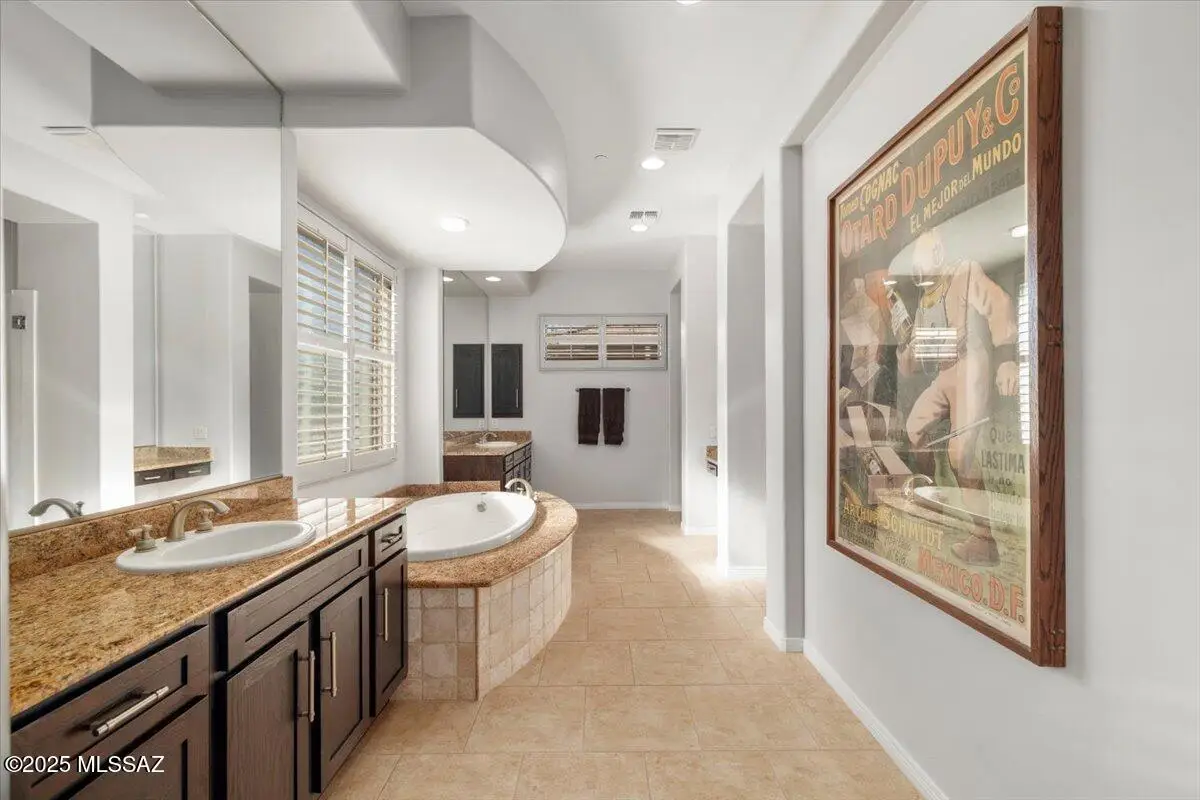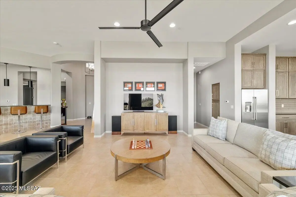 Discover sophisticated desert living in this beautifully upgraded Toll Brothers estate, perfectly positioned on the 11th fairway of The Gallery North Course in the exclusive gated community of Solana at Dove Mountain. Set on a private 0.51-acre lot in the scenic Tortolita Mountain, this architectural masterpiece showcases sweeping golf course, mountain, and sunset views through panoramic walls of glass. Inside, the heart of the home is a striking gourmet kitchen featuring a nearly 15-foot quartz island, custom oak cabinetry, GE Cafe appliances, a 36'' gas range with downdraft, and a sleek toffee-toned backsplash perfect for both everyday living and upscale entertaining.
