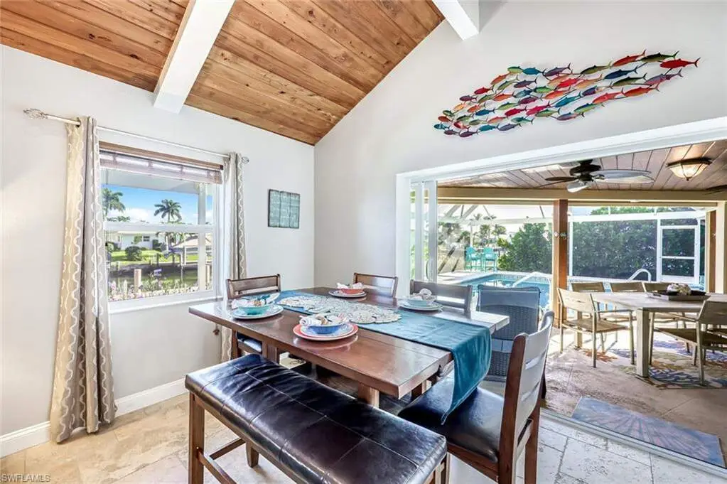 Steps from Tigertail Beach lies this coastal retreat that captures the essence of island living with effortless style and comfort. Completely reimagined from top to bottom with over $300,000 in thoughtful updates, this 3 bedroom, 3 bath home is move-in ready and built to impress. Behind its charming nautical exterior lies a light-filled open layout featuring a comfortable living area, dining space, and inviting family room with volume ceilings accented by a striking stone fireplace and warm cedar ceiling details. The gourmet kitchen showcases crisp white shaker cabinetry, quartz counters, stainless-steel appliances, and a large island perfect for entertaining. The primary suite has dual closets, and a stunning spa-inspired bath with a walk-in glass and tile shower, and granite countertops. Step outside to the expansive lanai with cedar ceiling trim, a saltwater pool, and a paver deck framed by a panoramic screen enclosure. Boating enthusiasts will appreciate two docks with a 12,000-lb lift, reinforced seawall, and an elevated sun deck ideal for relaxing by the water. Modern upgrades include stone flooring throughout, impact windows and sliders, a new roof in 2022, updated electrical and plumbing systems, and a newer A/C. With no storm damage, complete storm protection, and a premier location within walking distance to Tigertail Beach and north of Collier Boulevard, this property is not only an ideal full-time residence but also a top choice for rental income.