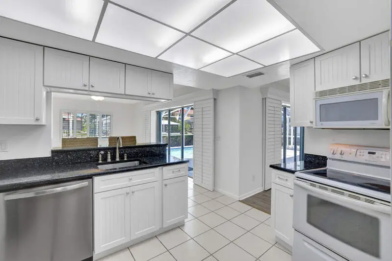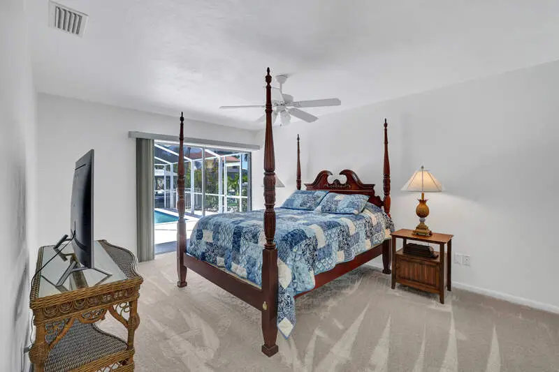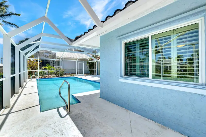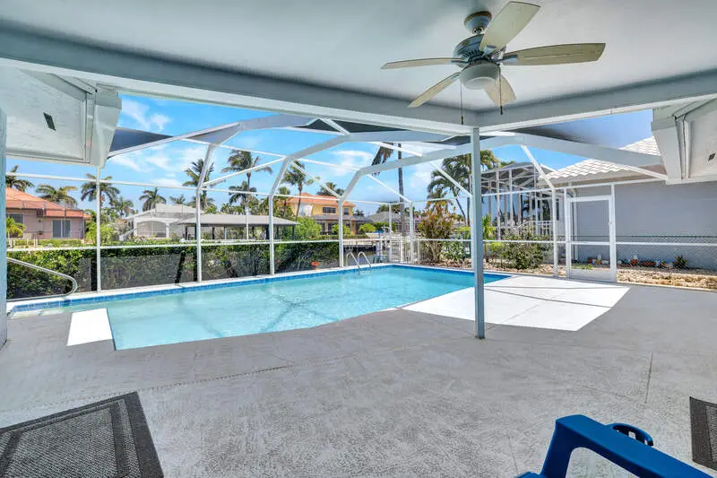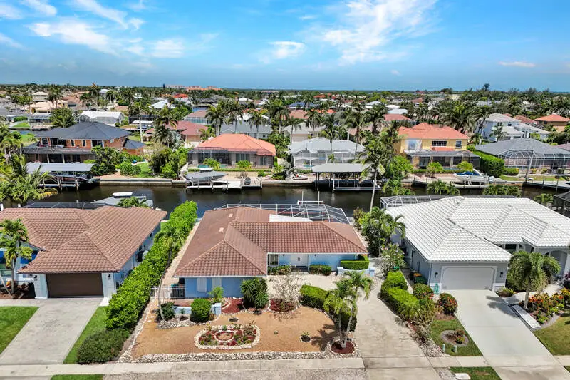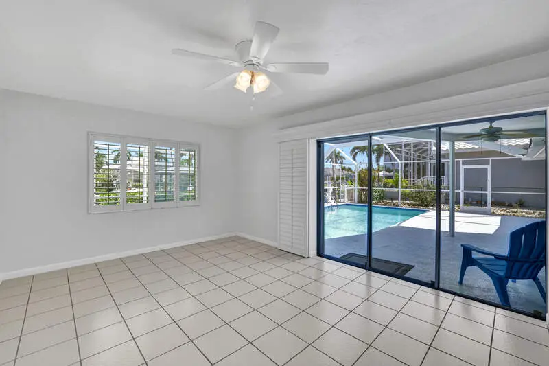 Exceptional value on this beautifully maintained waterfront pool home located on a quiet cul-de-sac with desirable southeast exposure for all-day natural light. This 3-bedroom, 2-bath home offers a bright and open layout with plantation shutters, tile plank and carpet flooring, and a welcoming double-door entry. The kitchen features white cabinets, granite countertops, stainless steel appliances, and a pantry. The spacious primary suite includes private outdoor access, while two guest bedrooms share a full bath. Enjoy outdoor living on the screened lanai (2019) overlooking the retiled and resurfaced pool (2017). Additional upgrades include new HVAC (2023), water heater (2023), roof (2017), and garage door (2018). A new seawall is scheduled for 2025 or 2026. The low-maintenance yard is a tropical retreat with a mature avocado tree, plumeria, and hurricane shutters for added protection. This move-in ready home offers comfort, peace of mind, and true Florida living-ideal for full-time or seasonal enjoyment.