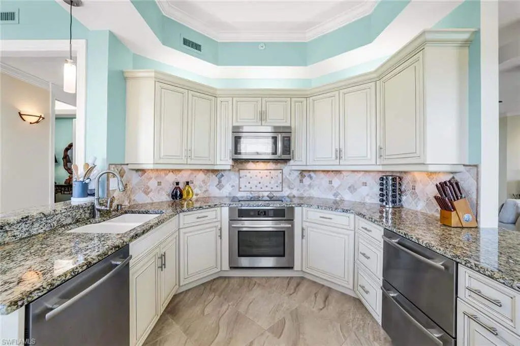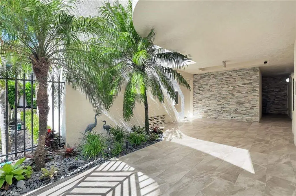 Enjoy stunning long water views from this private, full-floor residence in a boutique, low-density building. This spacious 4-bedroom, 3-bath condominium includes a deeded dock with 12,000 lb lift and offers direct access to the Gulf. Expansive windows and sliders fill the home with natural light, while a front terrace captures sunsets, a 300 sq. ft. lanai provides generous outdoor living, and a large waterside patio enhances the waterfront lifestyle. Updates include a new AC and water heater in 2024, all impact glass throughout exterior, and motorized storm shutters. The renovated kitchen features stainless steel JennAir appliances including an additional drawer refrigerator and freezer with ice maker, quartz counters, wine cooler, wet bar, and custom cabinetry. The spacious primary suite offers bay windows, a sitting area, and a bath with double vanity with brand new quartz counter, tub, and shower. Two guest suites with private baths plus a den with closet provide flexible living. A laundry room with sun balcony and a private air conditioned, oversized 2-car garage with epoxy flooring complete this exceptional property. Condo living with all the luxuries of a private home but less to worry about!
