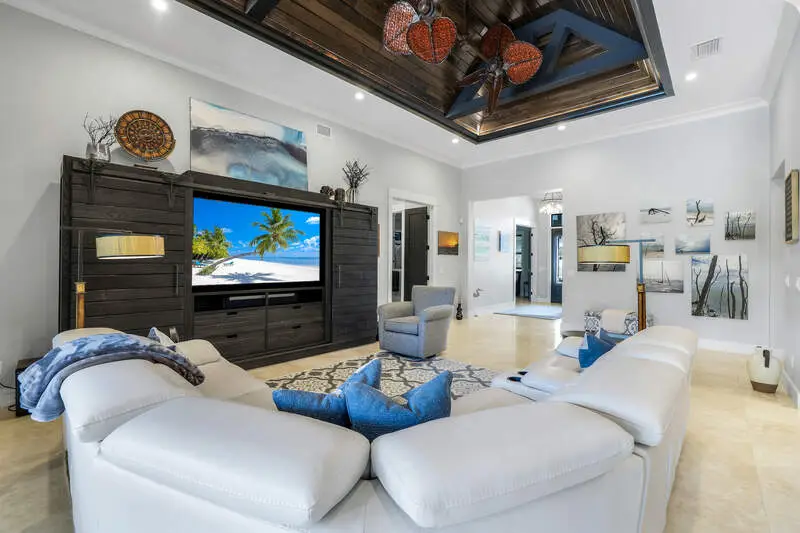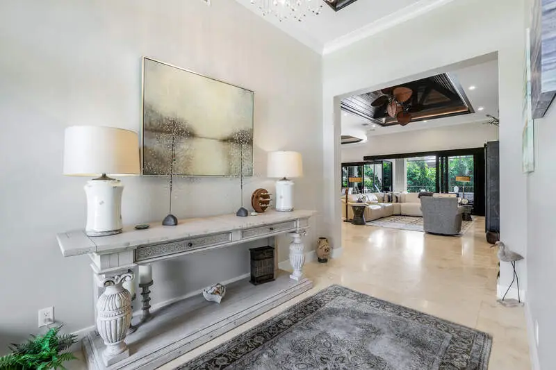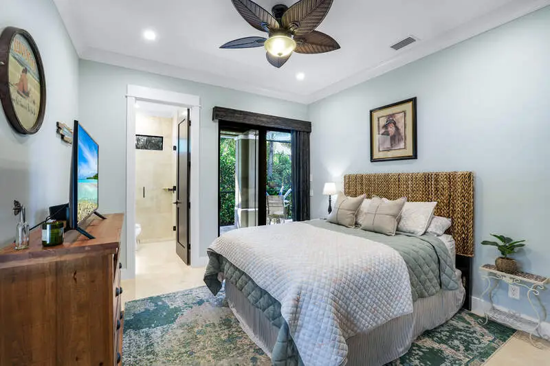 Stunning 5-bedroom, 4-bath custom home just half a mile to South Beach access and minutes from shopping, dining, and the movie theater. This beautifully designed custom built residence features soaring ceilings, impact windows and doors, travertine tile throughout, and a spacious split floor plan with a primary suite plus den on one side, and three en-suite guest bedrooms on the other. The gourmet kitchen includes a gas cooktop, large island with abundant storage, walk-in pantry, and built-in bar with wine cooler. The living area impresses with 90-degree sliders and a custom wood-inlaid decorative ceiling. The primary suite offers corner sliders, his-and-her California closets, a spa-style bath with large walk-in shower, dual vanities, and private commode. Step outside to a spacious lanai with outdoor kitchen, electric shutters, and a private pool and spa with 3 waterfalls, surrounded by lush privacy hedges. Also features a pool bath, epoxy-coated garage floors with custom storage, and both a circular and side driveway for added convenience. Turnkey furnished and ready to move right in!
