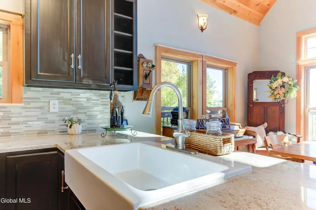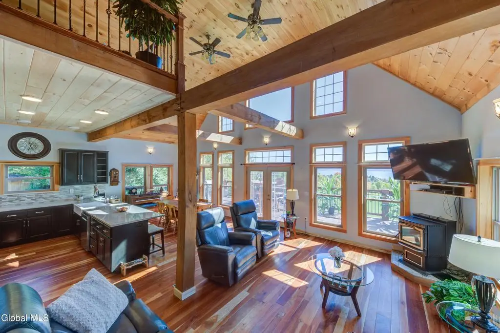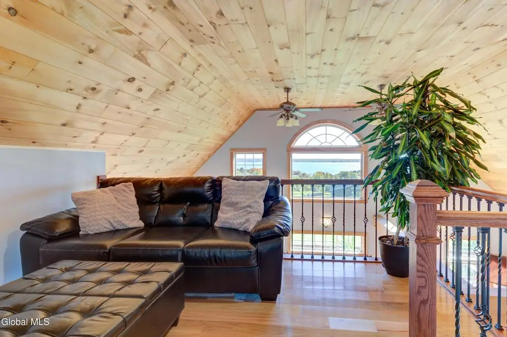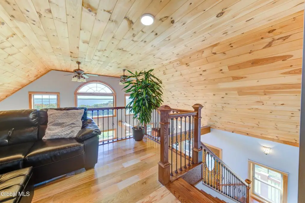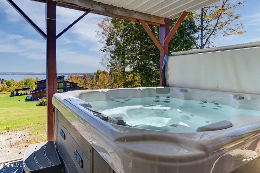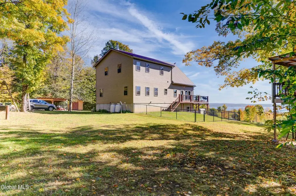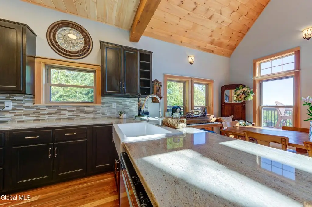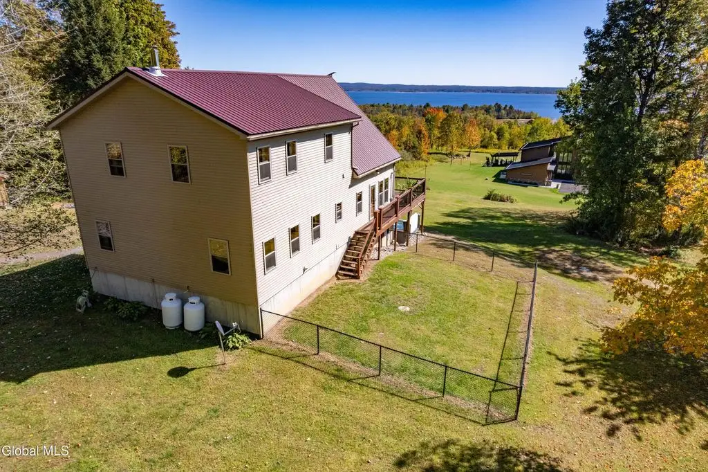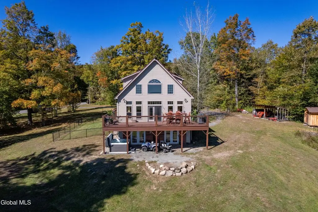 Stunning Lake & Mountain Views! Perched high on a ledge overlooking the Great Sacandaga Lake, this custom Chalet-style home sits on over 10 acres with a 10' beach permit a short drive away for lake access. Tucked away on a private dead-end road in the Mayfield School District, this 4-bedroom, 3-bath home offers the perfect blend of seclusion and convenience.Inside, the soaring vaulted ceilings and wall of windows in the Great Room showcase breathtaking lake and mountain views. The gourmet kitchen features custom hand-crafted cabinetry, granite countertops, and a spacious breakfast bar - a perfect gathering place for family and friends. A full walkout lower level provides additional living space potential, ready for your finishing touches. Step outside to the expansive wraparound deck, the ideal place to entertain or simply relax surrounded by nature. Unwind on the covered patio in the newer hot tub - perfect for soaking in the peaceful setting after a long day. A true Adirondack retreat with endless possibilities!