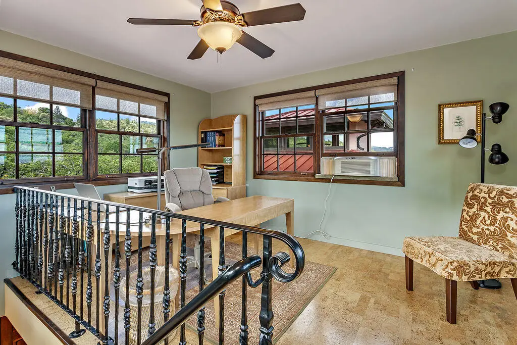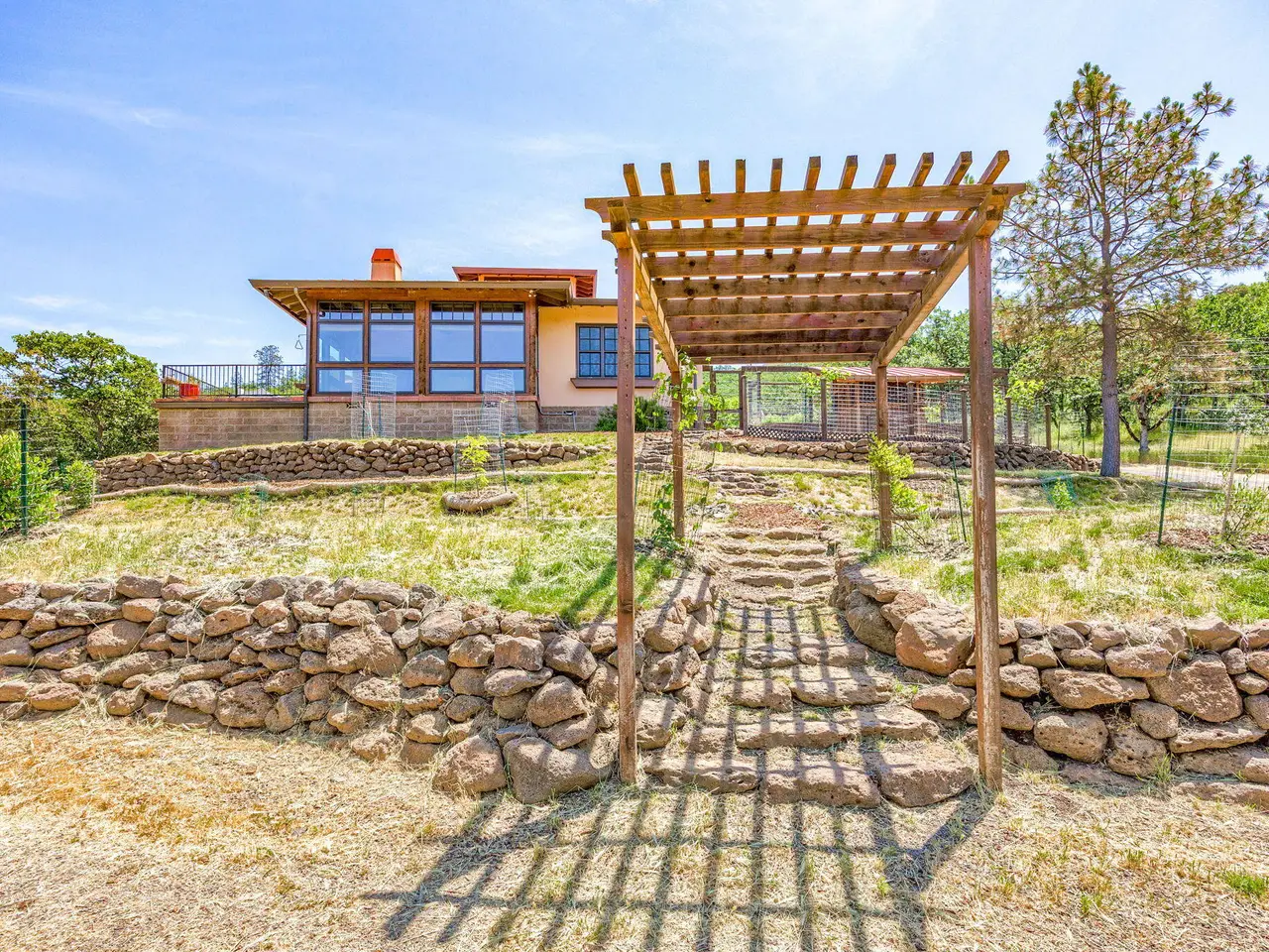 Custom Strawbale-insulated serene spa-like living w/stunning views. Paved drive w/elec gate opens to 6.62 fncd acres w/organic garden. Stucco ext w/fenced courtyard, flagstone walkways, heated swimming pool, palm trees, window boxes & nite lighting. Wood-clad alum windows. Cupolas w/elec windows. Finished 2 car garage plumbed for bathroom. Stunning interior bamboo and cork floors, great room w/10' beamed ceiling & soapstone wdstv. 8' French doors lead from dining room to sunroom which opens to patio. Open kitchen has 5 burner cooktop, dbl conv ovens, coffee bar, granite counters & cherry cabinets. Mstr suite opens to courtyard, includes dbl sinks, claw foot tub, glass shower & tiled floors. Guest ste & 3rd bedroom/den leading to crtyrd. Upstairs 230 sf office w/360˚ views. 1200 sf insul out-bldg wired for 220, HVAC, full bath, mini kitchen, professional recording studio or home theater, 300 sf deck w/valley views & 1000 sf carport. Irrigated w/10,000-gallon rainwater catchment