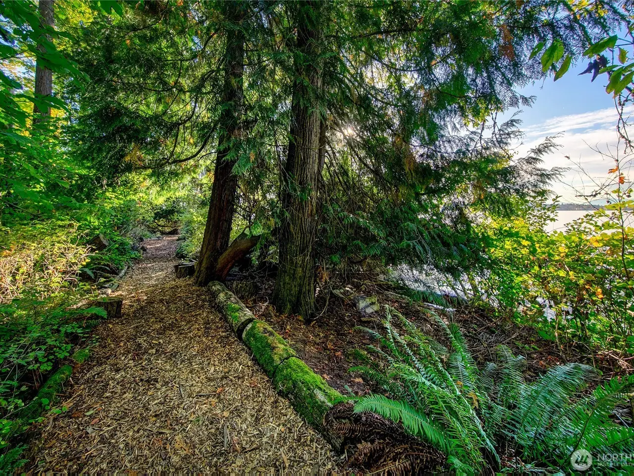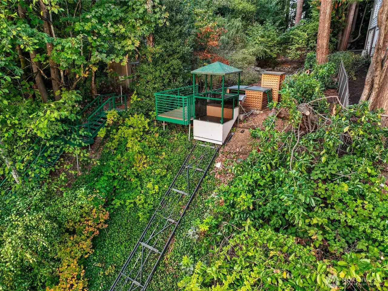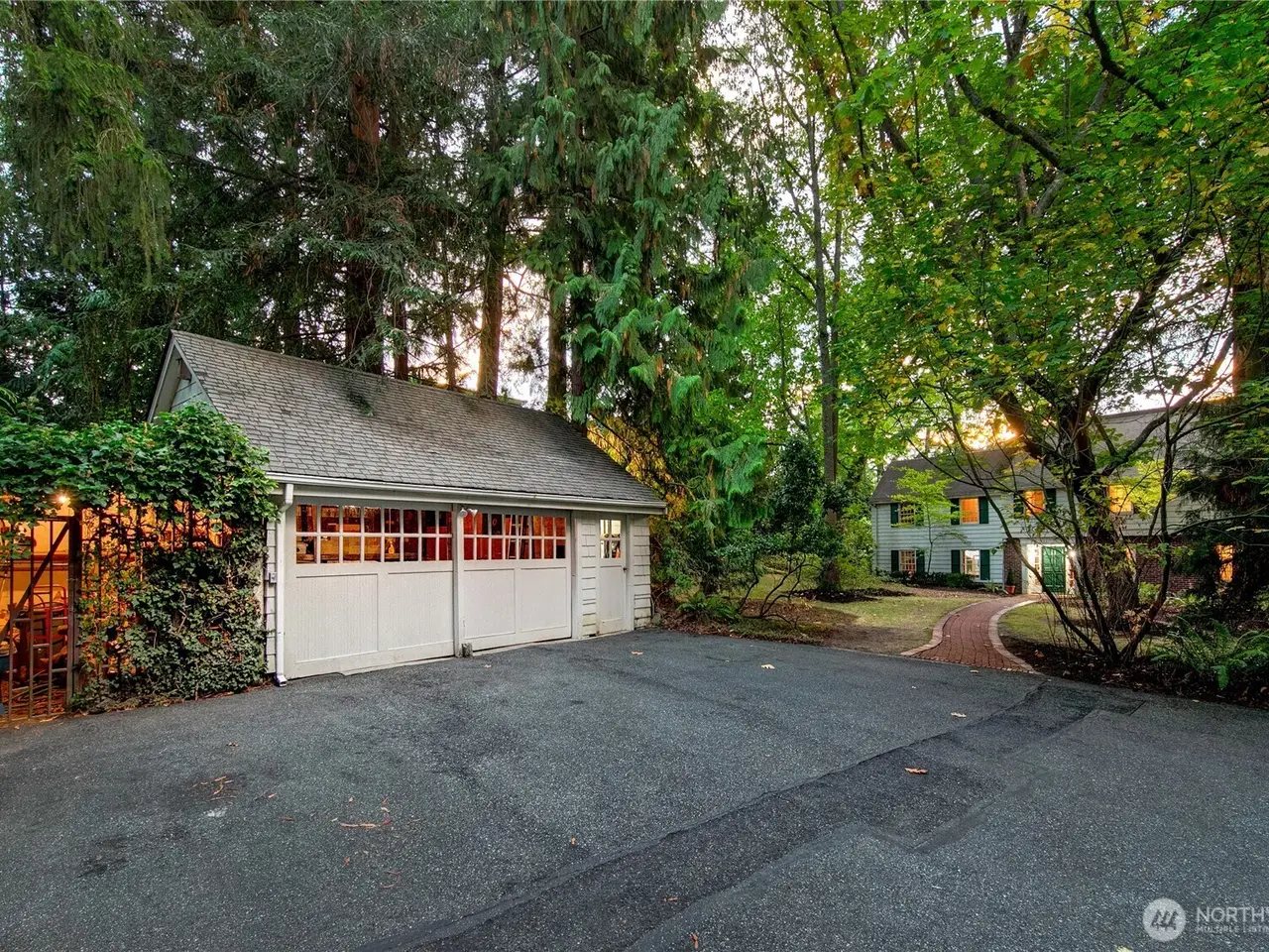 Evergreen Lakeshore Preserve. 3 wooded acres on Medina's ultra-affluent Gold Coast: 215 ft Lk Washington waterfront, accessed by private hillside tram, with 70-ft dock; 1938 5170 SF main residence; various smaller outbuildings. Panoramic view of boat traffic, vivid sunsets, serene Olympic Mtns. Conservation easement prevents subdivision, protects fragile habitats, creates privacy and peace – minutes from energy and excitement of Bellevue tech, world-class restaurants and retail, fabled mansions of founders and magnates. Erect your dream compound! Provision for renovation/replacement of existing structures within original footprint; city zoning allows vertical expansion. Extensive documentation includes architect's feasibility study.