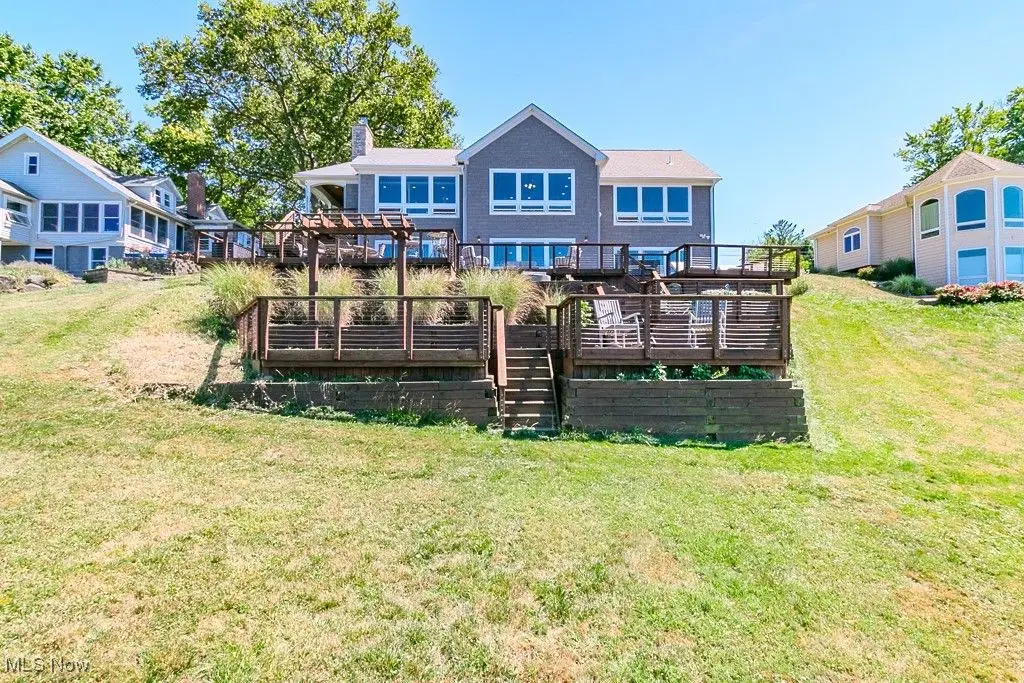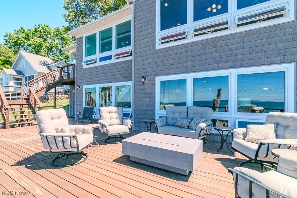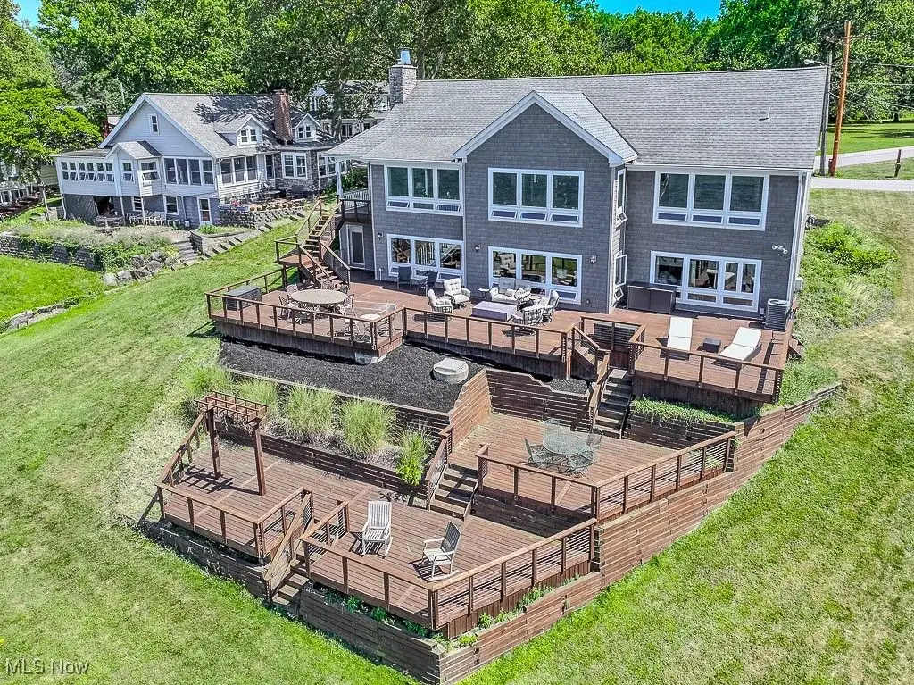 Welcome to your dream lakefront retreat on highly desirable Headland Road Beach! Built to last in 2012, this stunning ranch home sits on 1.4 acres of paradise with 104 feet of Lake Erie frontage. The house is built on a superstructure constructed of a series of 36 Caison's piers, 36" in diameter on perimeter points of the house, which extend 24 feet below the surface to the bedrock which then is tied to the surface in a 3' x 4' feet grade beam which the structure is built upon. It was designed by structural engineer Isaac Lewin one of Cleveland's top structural engineers, and then Built by JLJI Specialty contractors which is one of the top leading contractors in the Cleveland area. Elevated for panoramic water views, the home offers a perfect blend of luxury and comfort. Step onto the charming wraparound porch and take in the view from the expansive three-level deck. Inside, the gourmet granite kitchen with island flows seamlessly into the great room, highlighted by a dramatic stone fireplaceC/B?B=ideal for entertaining or cozy nights in. The owner's suite is perfectly positioned to capture breathtaking sunsets, while two additional spacious bedrooms and a full bath complete the main level. The finished walkout lower level expands your living space with a family room, recreation room, and a 4th bedroom that also enjoys lake views. There's even a large deck-side storage room for all your wakeboards and water toys. The 3-car garage opens to a resort-style pool with a hot tub and cabana - your private staycation oasis. A separate storage shed adds extra convenience. Lake life doesn't get better than this!