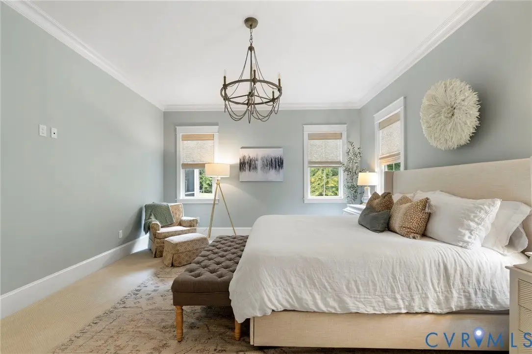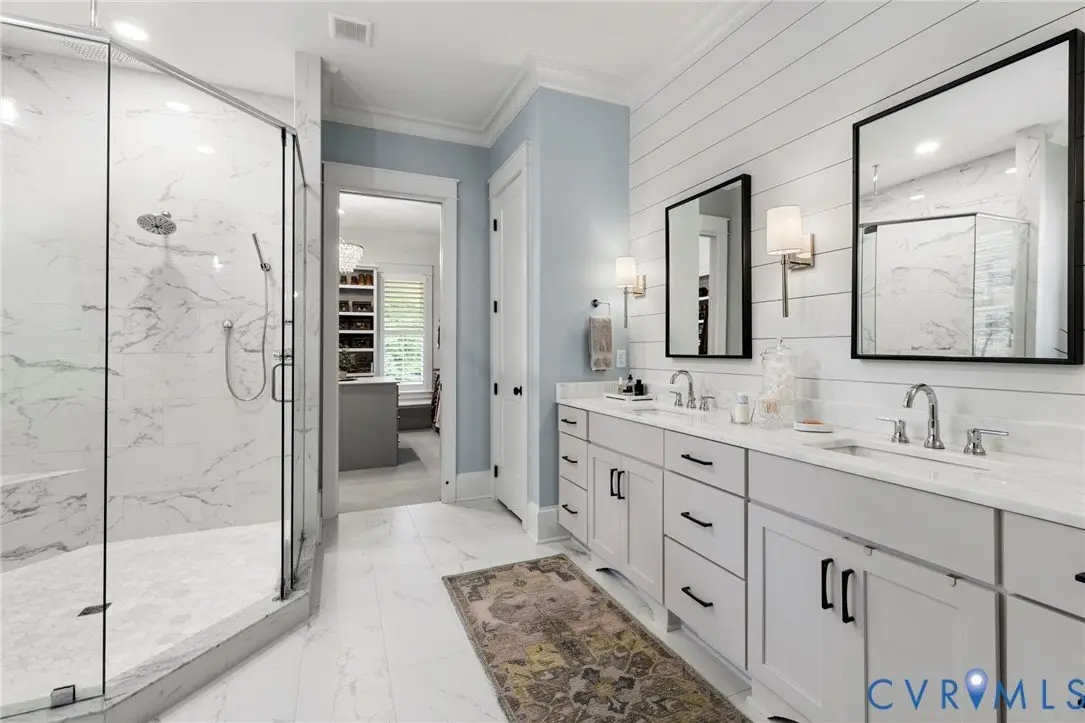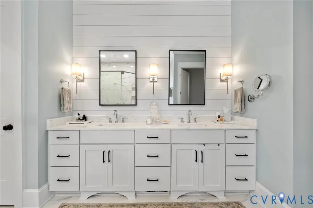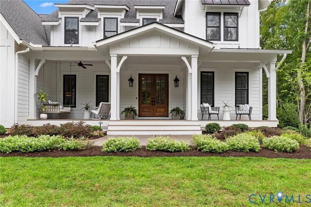 This custom-designed Pacific Farmhouse by Biringer Builders is a masterpiece of craftsmanship & design, blending elevated sophistication with everyday comfort. Situated off of historic Old Gun Road on 2 private acres, the home offers the serenity of a retreat while remaining minutes from conveniences. From the inviting front porch to the welcoming foyer, every detail has been thoughtfully curated. Soaring 10' ceilings, exquisite moldings & wide-plank wood floors establish an atmosphere of refinement. A paneled dining room & butler's pantry provides the perfect setting for gatherings, while the light-filled family room with beamed ceilings, fireplace, and built-ins flows seamlessly to a three-season screened porch with a stone fireplace-ideal for entertaining & relaxation. The chef's kitchen is a true showstopper, featuring a large quartz island with breakfast bar, floor-to-ceiling cabinetry, designer backsplash, luxury appliances, and a sunlit dining area. A walk-in pantry, office/mudroom, powder room and laundry enhance main-level living. The primary suite is a luxurious retreat, wrapped in windows with refined crown molding. The spa-inspired bath offers a double vanity, walk-in shower, private water closet, linen storage, and a boutique-style walk-in dressing room with custom built-ins. Upstairs, a versatile loft connects four spacious bedrooms, including a Jack-and-Jill suite plus a second laundry room with cabinetry. An additional suite with full bath offers flexible space for a media room, office or guest accommodations with expansion potential in the wired storage area. The finished lower level provides abundant living space with a great room, playroom, guest suite and direct walk-out to a private patio. An oversized two-car garage offers excellent storage. Outdoors, the property is designed for both recreation & retreat with a sports field and wooded trails and convenient second stone driveway. This remarkable residence offers a rare opportunity to enjoy elevated living in the heart of beautiful Midlothian.