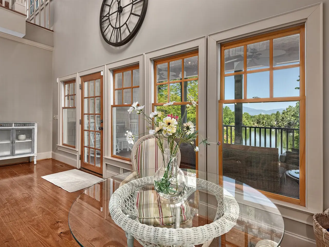 Idyllic lakefront home tucked in a private cove on Lake Adger is the perfect mountain getaway! Featuring year-round lake and mountain views, this home sits close to the water and has a gentle sloped yard with stone pathway to the lake and your own floating dock. This home checks all the boxes including an open floor plan, a large versatile kitchen, warm pine wood floors, and a marvelous great room with a dramatic two-story stacked stone fireplace and vaulted wood ceilings. The rooms are spacious, and the ceilings are almost 10' tall throughout. Relax and listen to the splashing creek from the wraparound covered porch or terrace level patio. Create the ultimate home office on the second level loft. Invite all of your friends because there is plenty of room including a terrace level family room with entertainment kitchenette, a large bunk room, and bonus rooms throughout. Loads of storage, and an attached tandem garage with plenty of room to store your water toys. This is the lake life!