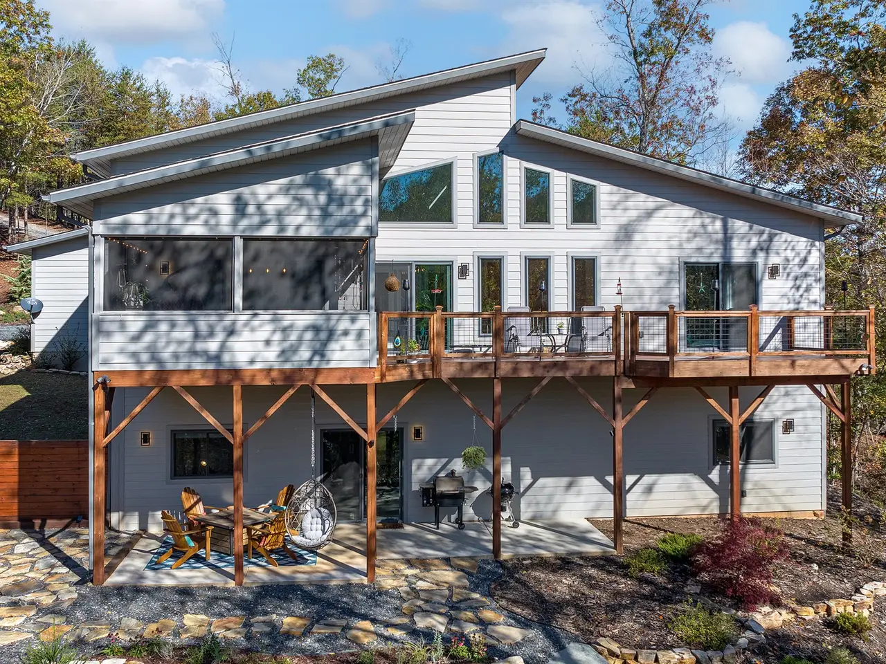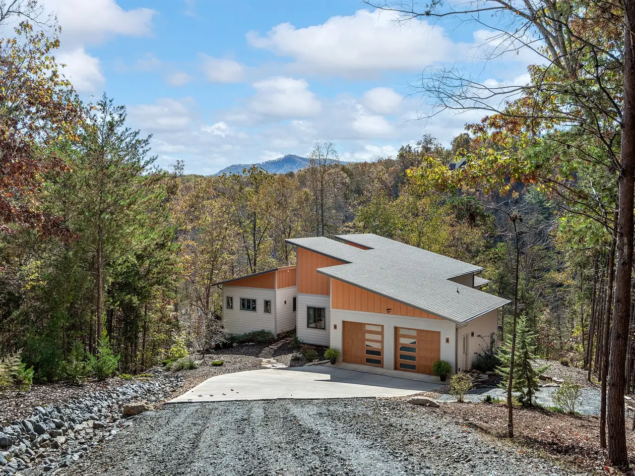 Peaceful lakefront property with mountain views on Lake Adger. This hideaway home offers soft lake breezes and sanctuary from busy city life. Includes your own private floating dock and over 300 feet of lakefront. A serenity entry at the enclosed patio garden with a gentle water feature. Step inside and you will find stylish design with soaring ceilings along with African Mahogany and steel accents throughout the house, perfectly highlighted by modern light fixtures. The main level screened porch is ideal for relaxing and the open concept living space makes for easy entertaining. Experience mountain, lake, and wooded views from the secluded primary suite with lovely skylights to explore dark sky stargazing. The primary bath is highlighted by a natural edge Maple slab vanity plus a Victoria and Albert freestanding soaking tub and separate frameless glass shower. The terrace level family room has its own fireplace and walk-out to a tiered patio. Life is better at the lake!