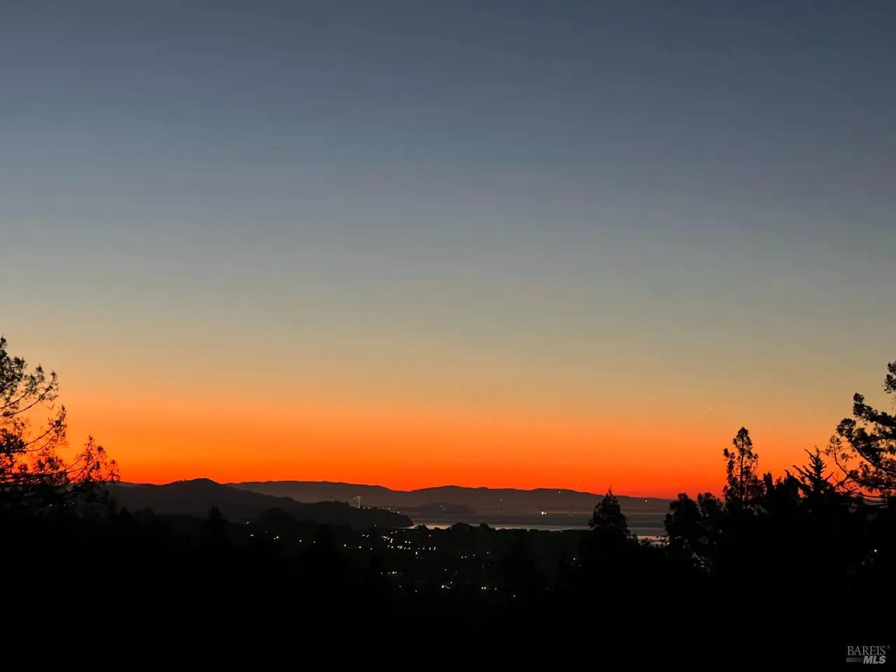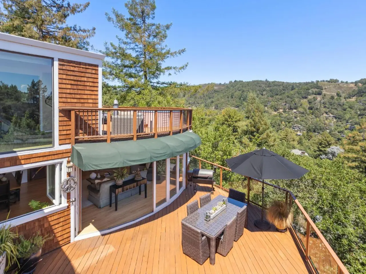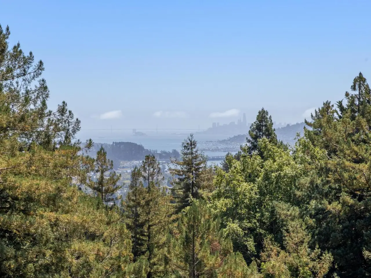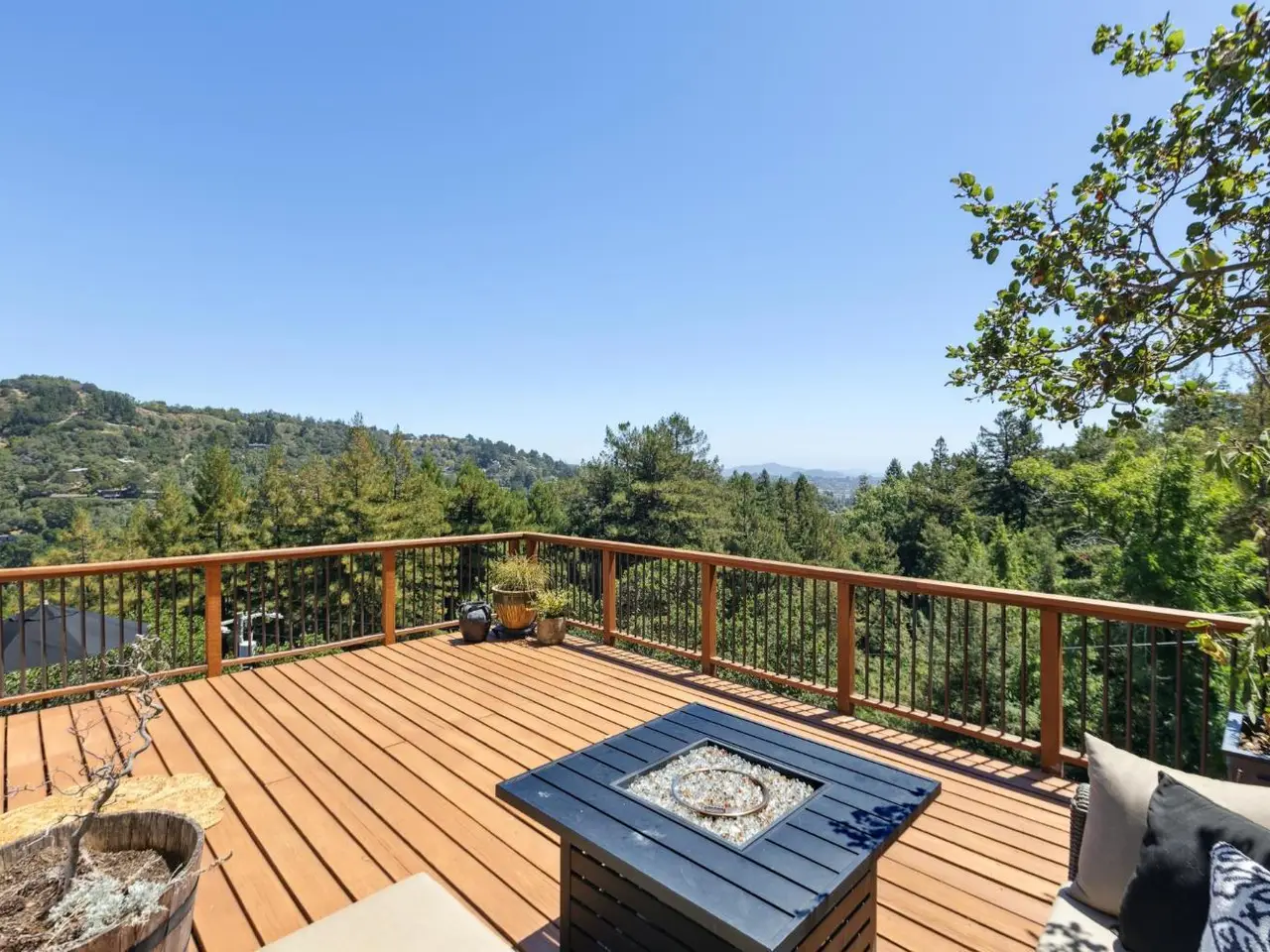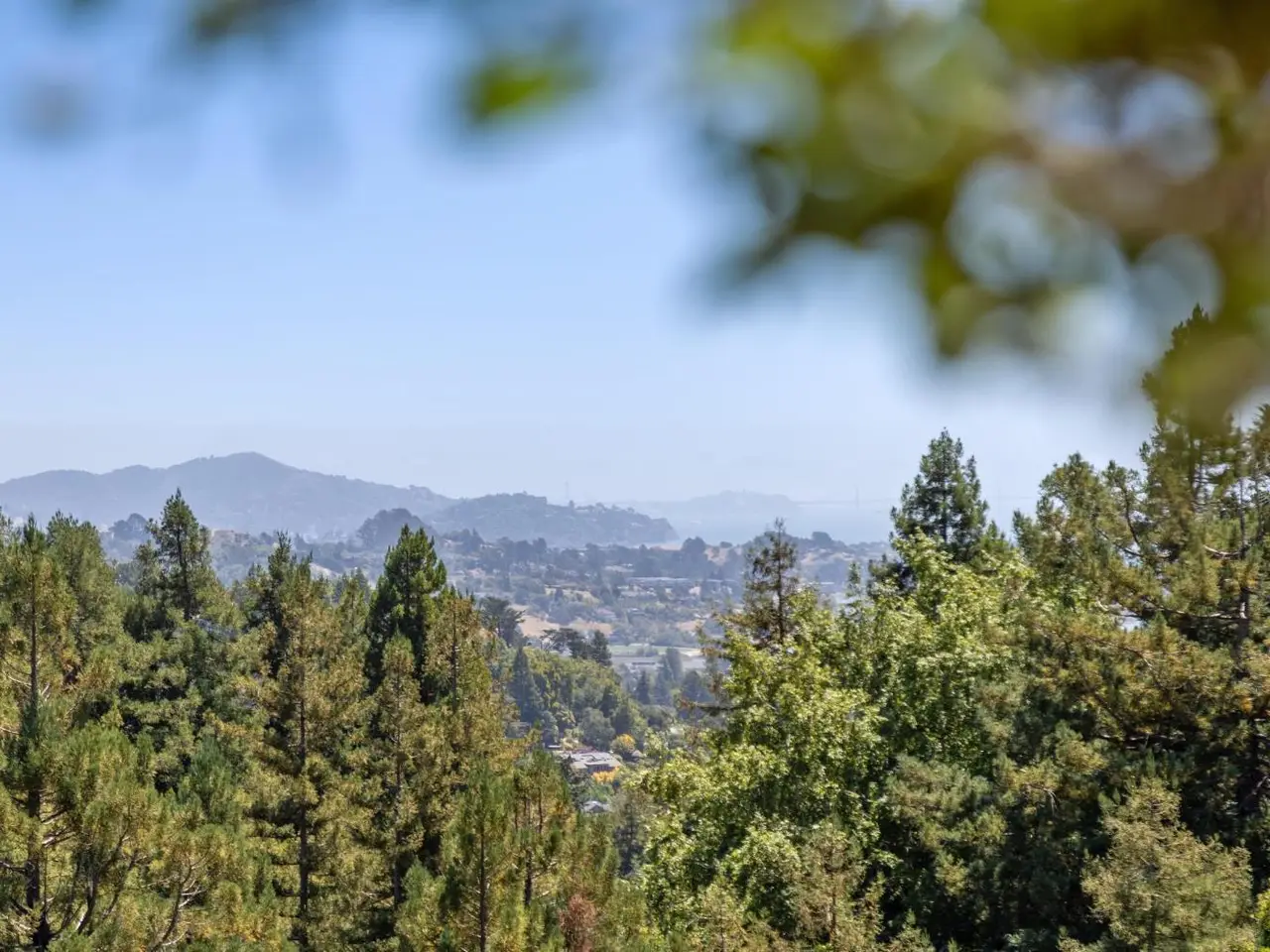 This stunning custom four-bedroom, five-bath home on prestigious Middle Ridge delivers the quintessential Marin lifestyle with sweeping views spanning the surrounding hills to Angel Island, the Bay, and downtown San Francisco. Entertain effortlessly on multiple decks, including the main deck accessible through custom moveable glass doors from the expansive great room featuring living, dining, and gourmet kitchen areas. The chef's kitchen showcases elegant Italian marble countertops, top-tier appliances, and exquisite custom mahogany Berkeley Mills cabinetry. Two sunny main-level bedrooms each offer en-suite baths, while the private upper-level primary suite captures incredible vistas from dual private decks, one featuring a spa tub and outdoor shower. This indulgent retreat includes a luxurious bath, wood-burning marble fireplace, oversized walk-in closet, and dedicated office and exercise areas. A versatile guest suite with separate entrance provides flexible living options. Premium features include hardwood floors throughout and owned solar panels. Situated on a tranquil, sun-drenched avenue mere minutes from downtown Mill Valley's award-winning schools and world-renowned hiking and biking trails.