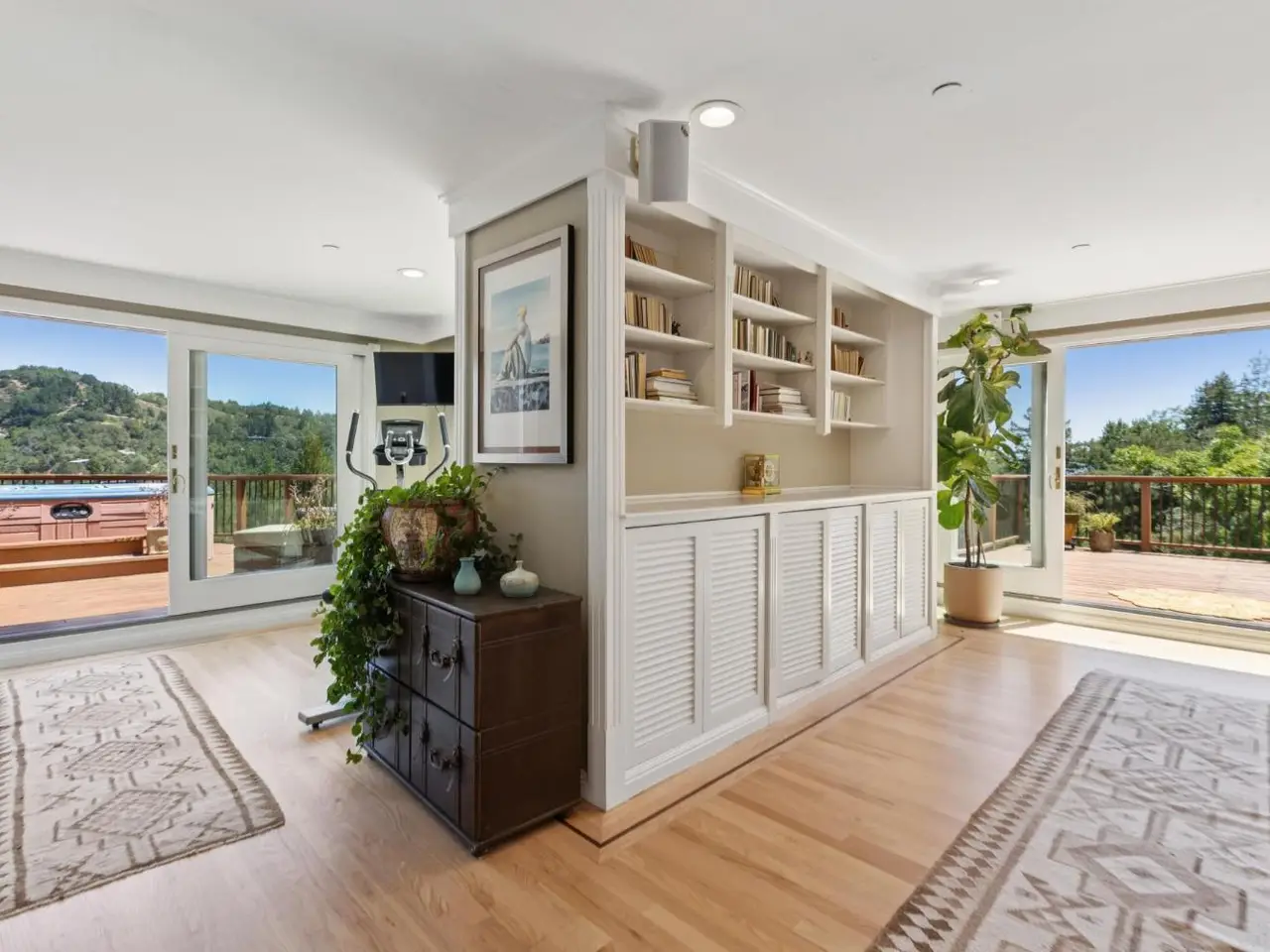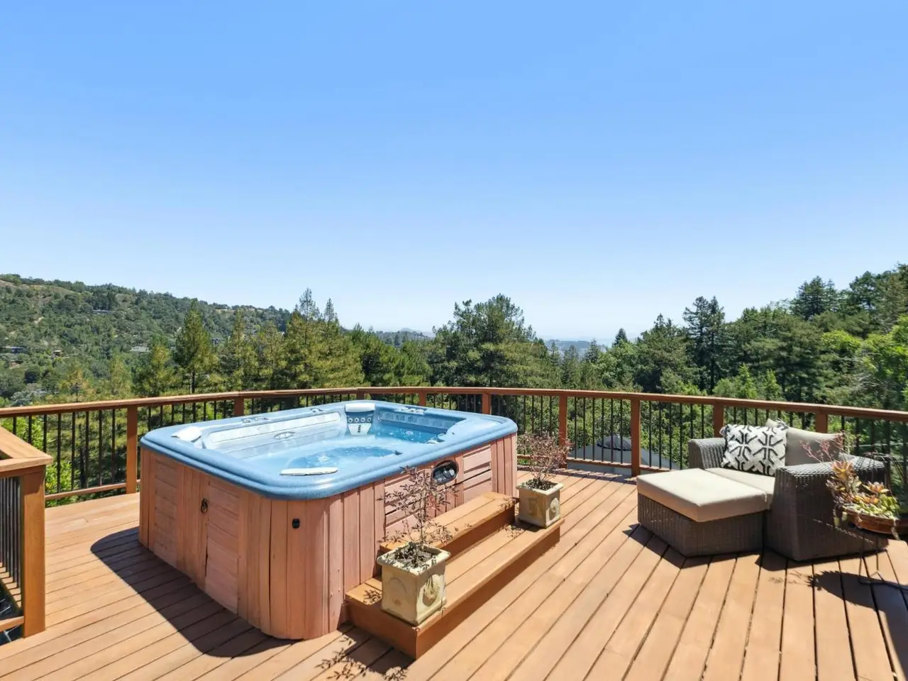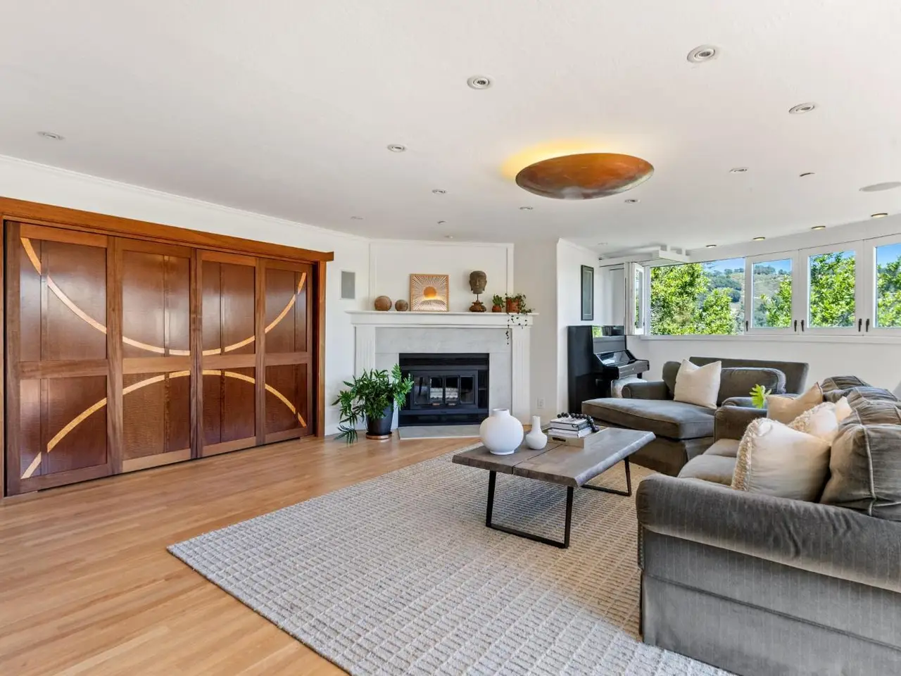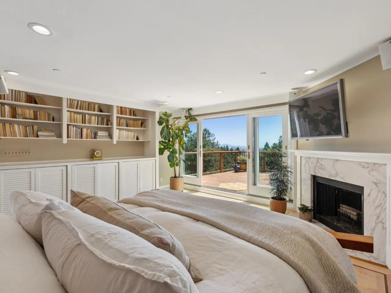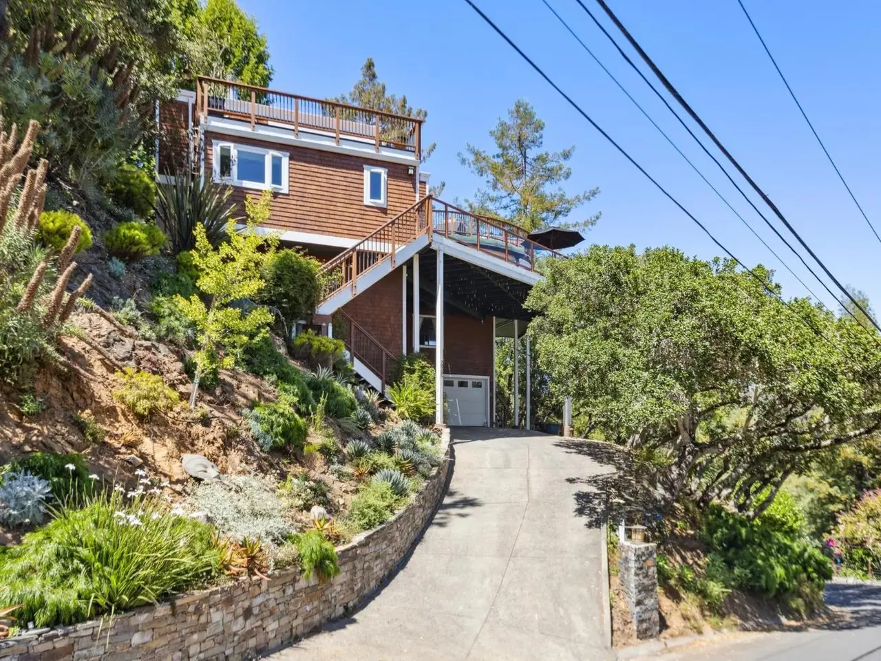 This stunning custom four-bedroom, five-bath home on prestigious Middle Ridge delivers the quintessential Marin lifestyle with sweeping views spanning the surrounding hills to Angel Island, the Bay, and downtown San Francisco. Entertain effortlessly on multiple decks, including the main deck accessible through custom moveable glass doors from the expansive great room featuring living, dining, and gourmet kitchen areas. The chef's kitchen showcases elegant Italian marble countertops, top-tier appliances, and exquisite custom mahogany Berkeley Mills cabinetry. Two sunny main-level bedrooms each offer en-suite baths, while the private upper-level primary suite captures incredible vistas from dual private decks, one featuring a spa tub and outdoor shower. This indulgent retreat includes a luxurious bath, wood-burning marble fireplace, oversized walk-in closet, and dedicated office and exercise areas. A versatile guest suite with separate entrance provides flexible living options. Premium features include hardwood floors throughout and owned solar panels. Situated on a tranquil, sun-drenched avenue mere minutes from downtown Mill Valley's award-winning schools and world-renowned hiking and biking trails.