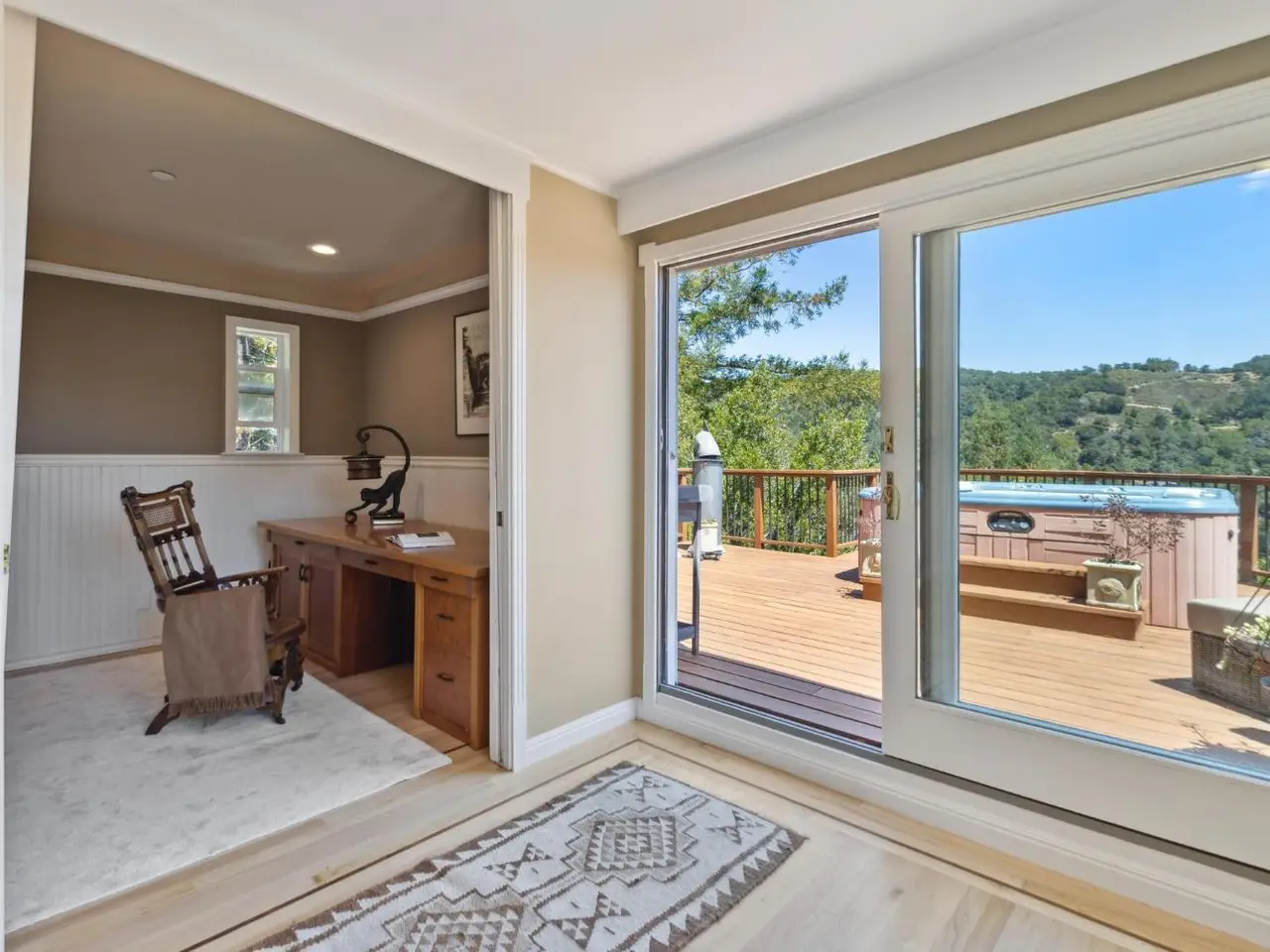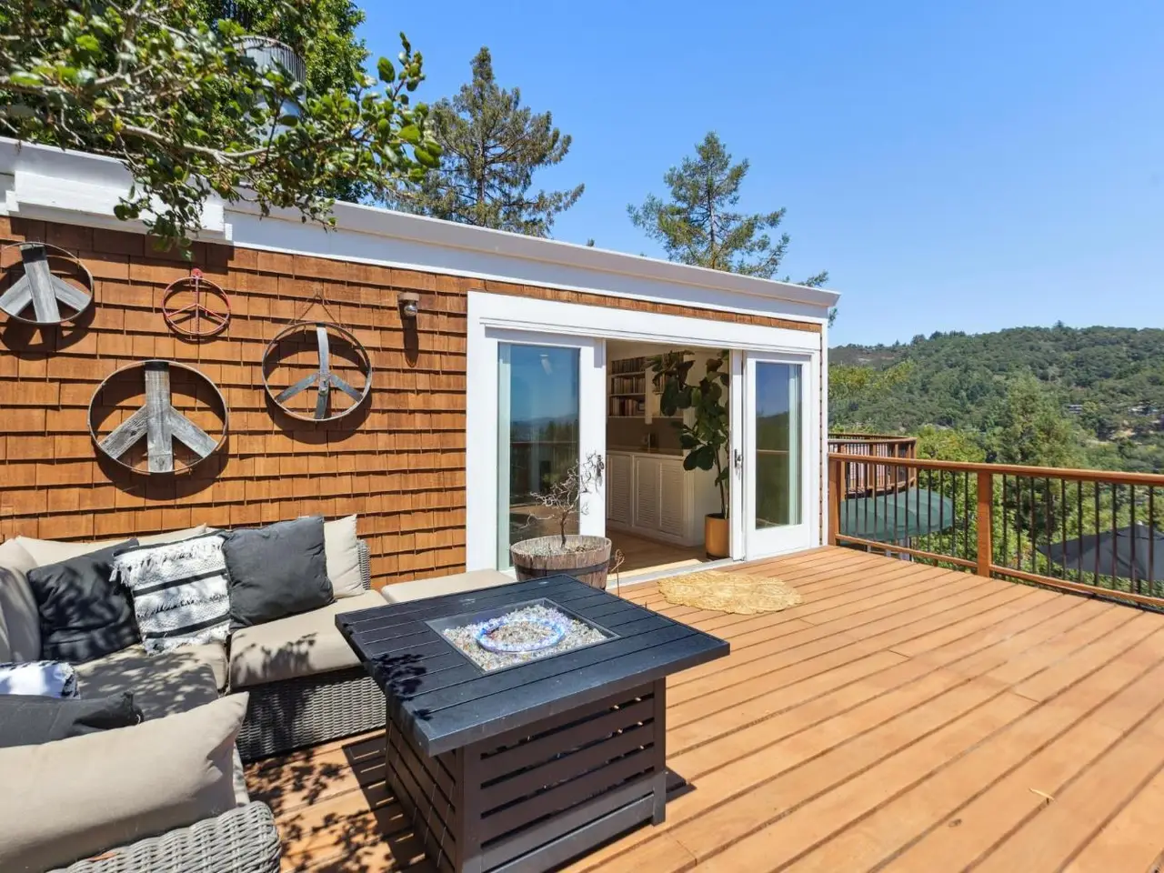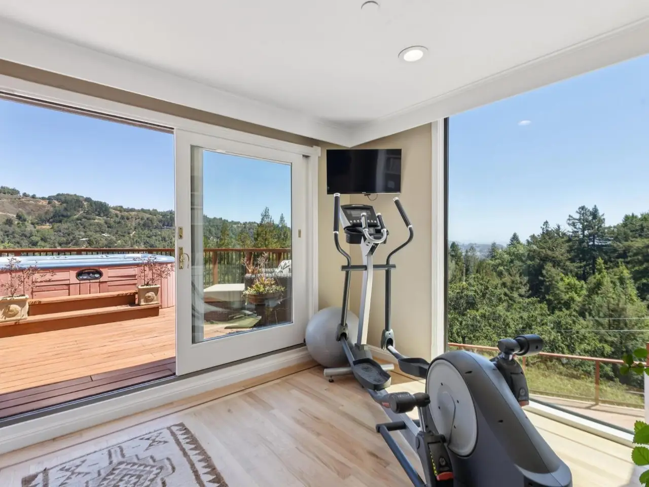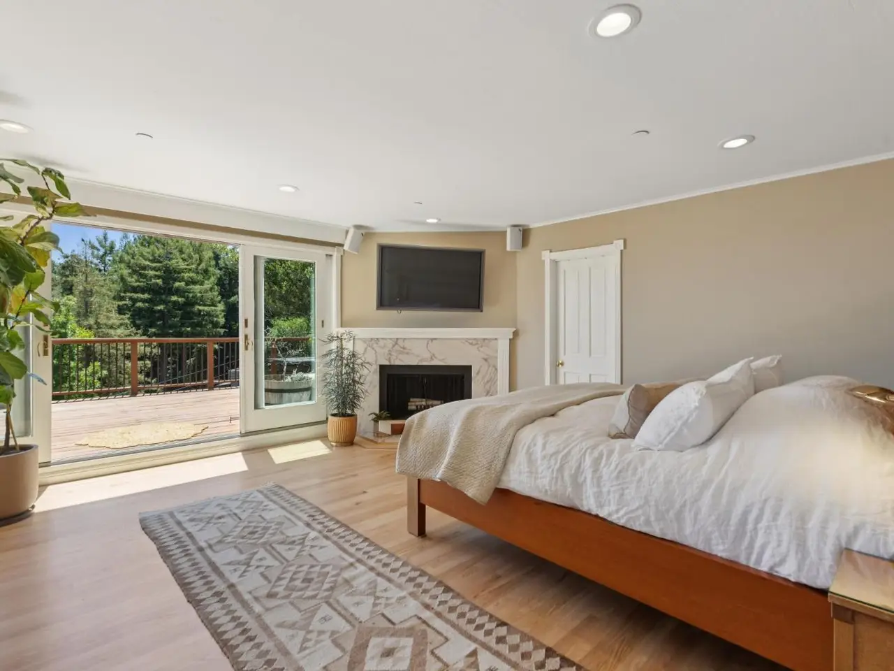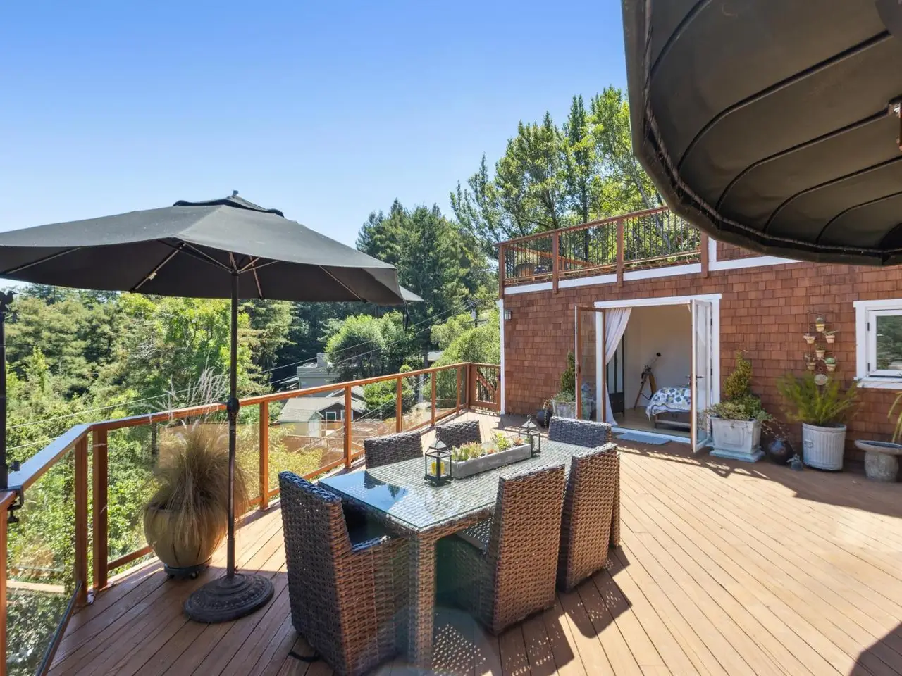 This stunning custom four-bedroom, five-bath home on prestigious Middle Ridge delivers the quintessential Marin lifestyle with sweeping views spanning the surrounding hills to Angel Island, the Bay, and downtown San Francisco. Entertain effortlessly on multiple decks, including the main deck accessible through custom moveable glass doors from the expansive great room featuring living, dining, and gourmet kitchen areas. The chef's kitchen showcases elegant Italian marble countertops, top-tier appliances, and exquisite custom mahogany Berkeley Mills cabinetry. Two sunny main-level bedrooms each offer en-suite baths, while the private upper-level primary suite captures incredible vistas from dual private decks, one featuring a spa tub and outdoor shower. This indulgent retreat includes a luxurious bath, wood-burning marble fireplace, oversized walk-in closet, and dedicated office and exercise areas. A versatile guest suite with separate entrance provides flexible living options. Premium features include hardwood floors throughout and owned solar panels. Situated on a tranquil, sun-drenched avenue mere minutes from downtown Mill Valley's award-winning schools and world-renowned hiking and biking trails.