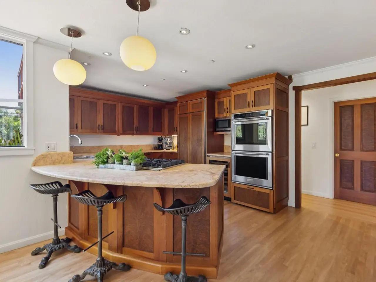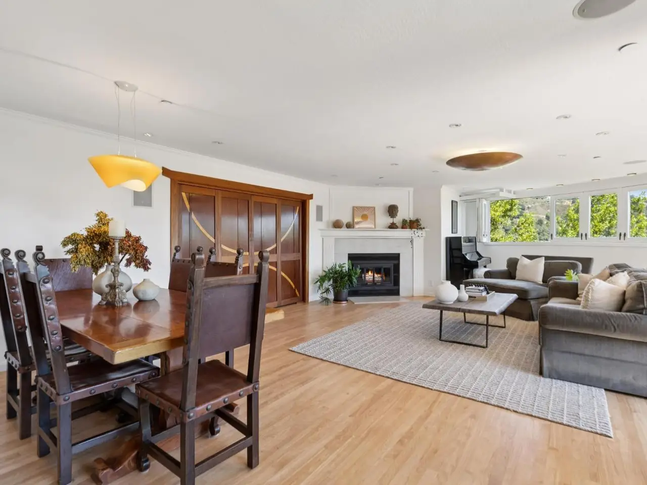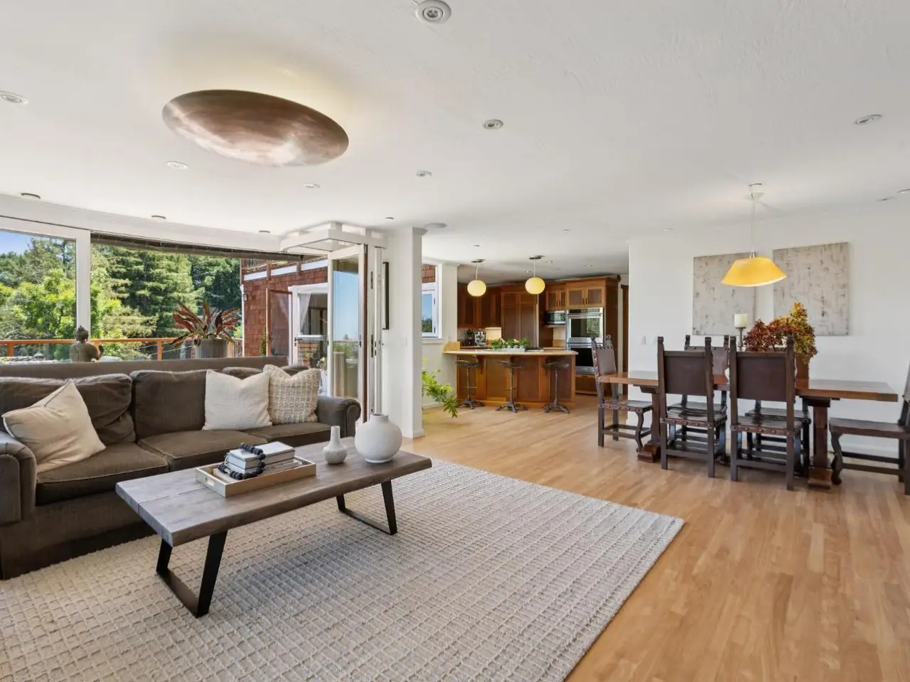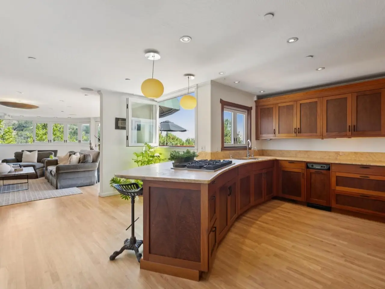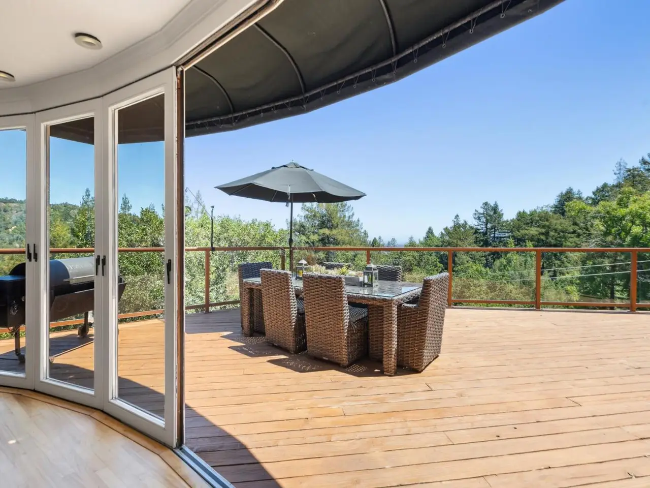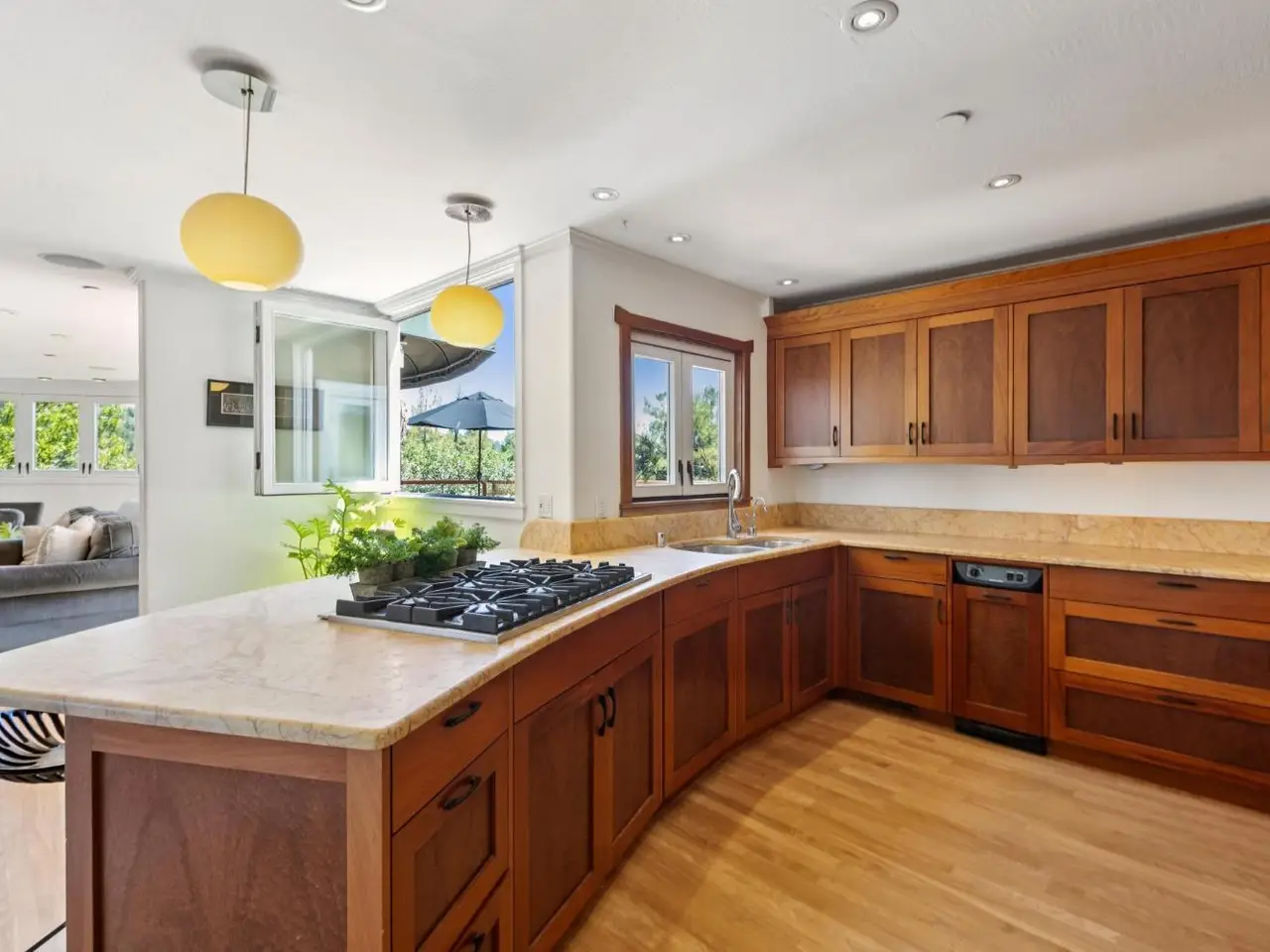 This stunning custom four-bedroom, five-bath home on prestigious Middle Ridge delivers the quintessential Marin lifestyle with sweeping views spanning the surrounding hills to Angel Island, the Bay, and downtown San Francisco. Entertain effortlessly on multiple decks, including the main deck accessible through custom moveable glass doors from the expansive great room featuring living, dining, and gourmet kitchen areas. The chef's kitchen showcases elegant Italian marble countertops, top-tier appliances, and exquisite custom mahogany Berkeley Mills cabinetry. Two sunny main-level bedrooms each offer en-suite baths, while the private upper-level primary suite captures incredible vistas from dual private decks, one featuring a spa tub and outdoor shower. This indulgent retreat includes a luxurious bath, wood-burning marble fireplace, oversized walk-in closet, and dedicated office and exercise areas. A versatile guest suite with separate entrance provides flexible living options. Premium features include hardwood floors throughout and owned solar panels. Situated on a tranquil, sun-drenched avenue mere minutes from downtown Mill Valley's award-winning schools and world-renowned hiking and biking trails.