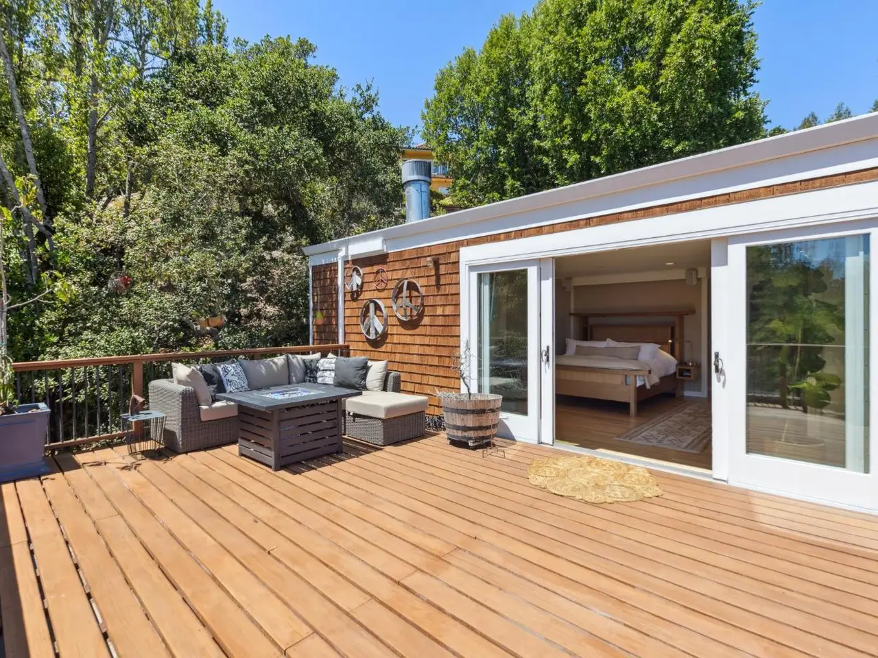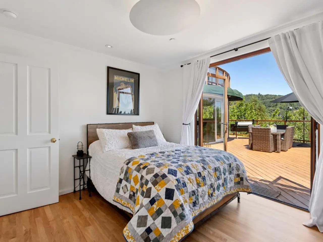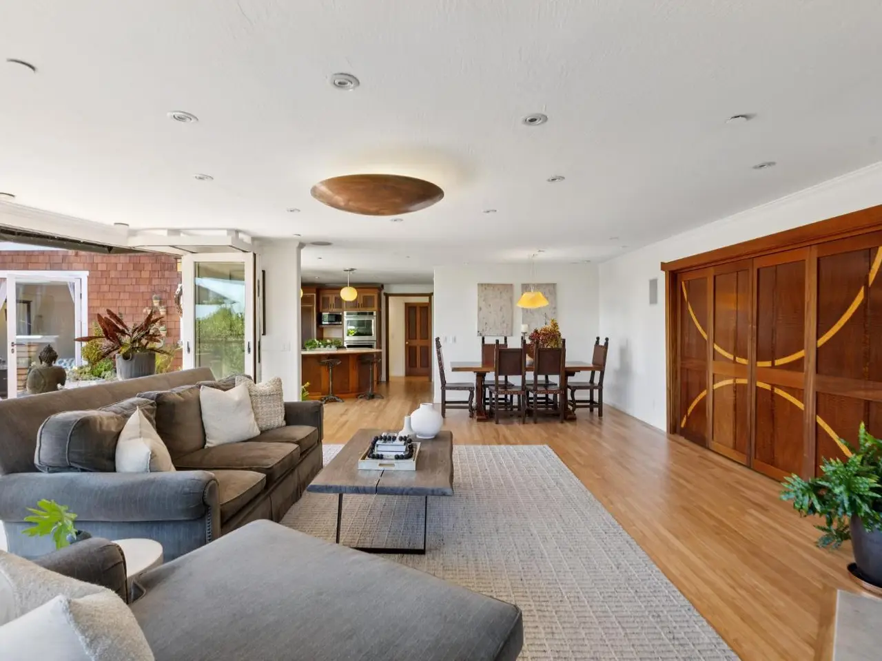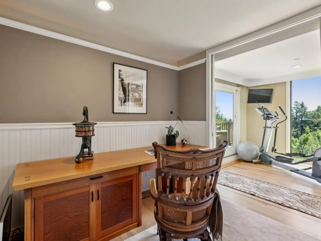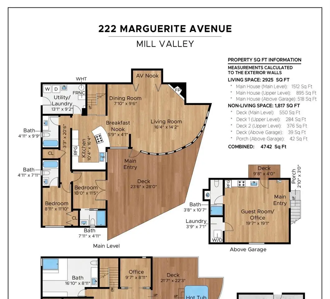 This stunning custom four-bedroom, five-bath home on prestigious Middle Ridge delivers the quintessential Marin lifestyle with sweeping views spanning the surrounding hills to Angel Island, the Bay, and downtown San Francisco. Entertain effortlessly on multiple decks, including the main deck accessible through custom moveable glass doors from the expansive great room featuring living, dining, and gourmet kitchen areas. The chef's kitchen showcases elegant Italian marble countertops, top-tier appliances, and exquisite custom mahogany Berkeley Mills cabinetry. Two sunny main-level bedrooms each offer en-suite baths, while the private upper-level primary suite captures incredible vistas from dual private decks, one featuring a spa tub and outdoor shower. This indulgent retreat includes a luxurious bath, wood-burning marble fireplace, oversized walk-in closet, and dedicated office and exercise areas. A versatile guest suite with separate entrance provides flexible living options. Premium features include hardwood floors throughout and owned solar panels. Situated on a tranquil, sun-drenched avenue mere minutes from downtown Mill Valley's award-winning schools and world-renowned hiking and biking trails.