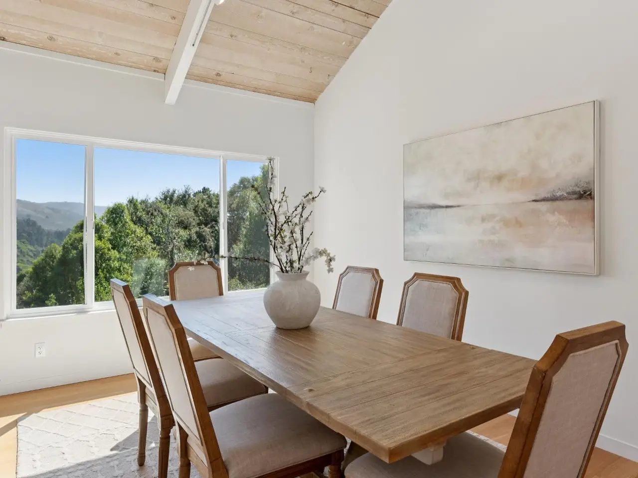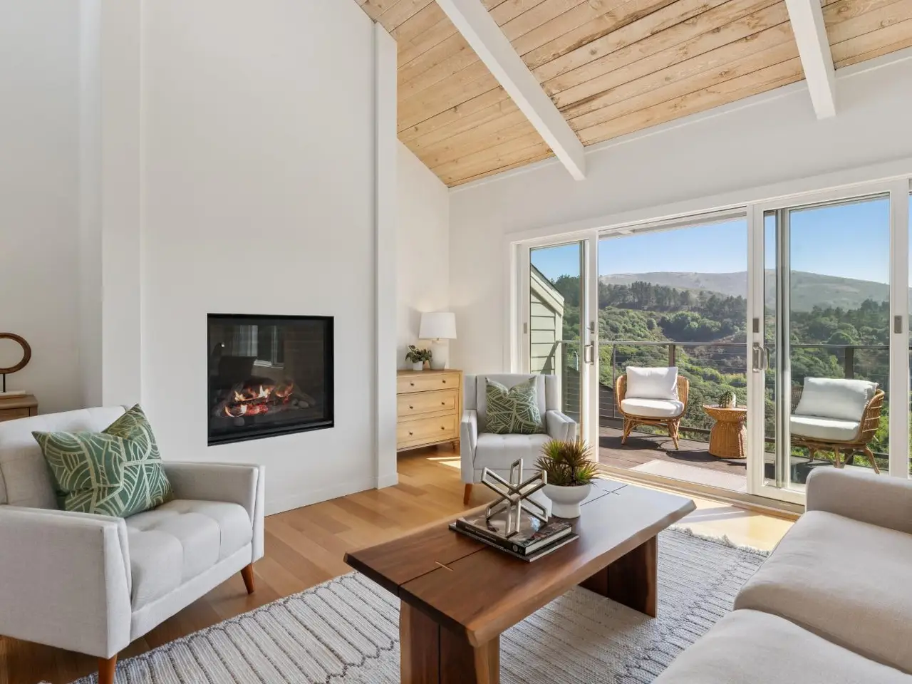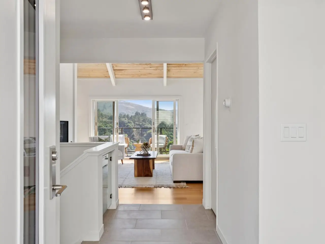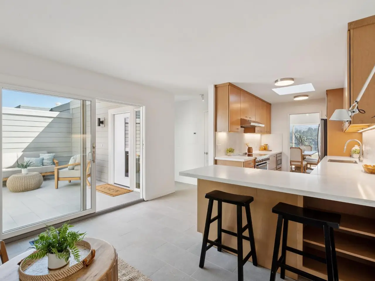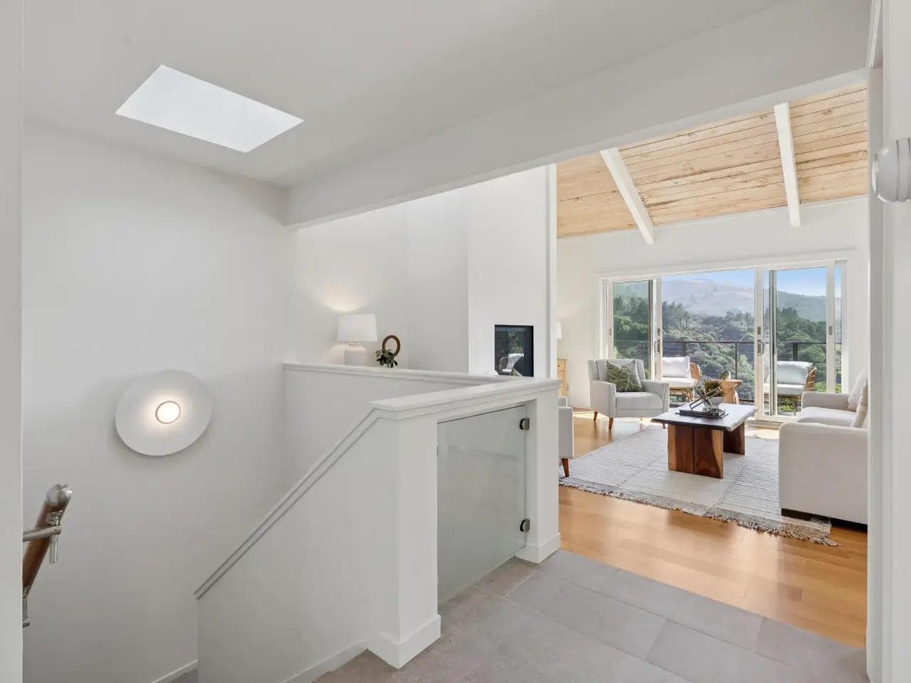 Stunning, stylishly remodeled home in Marinview featuring light-filled, open spaces with two bedrooms, two versatile bonus rooms, and two and a half baths. Situated on a quiet cul-de-sac and perched with tranquil, expansive views overlooking the Golden Gate National Recreation Area, this attached residence brings natural beauty to your doorstep. The living and dining room showcases soaring, open-beamed ceilings, gleaming hardwood floors, and a gas fireplace, while large windows and sliding doors bathe the space in natural light and open seamlessly to the view deck. The chef's kitchen delights with maple cabinetry, quartz countertops, and premium appliances including a five-burner induction range, plus a breakfast bar and informal dining area that opens to a peaceful, porcelain-tiled entry courtyard. The lower level houses two bedrooms, both bonus rooms, and a well-equipped laundry room. The spacious primary suite features a luxurious bath and private deck. A two-car garage completes the home. Perfectly positioned with trailheads nearby and close to Tam Valley's shopping, restaurants, and top-rated schools. Downtown Mill Valley is just minutes away. Easy access to Highway 101.