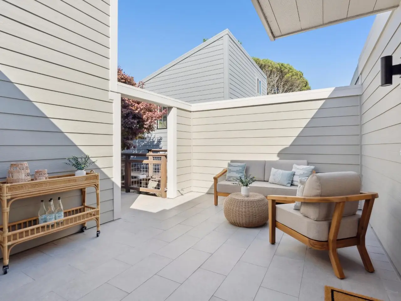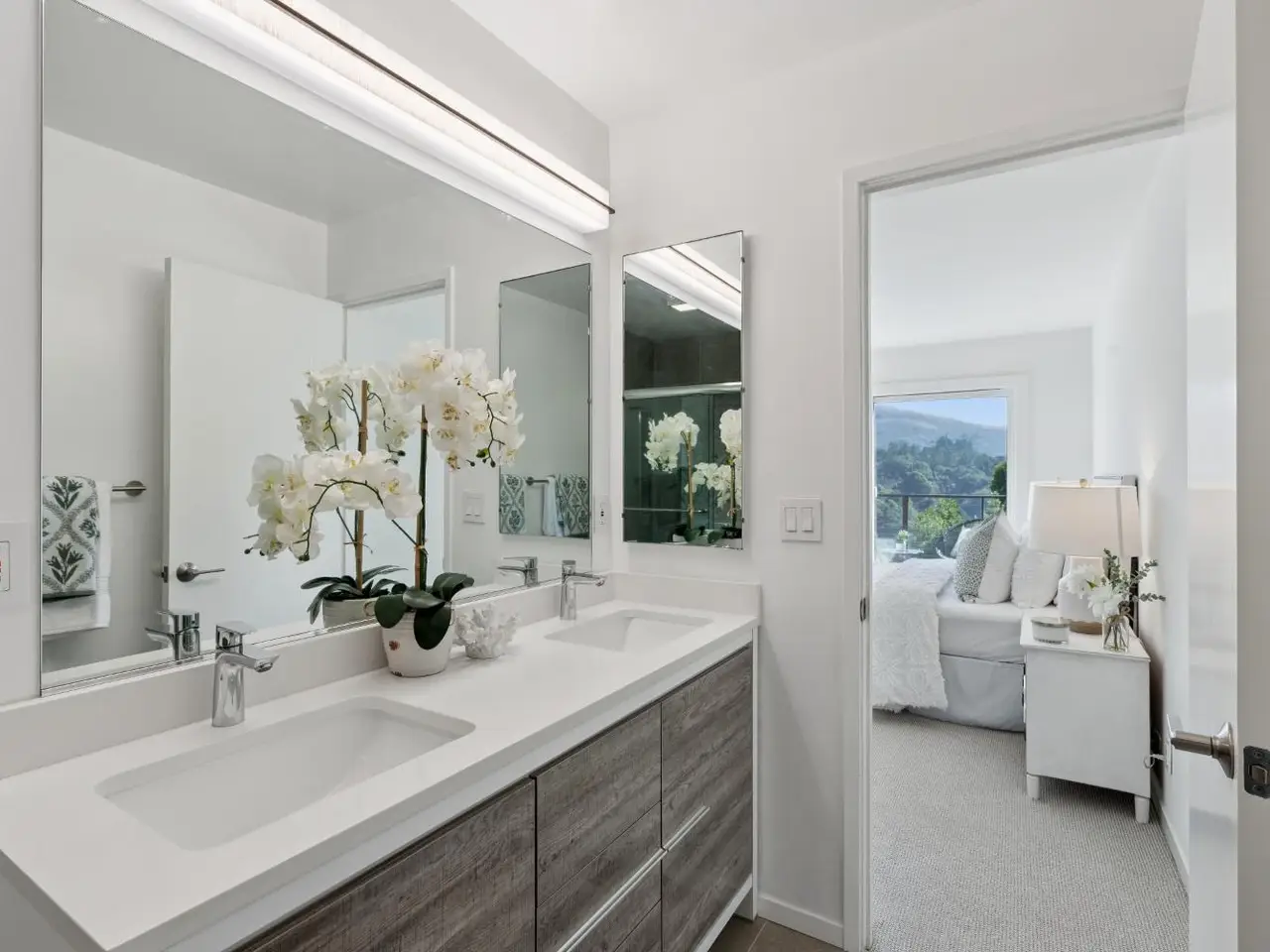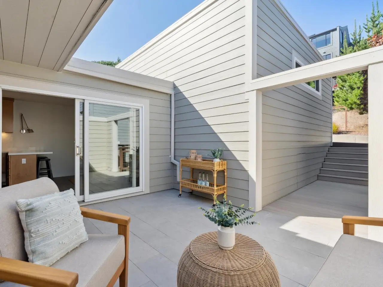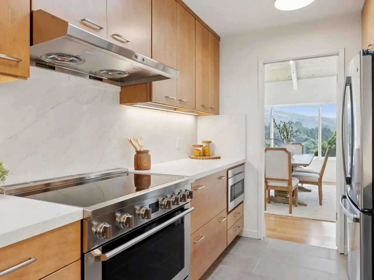 Stunning, stylishly remodeled home in Marinview featuring light-filled, open spaces with two bedrooms, two versatile bonus rooms, and two and a half baths. Situated on a quiet cul-de-sac and perched with tranquil, expansive views overlooking the Golden Gate National Recreation Area, this attached residence brings natural beauty to your doorstep. The living and dining room showcases soaring, open-beamed ceilings, gleaming hardwood floors, and a gas fireplace, while large windows and sliding doors bathe the space in natural light and open seamlessly to the view deck. The chef's kitchen delights with maple cabinetry, quartz countertops, and premium appliances including a five-burner induction range, plus a breakfast bar and informal dining area that opens to a peaceful, porcelain-tiled entry courtyard. The lower level houses two bedrooms, both bonus rooms, and a well-equipped laundry room. The spacious primary suite features a luxurious bath and private deck. A two-car garage completes the home. Perfectly positioned with trailheads nearby and close to Tam Valley's shopping, restaurants, and top-rated schools. Downtown Mill Valley is just minutes away. Easy access to Highway 101.