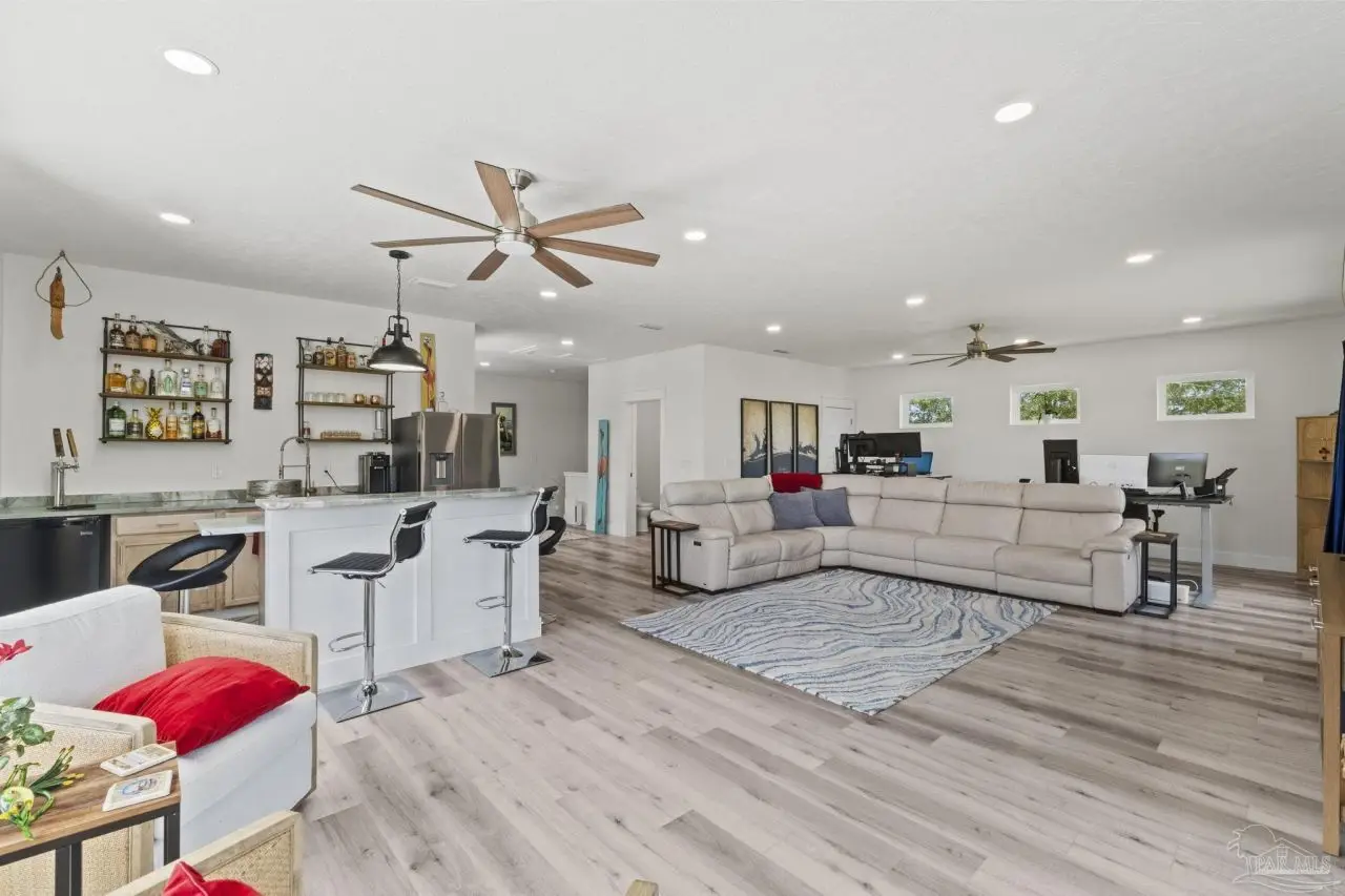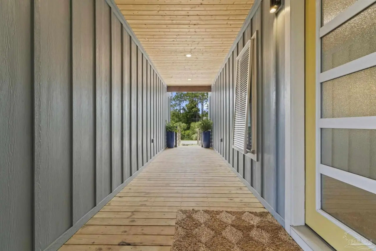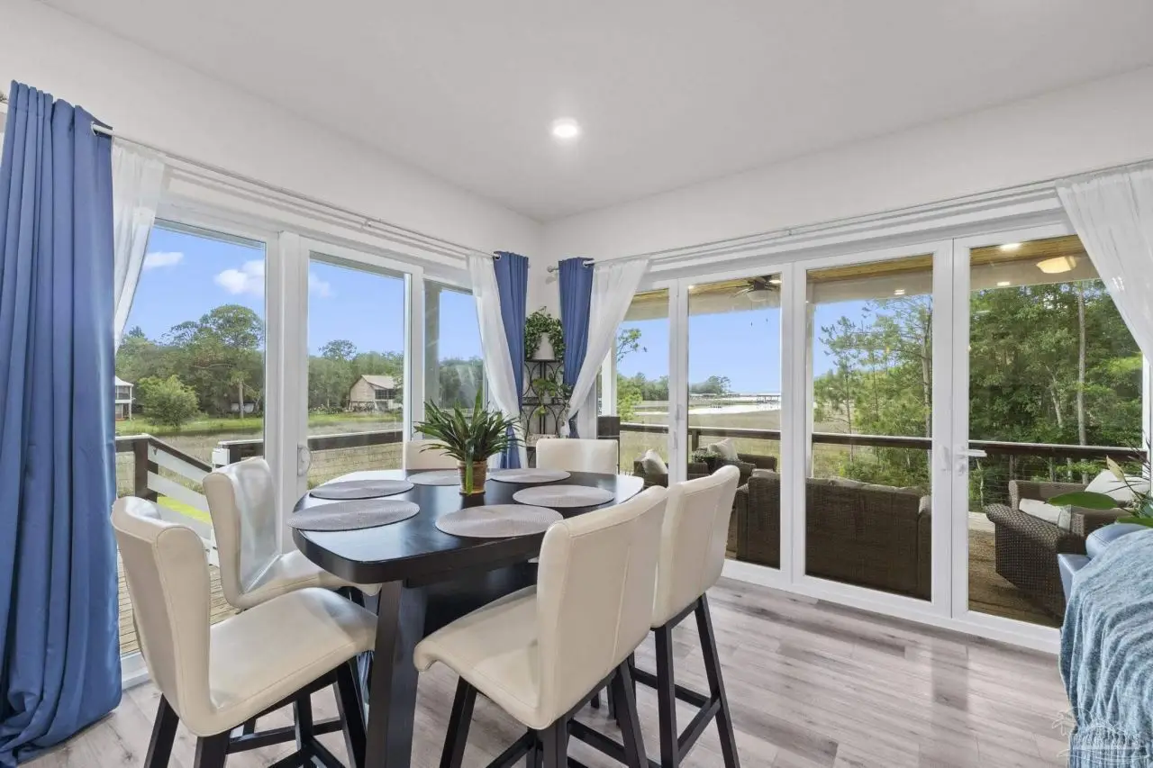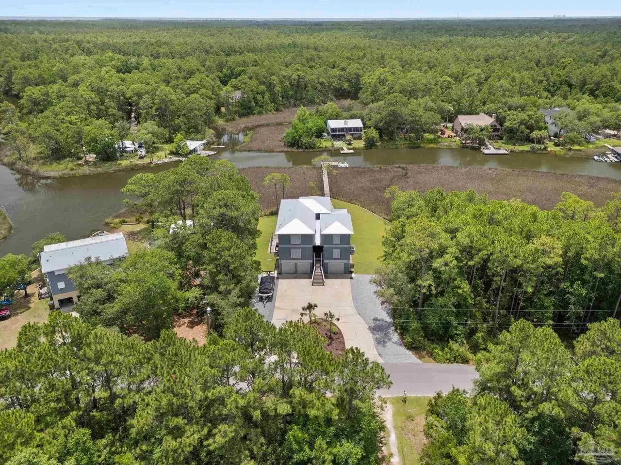 Experience effortless waterfront living in this custom, 2023-built residence set on nearly an acre along tranquil Trout Bayou, with protected boat access to Escambia Bay and a community launch just steps away. The main home offers 2 bedrooms, 2.5 baths, and airy, view-focused living spaces: a chef's kitchen with an oversized island opens to the second-floor living area and a full-width covered porch, while the third-floor entertaining level-framed by sweeping bayou vistas-features a wet bar and a dedicated office that can easily be converted to a third bedroom with the simple addition of sheetrock (wiring and lighting already in place). Below, you'll find a large garage plus covered storage for all your boating and outdoor gear. Built for efficiency and durability, the home includes spray-foam attic insulation with dehumidifiers, impact-rated windows and doors, steel-rod structural framing, and a metal roof; fresh sod blankets the expansive yard. A breezeway connects the guest cottage, which offers 2 additional bedrooms, 1.5 baths, and a private washer/dryer-ideal for extended family or visitors. Enjoy your own dock on protected water, plus the convenience of being just 20 minutes to Downtown Pensacola and 25 minutes to Gulf-front beaches. This is a rare, turnkey opportunity for peaceful Gulf Coast living with every modern comfort. Buyer to verify all measurements and information.