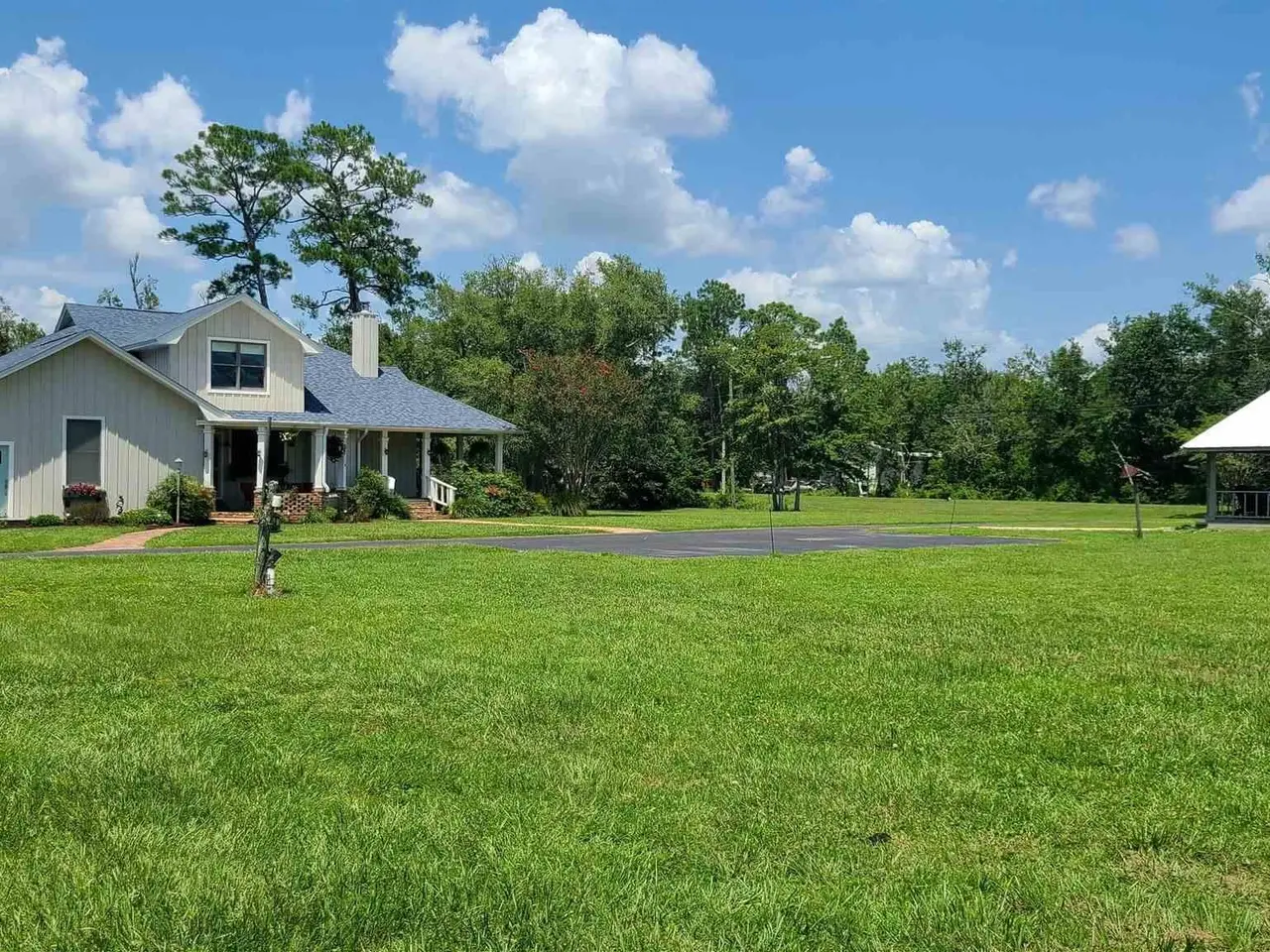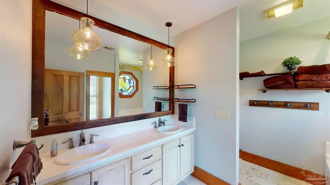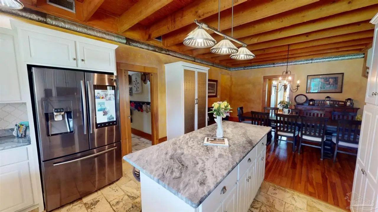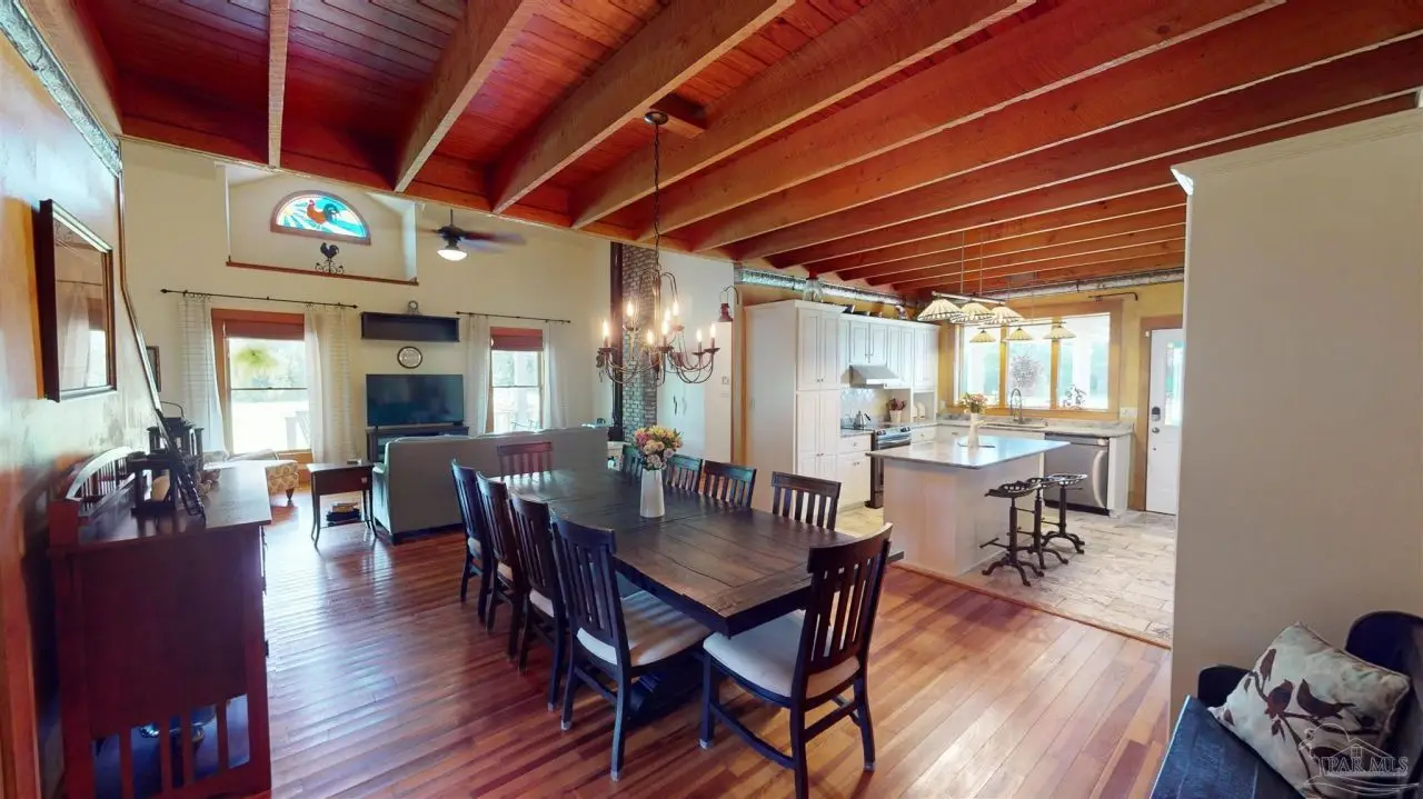 This Garcon Point-Milton expansive property could be an entertainer's dream, an event venue property for weddings or conferences, a multi-generational family compound, or income producing (AirBnB). The homes are a Tuscan-style main house, a guest house, and a studio cottage. Solar panels help reduce electricity costs! The main house has three bedrooms and baths with unique custom details like 'Henry' stained glass, cypress beamed ceilings, and a wood-burning stove. Its open layout connects living, dining, and kitchen areas to various porches, perfect for gatherings. A large loft offers versatile space. The guest house is fully furnished with two bedrooms, one bath, and a full kitchen, while the studio cottage provides a kitchenette, bath, and a screened porch with pond views. Both could be income producing! Outdoor amenities include an entertaining pavilion, a dining/cooking shack, a pool oasis with a cabana and fire pit, and a Rainbow swing set. Children love this property! Overlooking the self-watering pond are a gazebo and dock. The property also has a workshop, garden shed, raised garden beds, and a metal garage for extra storage or vehicles. It's conveniently located in quiet rural area just three miles south of I-10... including a local marina 5 minutes away to launch your boat!