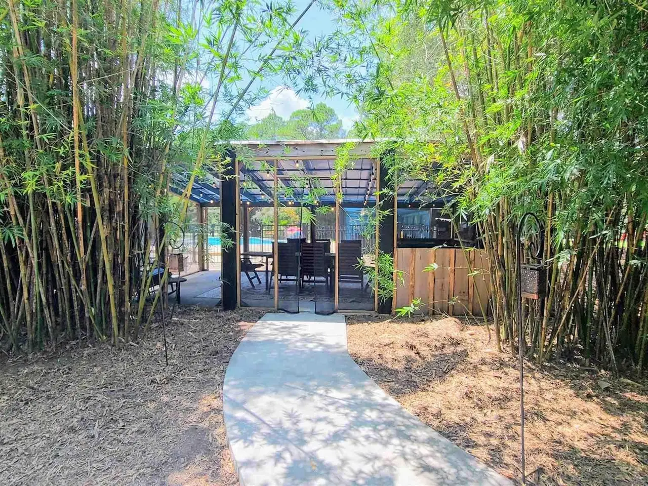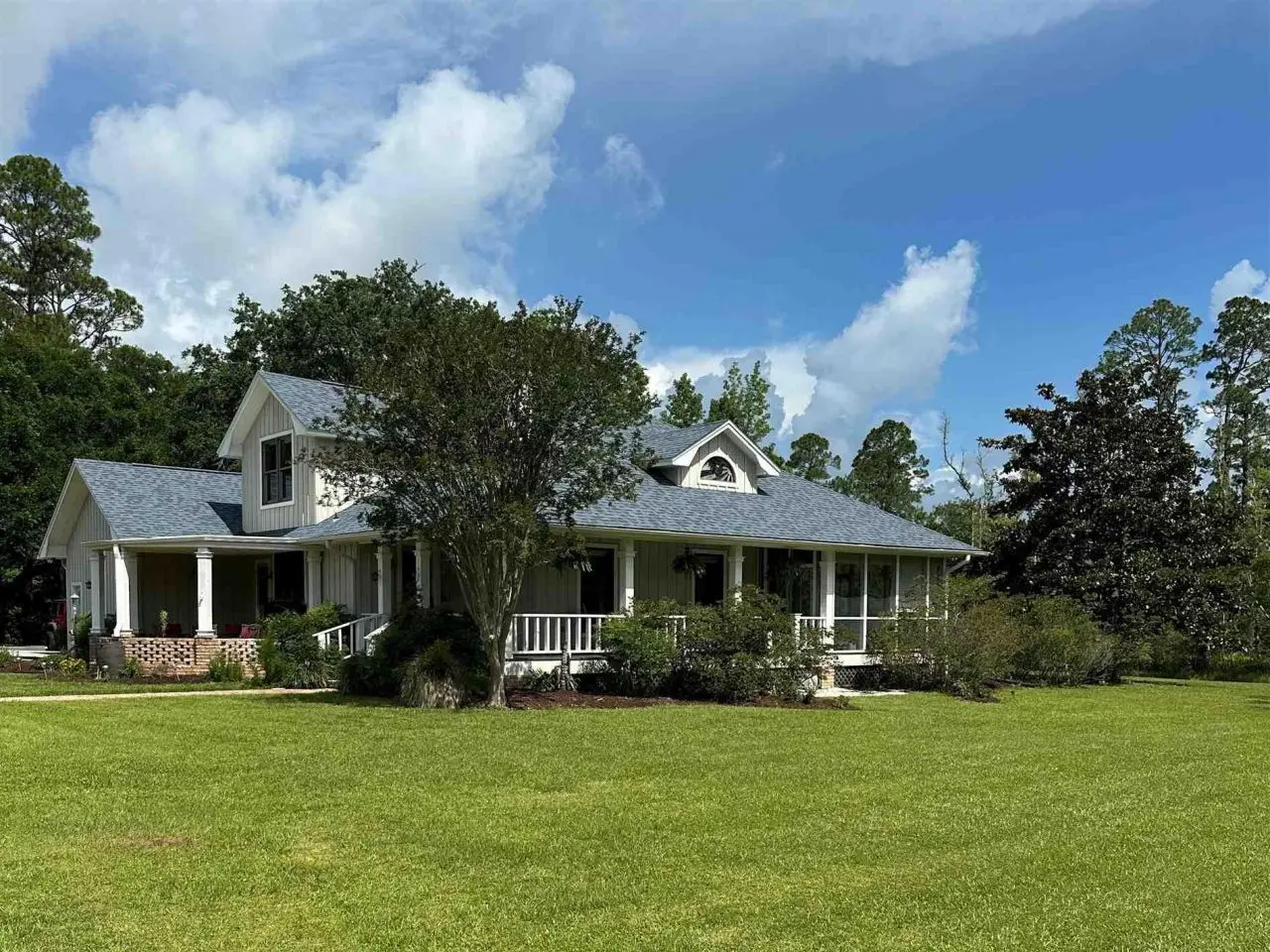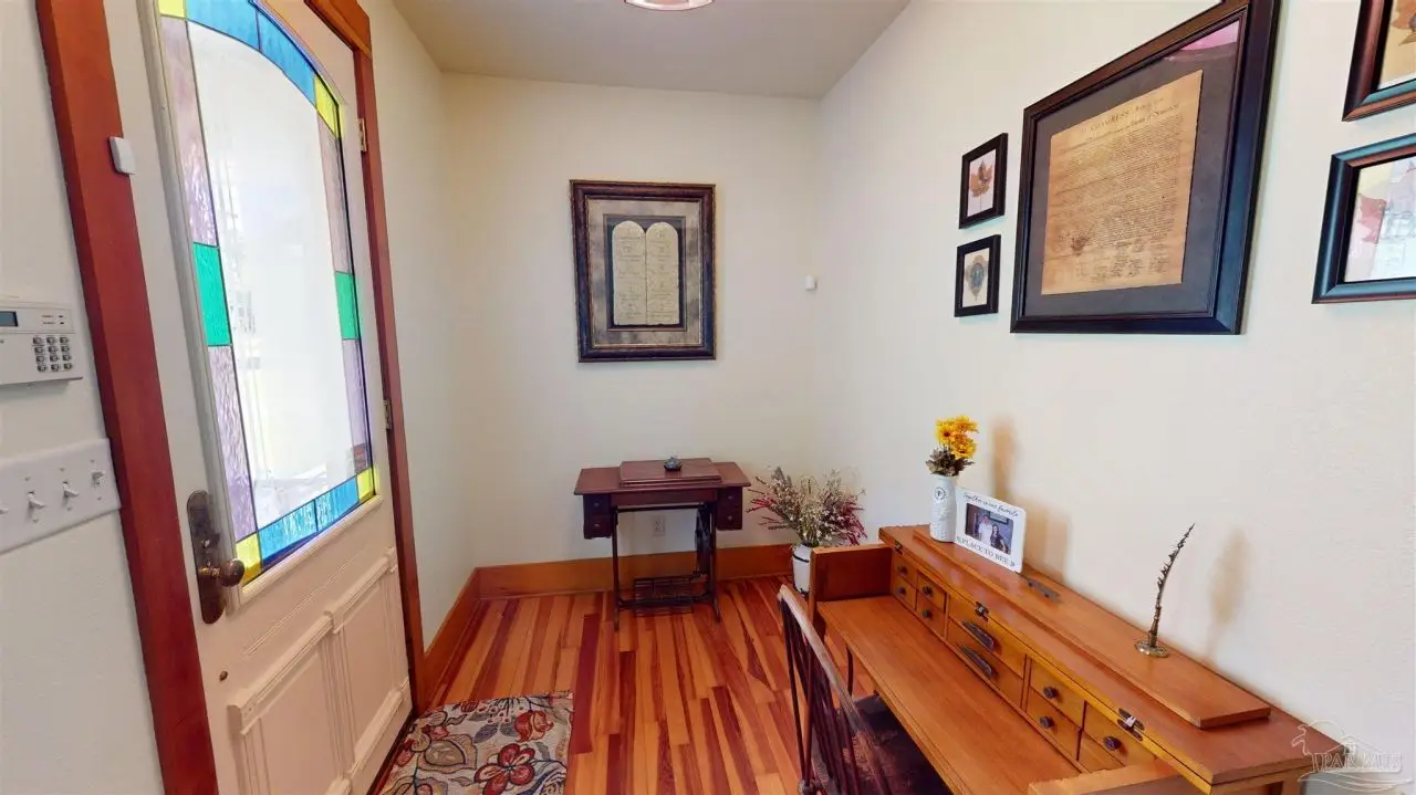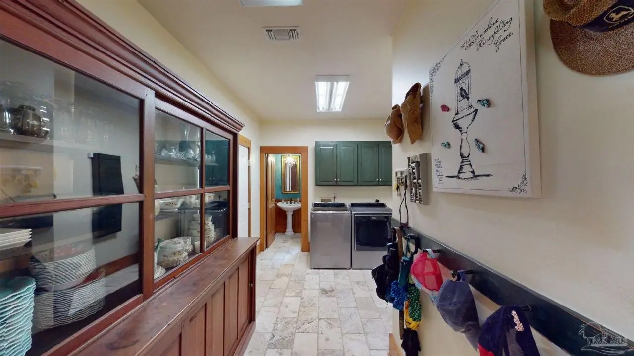 This Garcon Point-Milton expansive property could be an entertainer's dream, an event venue property for weddings or conferences, a multi-generational family compound, or income producing (AirBnB). The homes are a Tuscan-style main house, a guest house, and a studio cottage. Solar panels help reduce electricity costs! The main house has three bedrooms and baths with unique custom details like 'Henry' stained glass, cypress beamed ceilings, and a wood-burning stove. Its open layout connects living, dining, and kitchen areas to various porches, perfect for gatherings. A large loft offers versatile space. The guest house is fully furnished with two bedrooms, one bath, and a full kitchen, while the studio cottage provides a kitchenette, bath, and a screened porch with pond views. Both could be income producing! Outdoor amenities include an entertaining pavilion, a dining/cooking shack, a pool oasis with a cabana and fire pit, and a Rainbow swing set. Children love this property! Overlooking the self-watering pond are a gazebo and dock. The property also has a workshop, garden shed, raised garden beds, and a metal garage for extra storage or vehicles. It's conveniently located in quiet rural area just three miles south of I-10... including a local marina 5 minutes away to launch your boat!