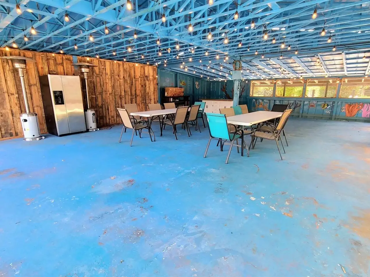 Covered cabana with painted depictions