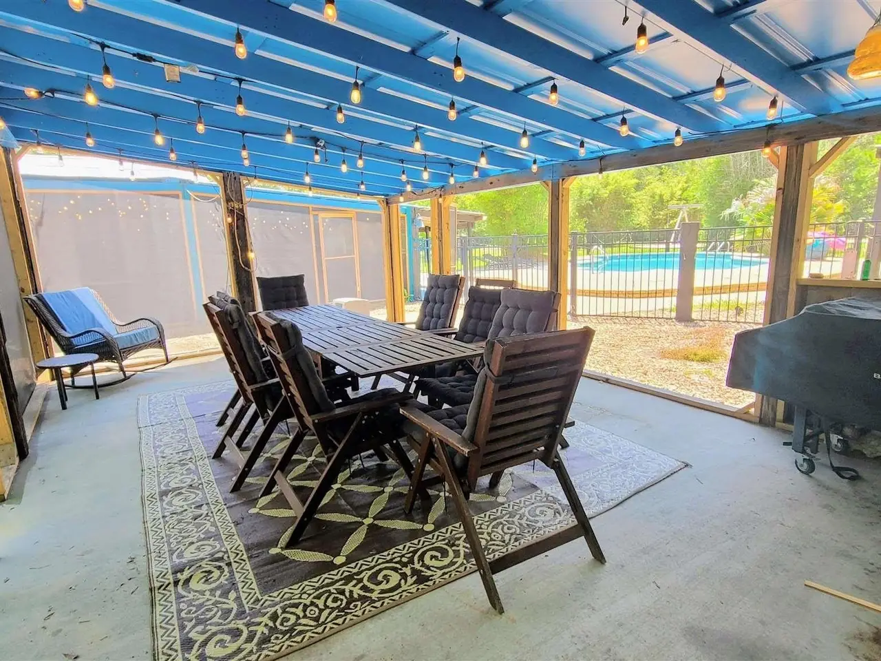 Screened pavilion with dining area