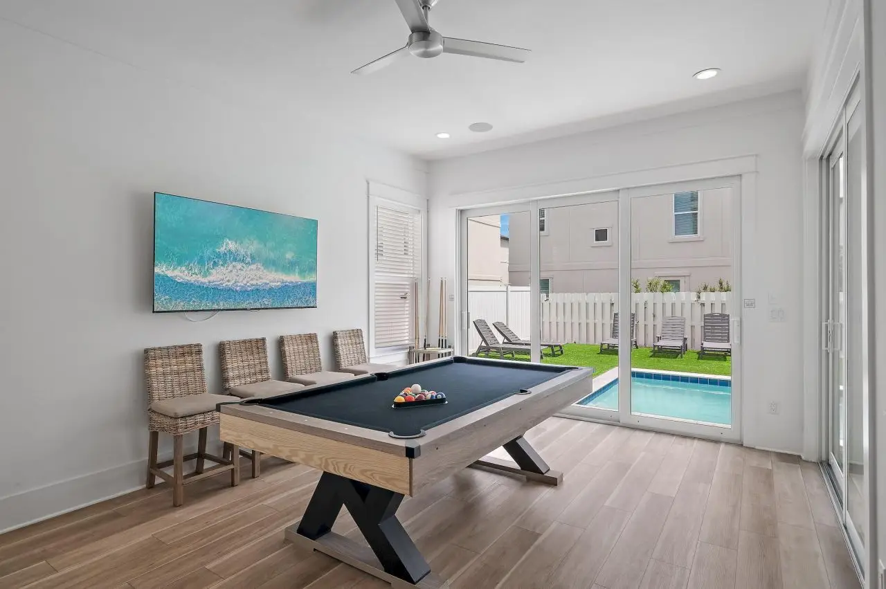 Tucked away in the Estates at Hidden Palms, this remarkable three-story home seamlessly combines opulence and comfort. Completed in 2022, this expansive residence features seven bedrooms and 6.5 bathrooms, complemented by a private pool. The house encompasses 4,100 square feet, imbuing the space with an inviting and radiant atmosphere. Outside, you'll find two one-car garages, a fenced backyard with a grill area, a glistening pool, and outdoor seating for sun-soaked relaxation. The covered patio beckons for al fresco dining and unwinding. Indoors, entertainment takes center stage with a game room featuring a mini fridge, icemaker, pool table, and entertainment system all conveniently adjacent to the pool.